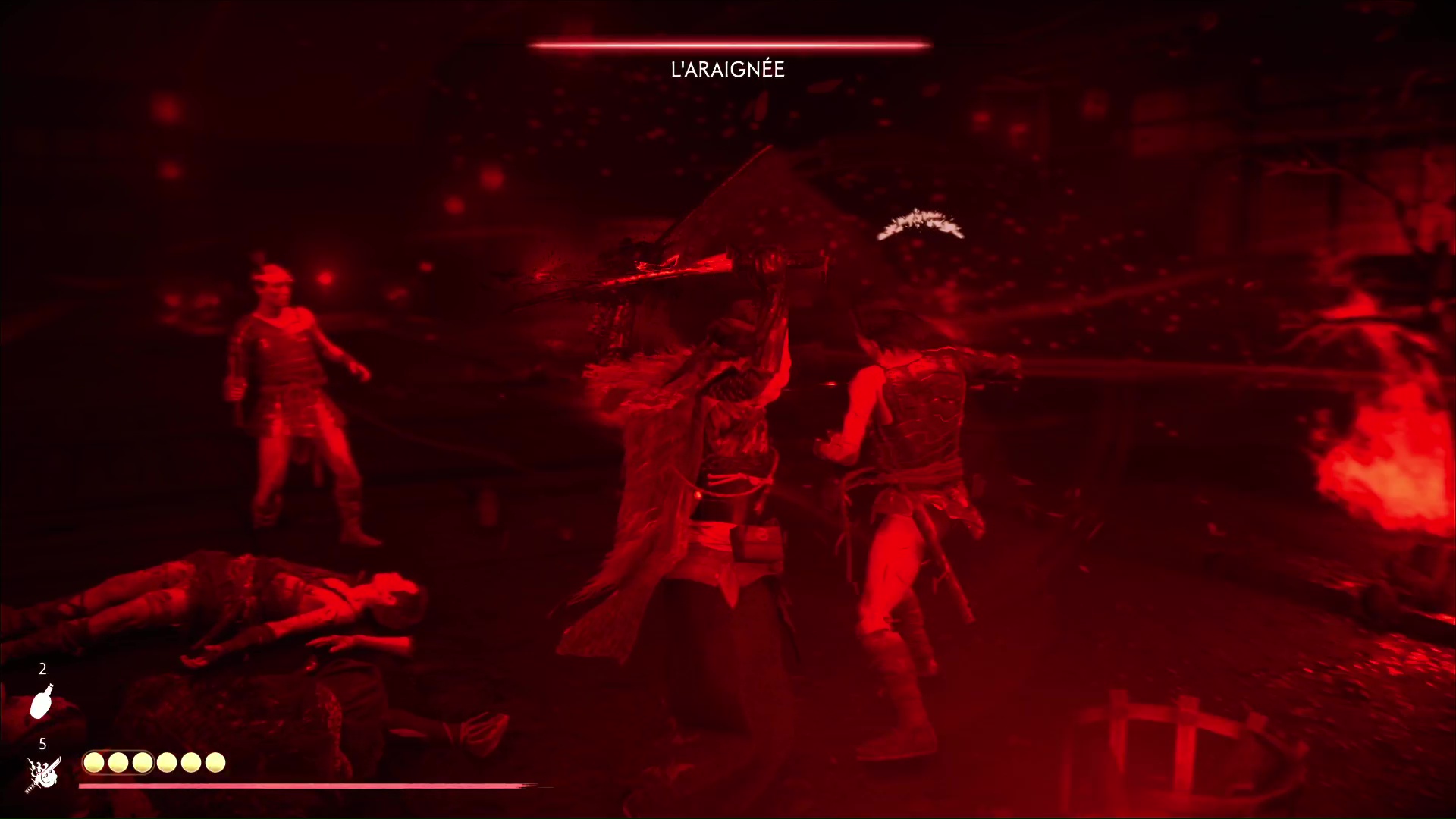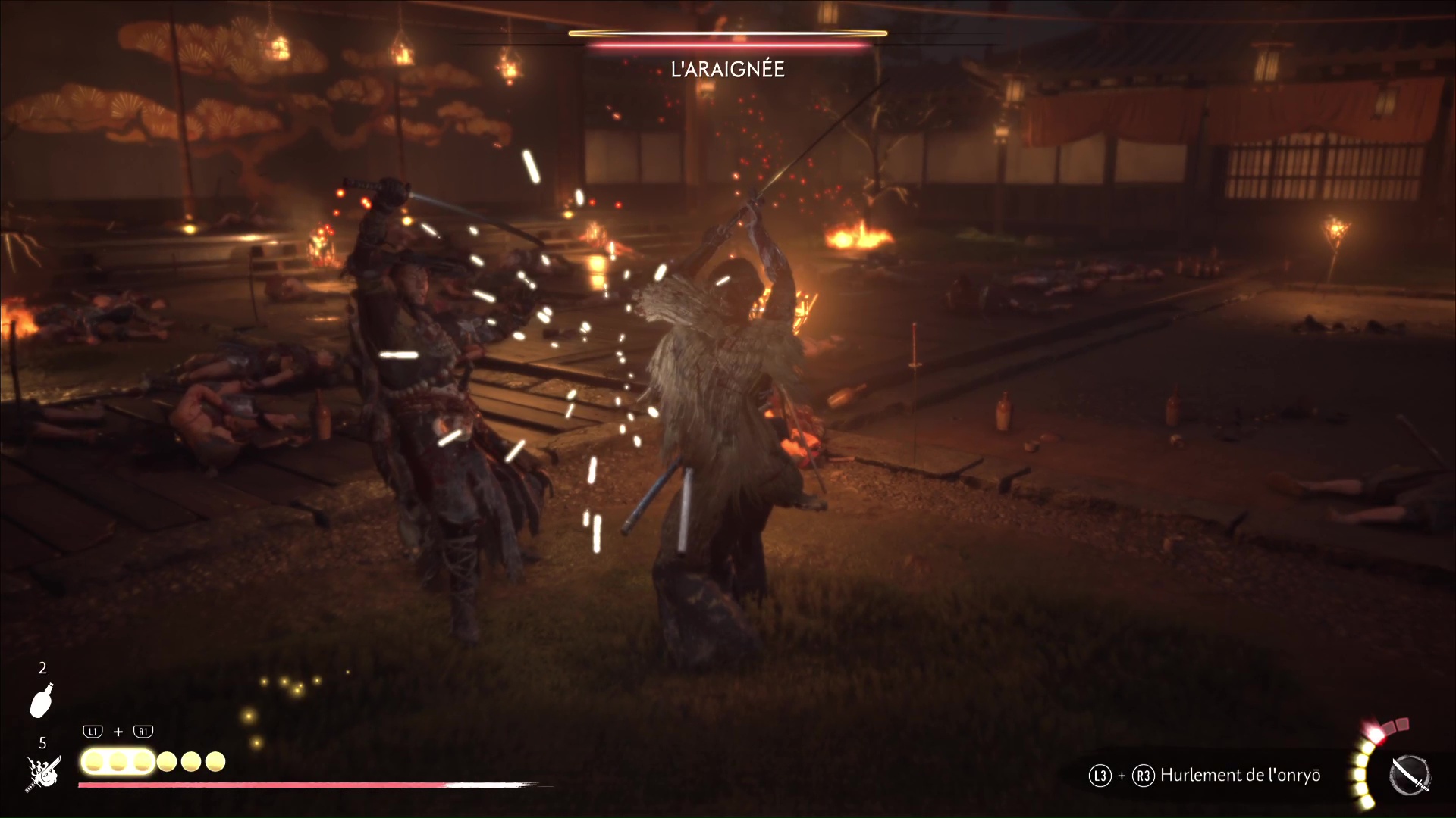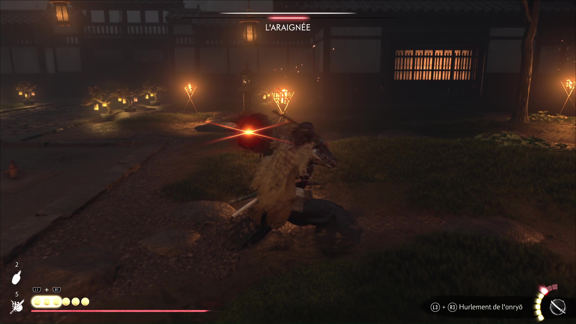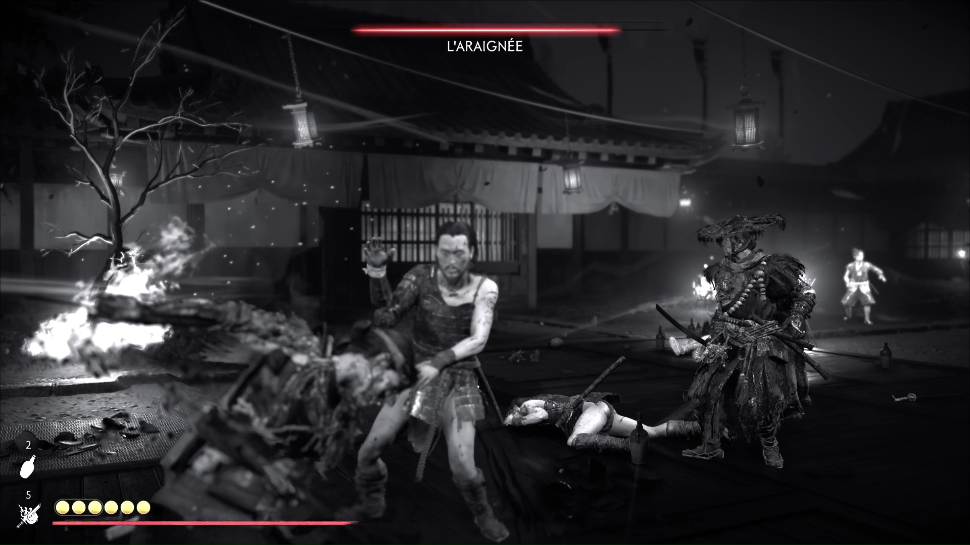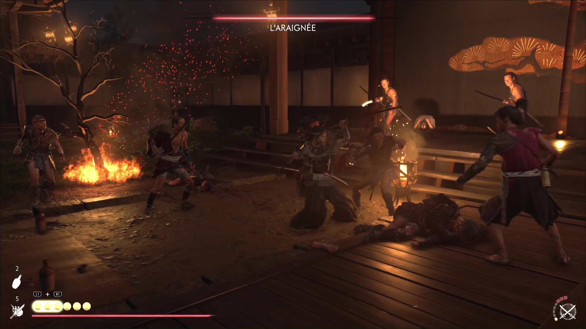 Tuer des ennemis sans se faire toucher fait donc monter cette jauge et il y a justement des sbires qui accompagnent l’Araignée. Si jamais vous arrivez à nouveau à utiliser une fois ou deux la posture de fantôme, n’hésitez surtout pas. Il y a énormément d’ennemis, mais rassurez-vous. Premièrement, il s’agit d’ennemis simples, sans protection particulière et uniquement un sabre. Deuxièmement, ils n’apparaissent pas à l’infini.