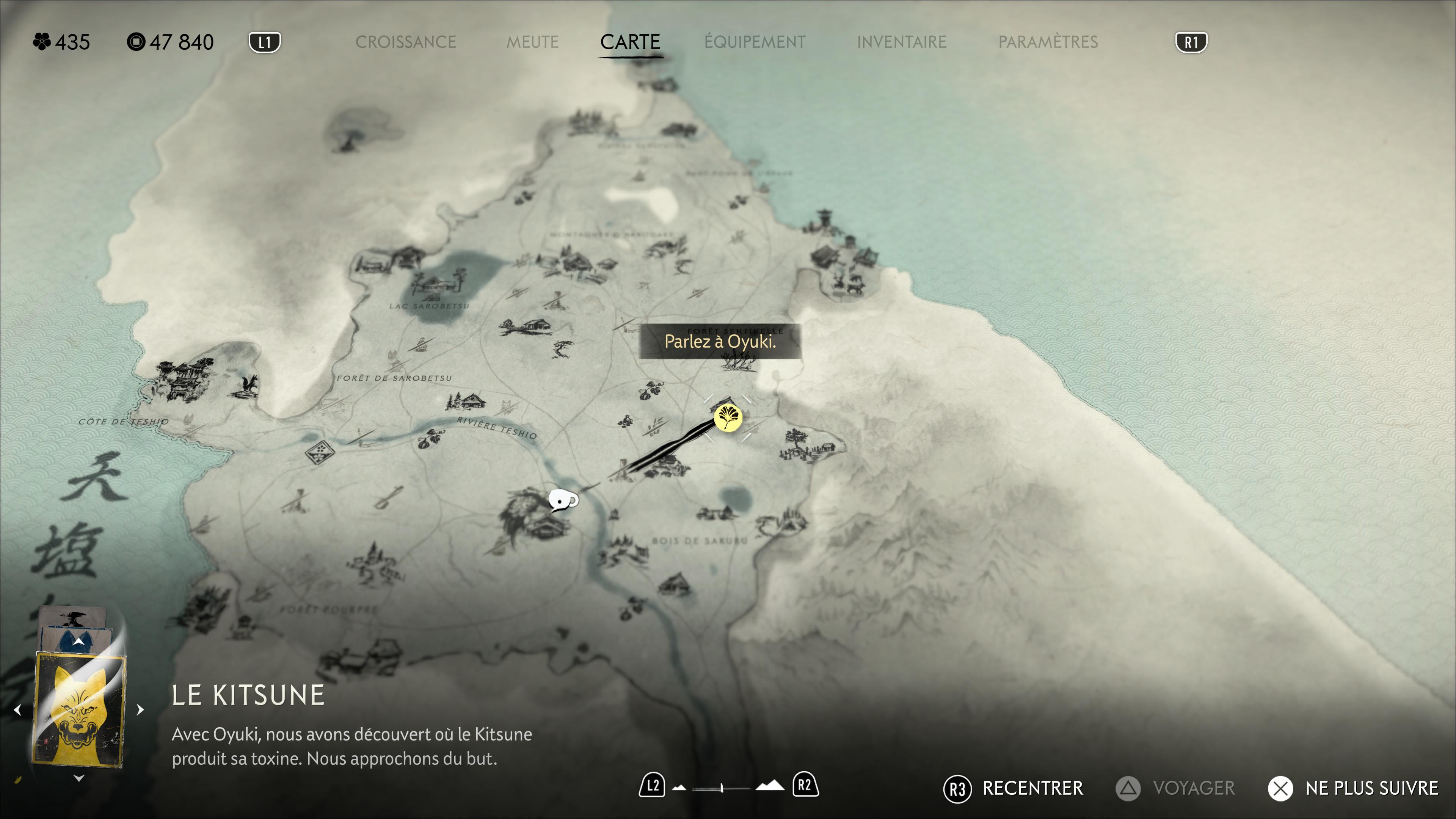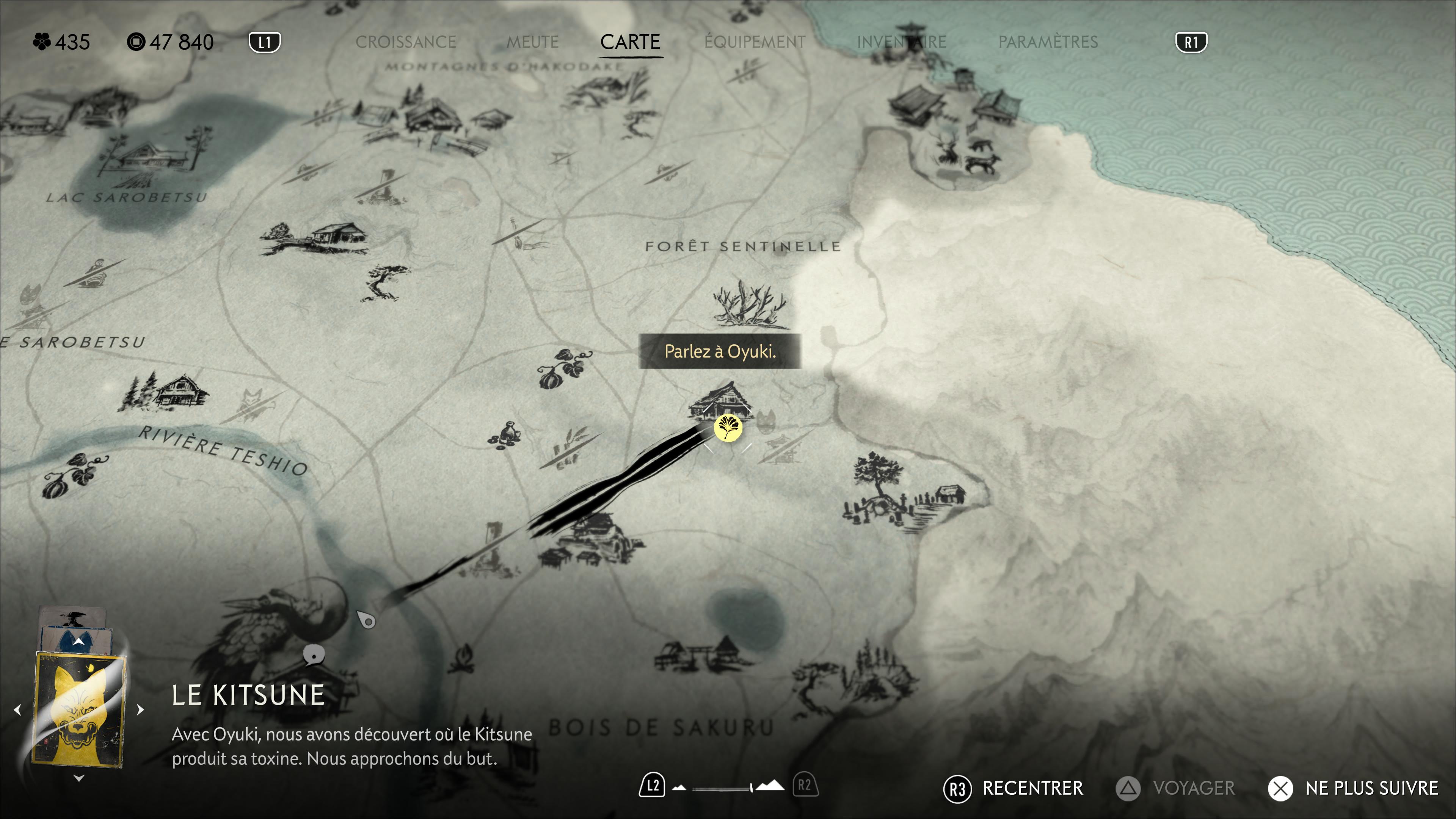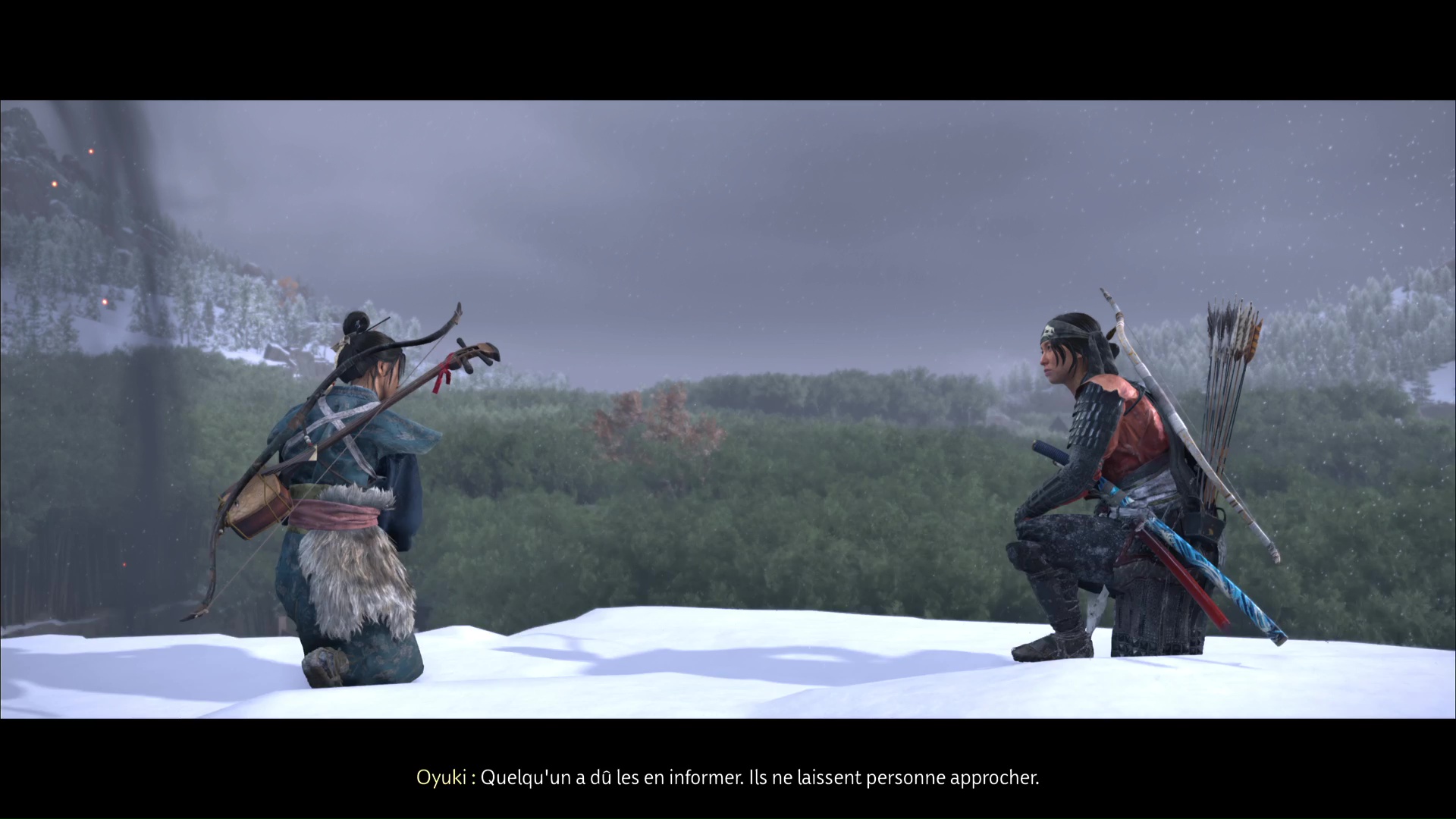 Les recherches progressent pour Atsu et Oyuki. L’exploration d’un repaire caché sous une teinturerie a permis à notre héroïne de libérer quelques prisonniers mais aussi de mettre la main sur un document important. Une liste cachée dans un casse-tête donne des informations au sujet du poison que le Kitsune utilise. Les ingrédients, d’une part, et le lieu de leur récolte, d’autre part, sont désormais connus. C’est là-bas que commence ce nouveau chapitre de l’histoire de Ghost of Yōtei.
