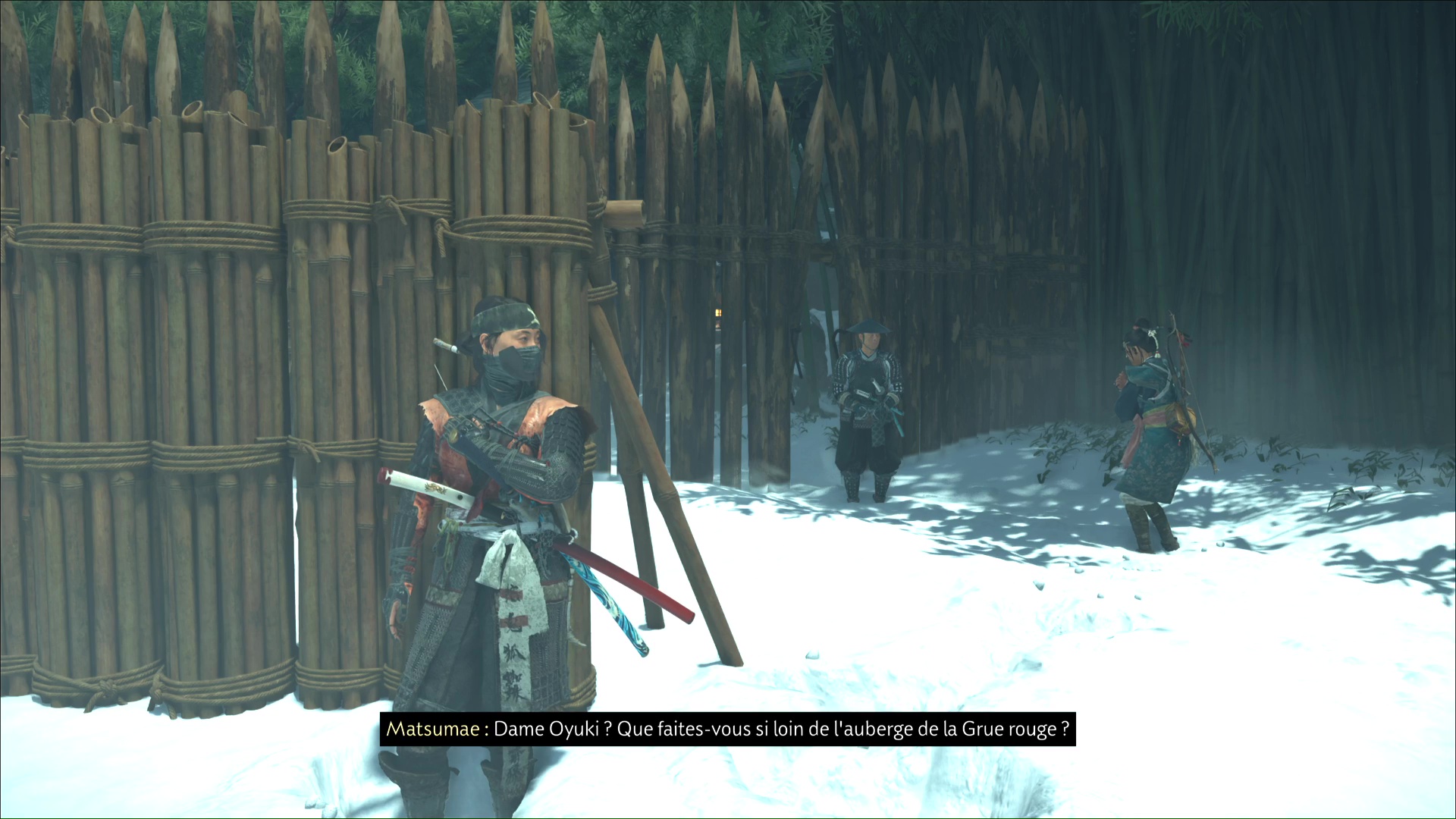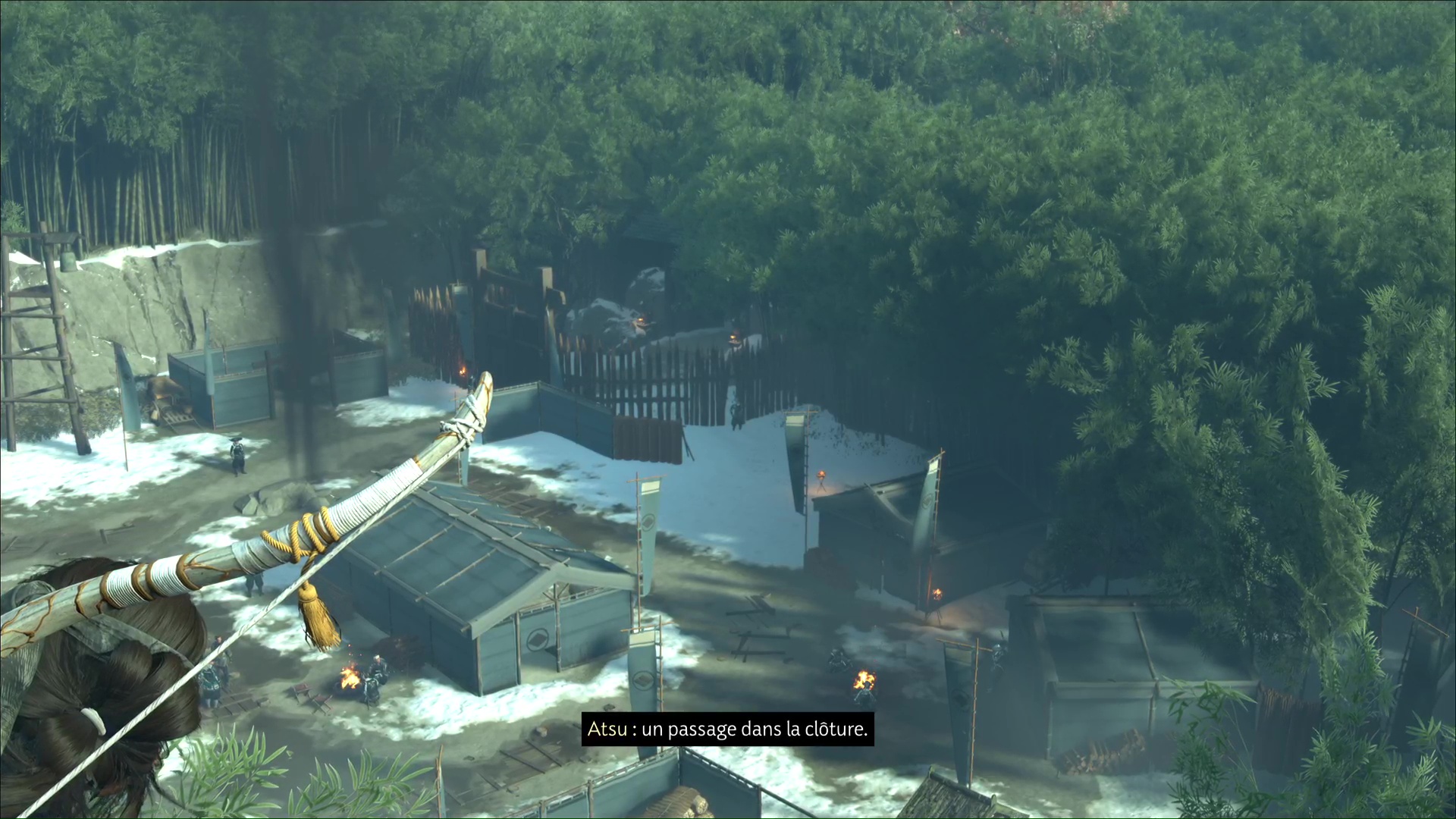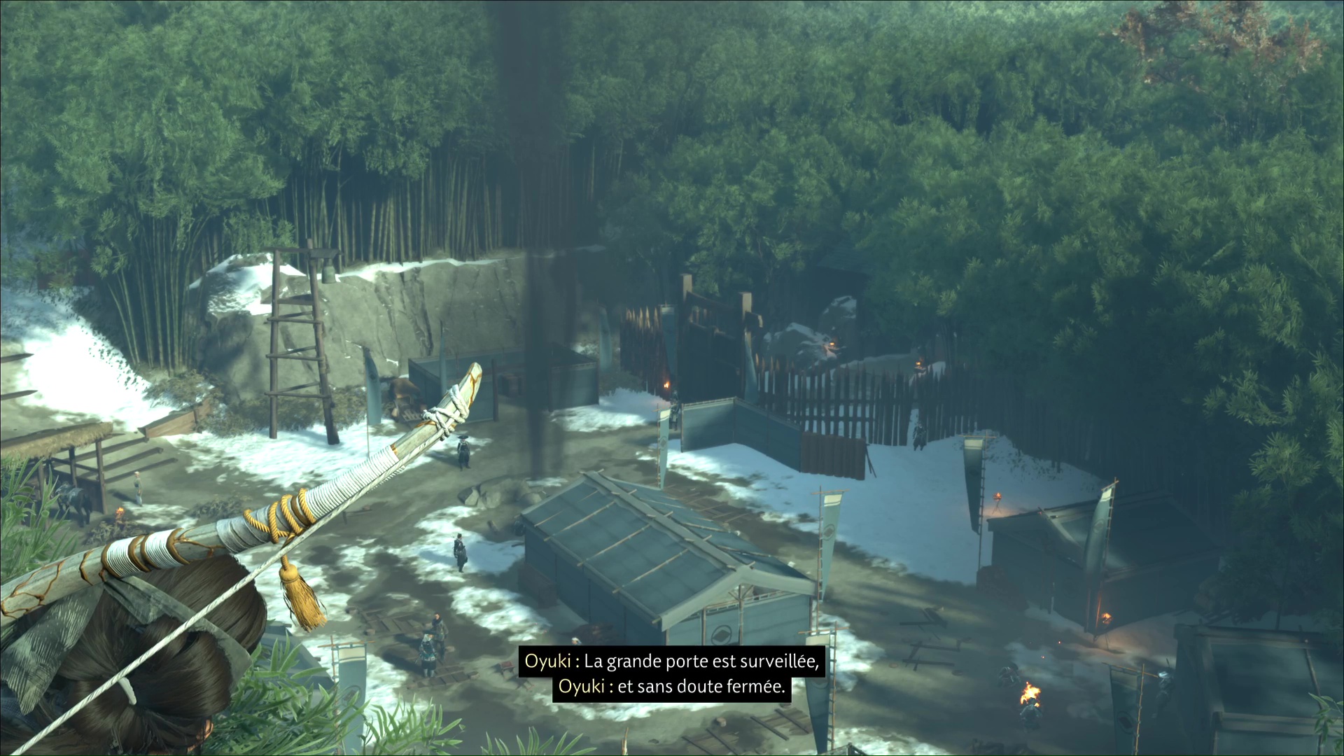 Vous voici parti vers le camp. Restez près d’Oyuki et suivez-la jusqu’au garde de la clôture. À partir de là, interagissez avec la barrière pour patienter, le temps que Oyuki fasse partir le garde.