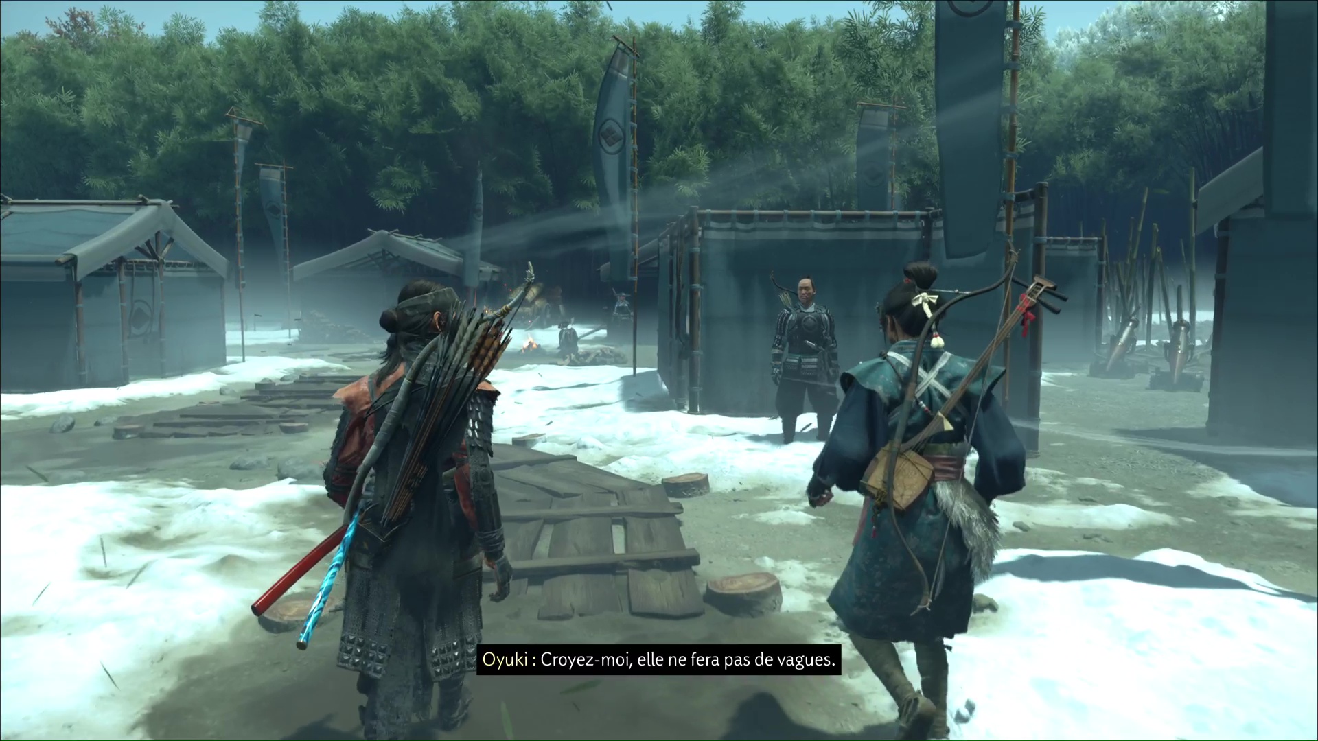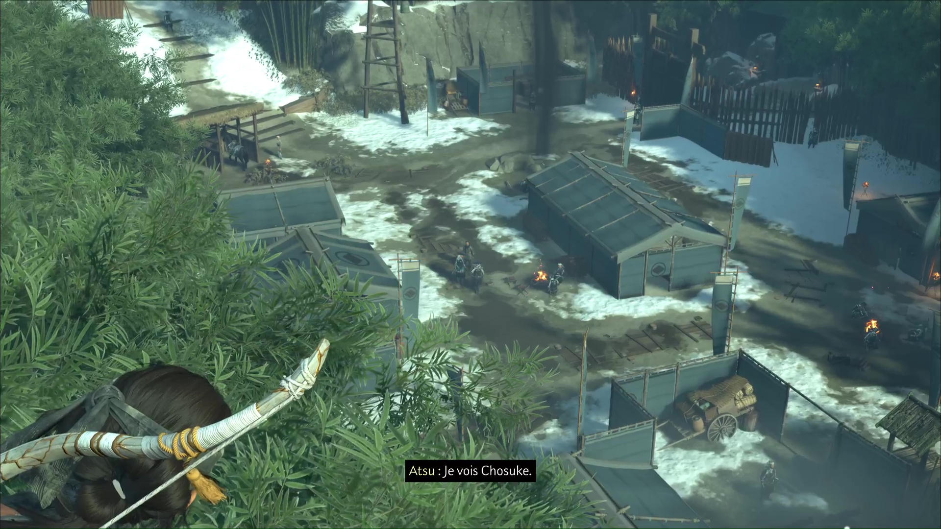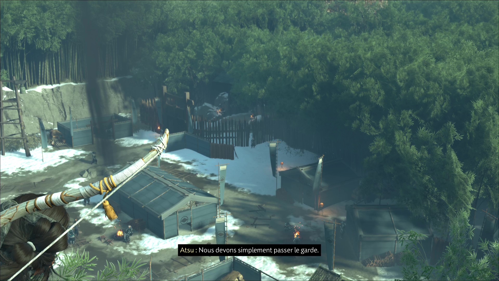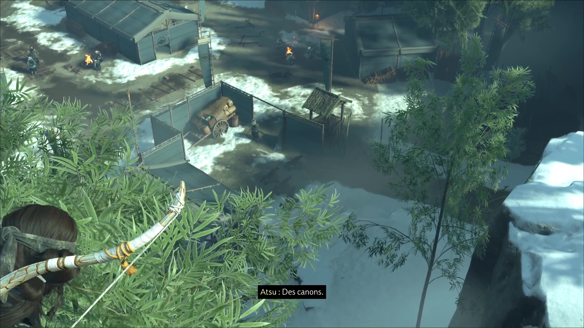 Sur place, Oyuki vous révèle que les Matsumae sont également sur la piste du Kitsune, ce qui complique un peu les choses. Observez le camp de samouraïs pour planifier votre approche. Jetez un oeil vers la gauche du camp pour apercevoir Chosuke. Puis, juste devant vous, regardez les canons.
