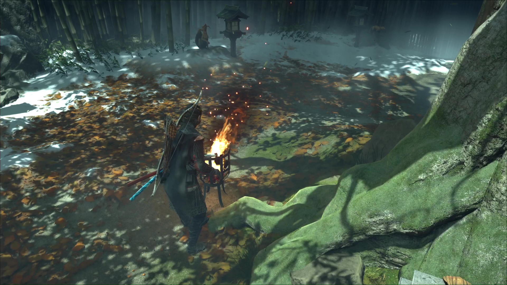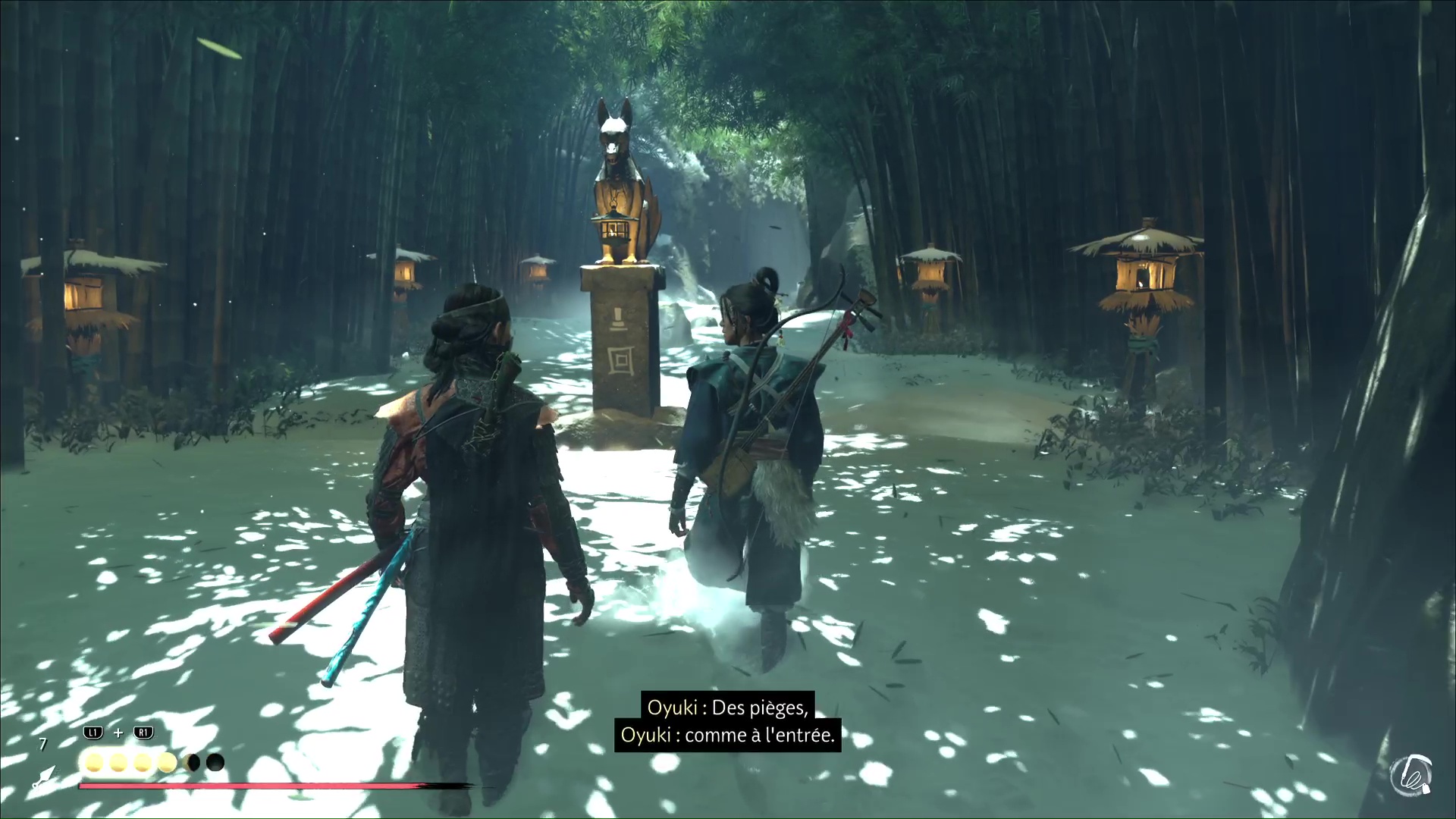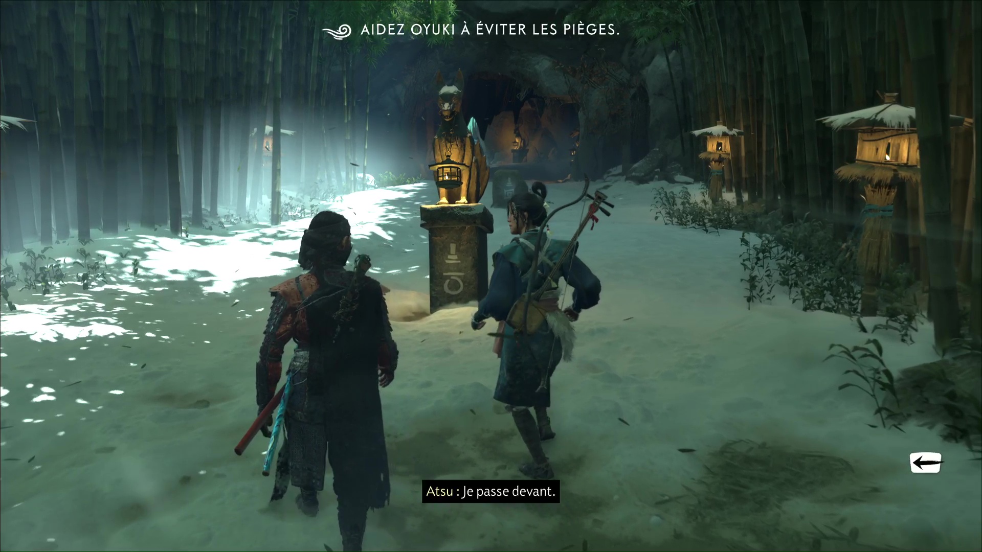 Interagissez avec le mécanisme de renard au bout du chemin pour ouvrir la porte de bambous juste à côté. Quelques mètres plus loin, une deuxième zone truffée de pièges vous attend. Cette fois, c’est vous qui devez ouvrir la marche.