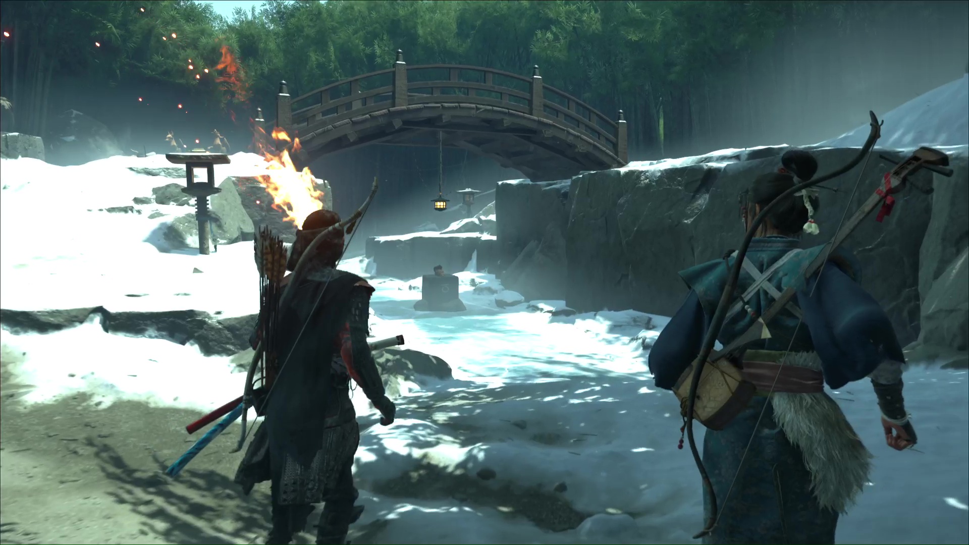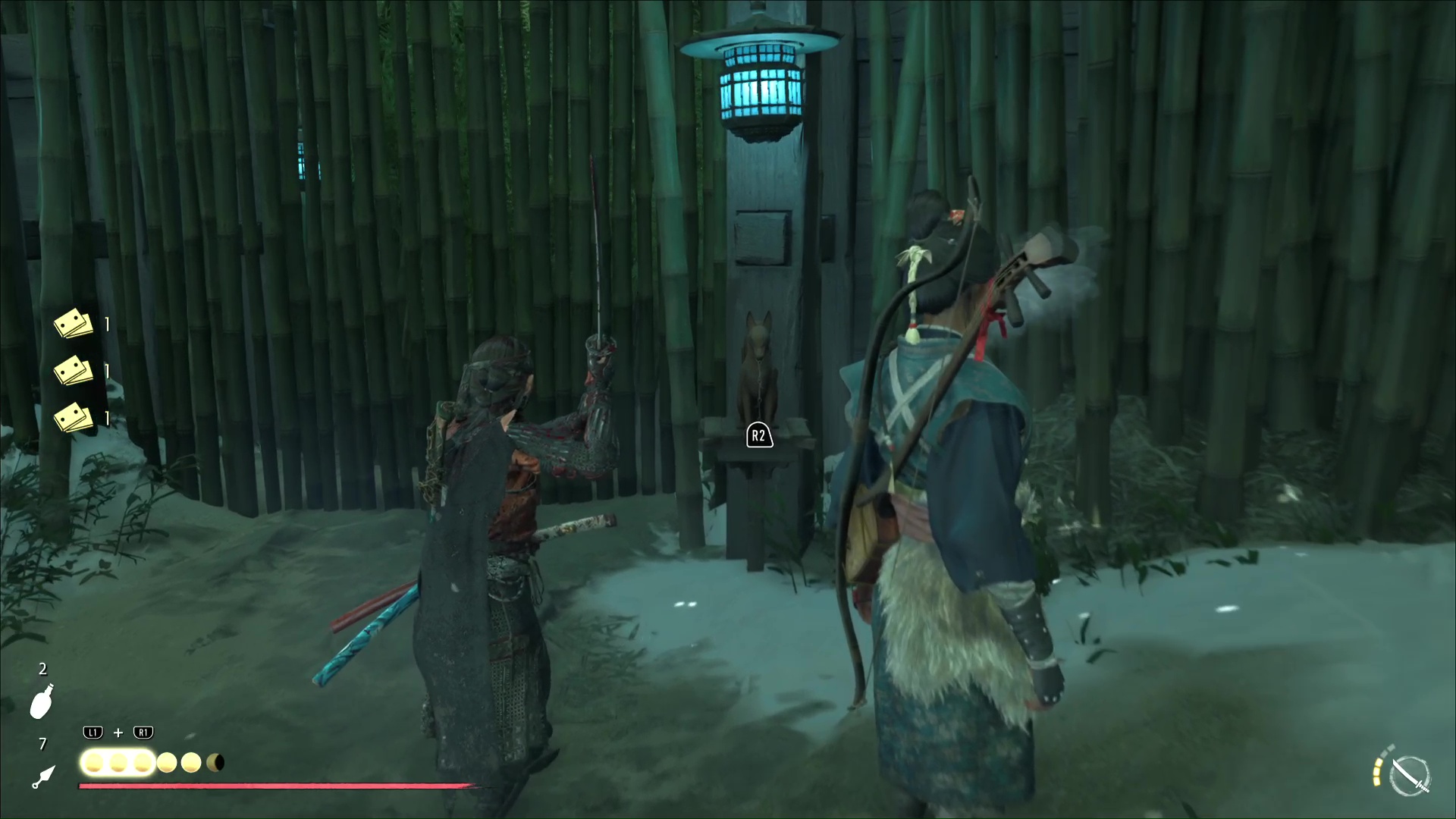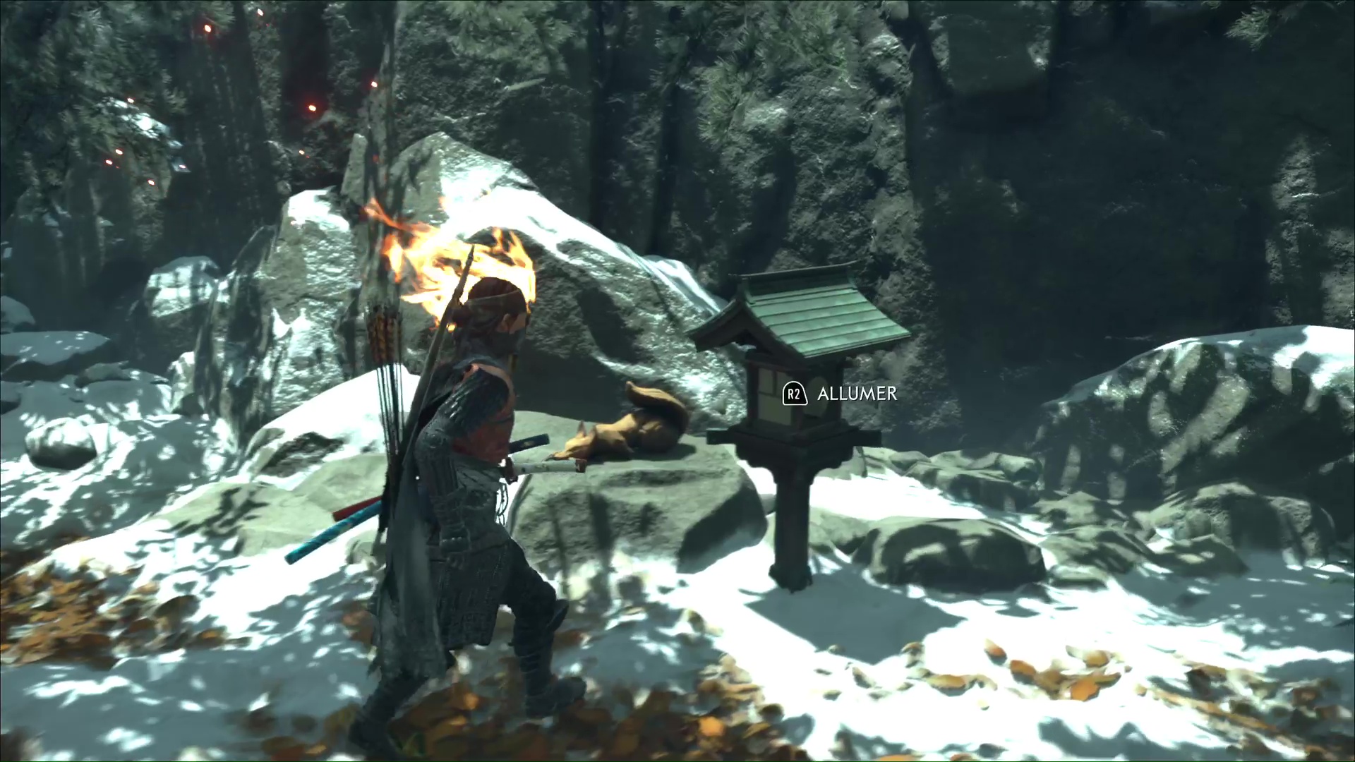 Poursuivez pour rejoindre, au bout de quelques pas, une nouvelle zone avec des statues de renard. Passez sous le pont et un groupe de Neuf-Queues vous attaquera. Attention à un lanceur de bombe et utilisez votre arme forte autant que possible.