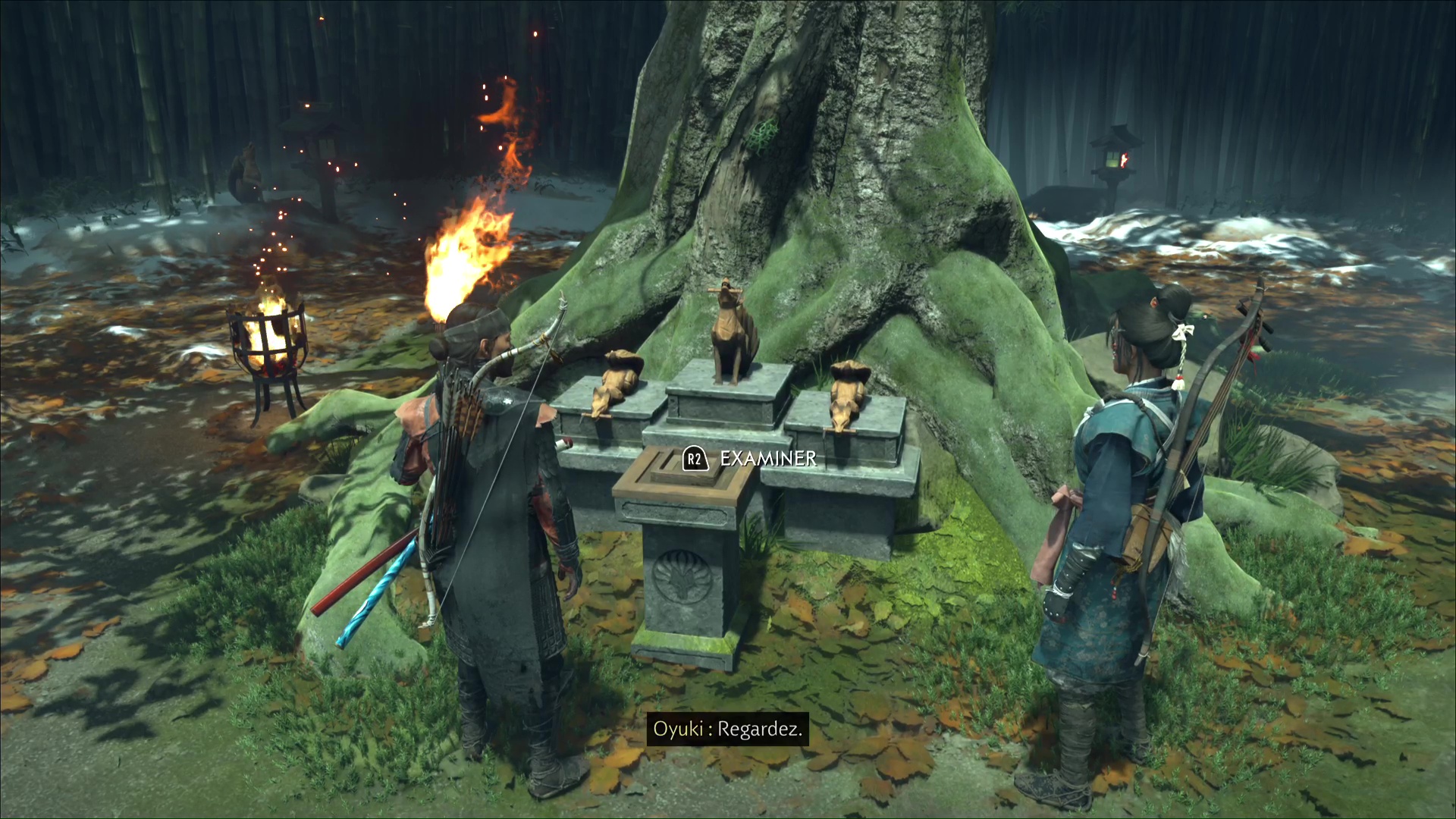 Dès que vous pouvez reprendre le contrôle d’Atsu, faufilez-vous dans l’ouverture de la clôture. Au bout de quelques pas, Oyuki parvient déjà à vous rejoindre. Entrez toutes les deux dans la forêt. Suivez le chemin truffé de pièges pour arriver à un arbre, avec à son pied un piédestal.