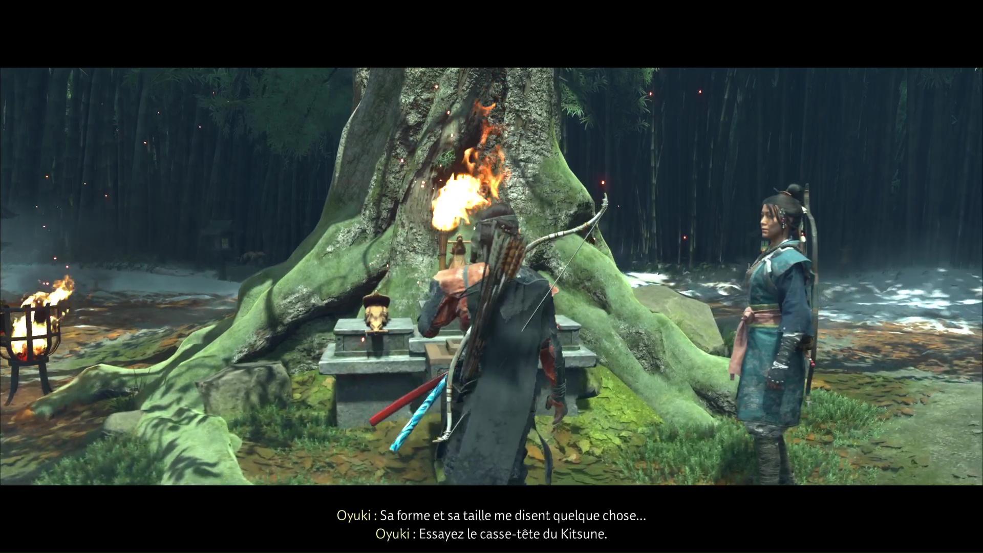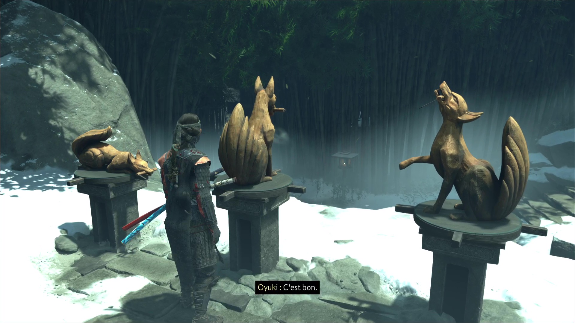 De l’autre côté, marchez tout en discutant avec Oyuki pour finir par arriver devant une troisième énigme. Celle-ci est toute simple : vous devez juste échanger les places des statuettes de renard posées sur des socles.