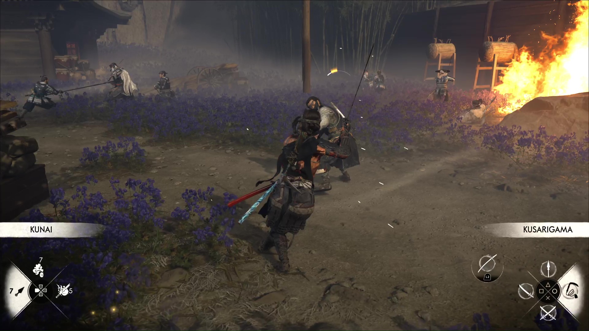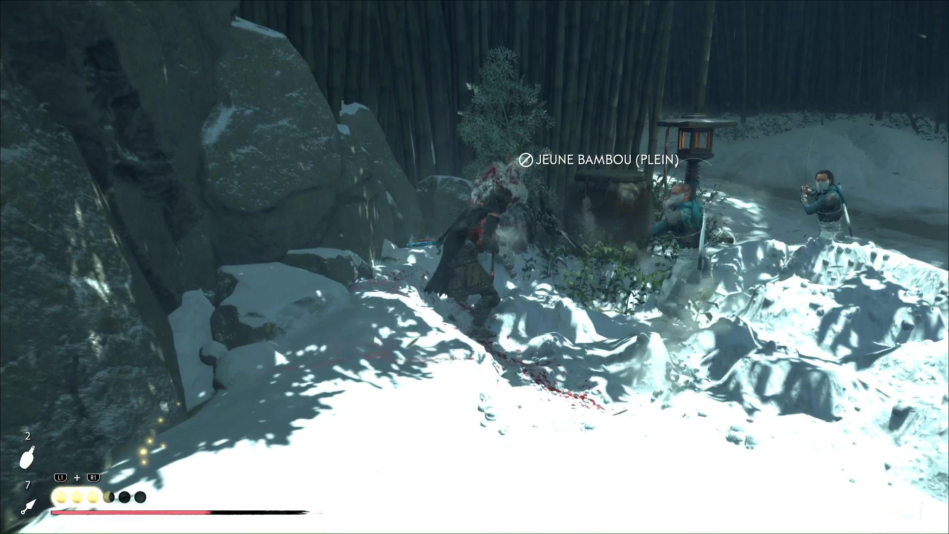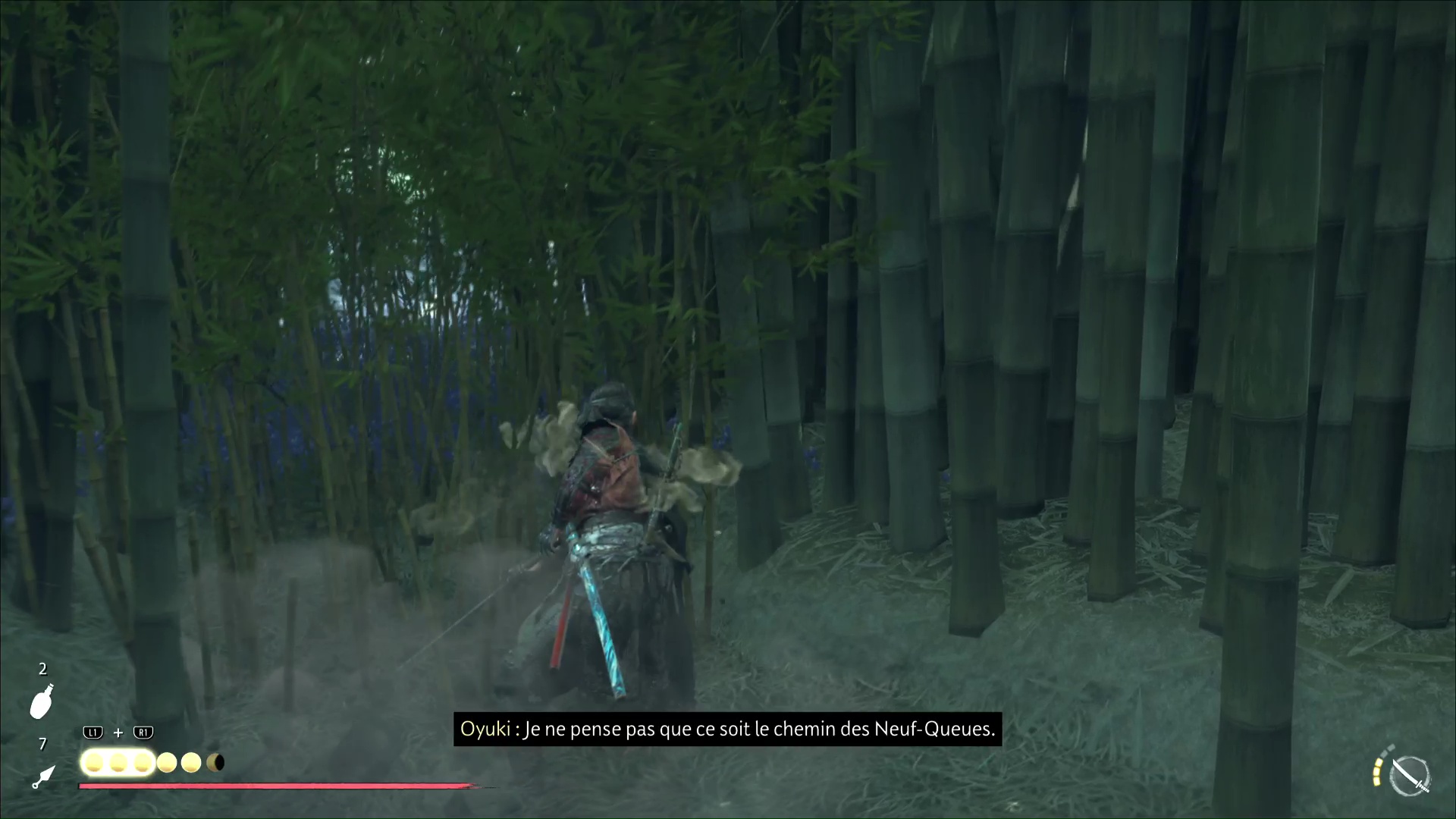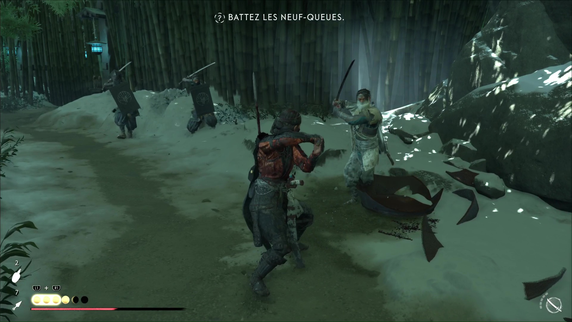 Dès que vous avez éliminé le dernier shinobi, reprenez votre route. Vous allez assez vite croiser des pots grossièrement posés sur le chemin. En s’approchant, de nouveaux Neuf-Queues en jaillissent. Sortez votre kusarigama pour briser le bouclier des deux shinobis qui en portent un, puis terminez le combat.