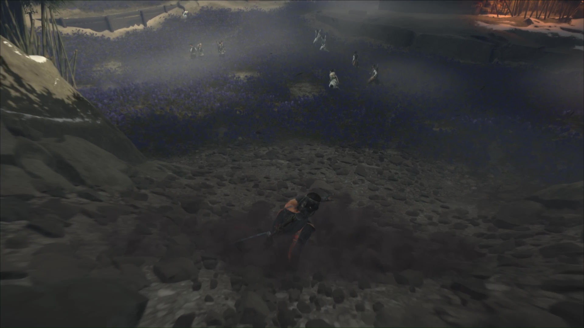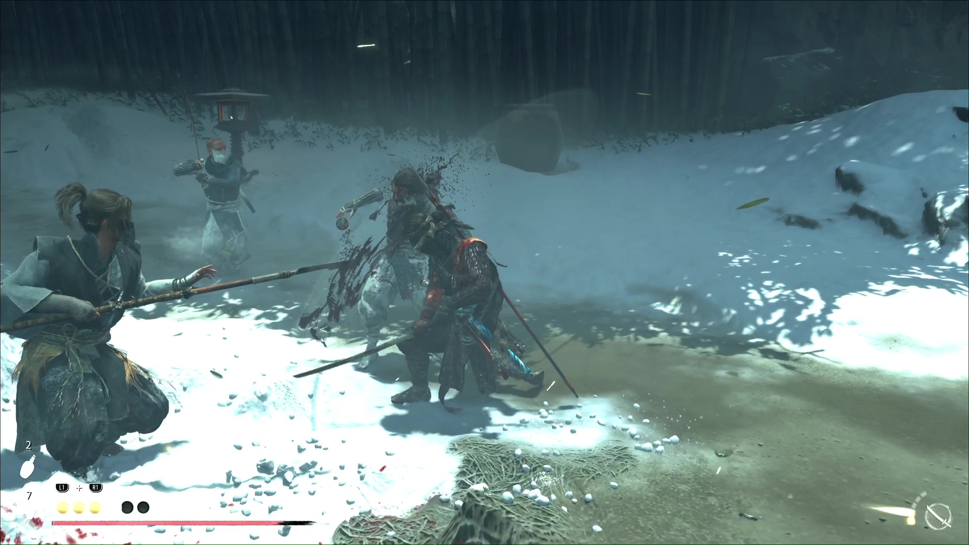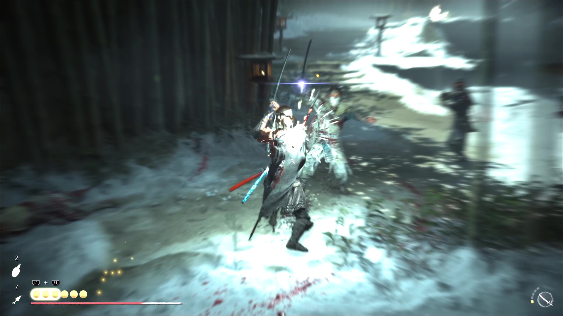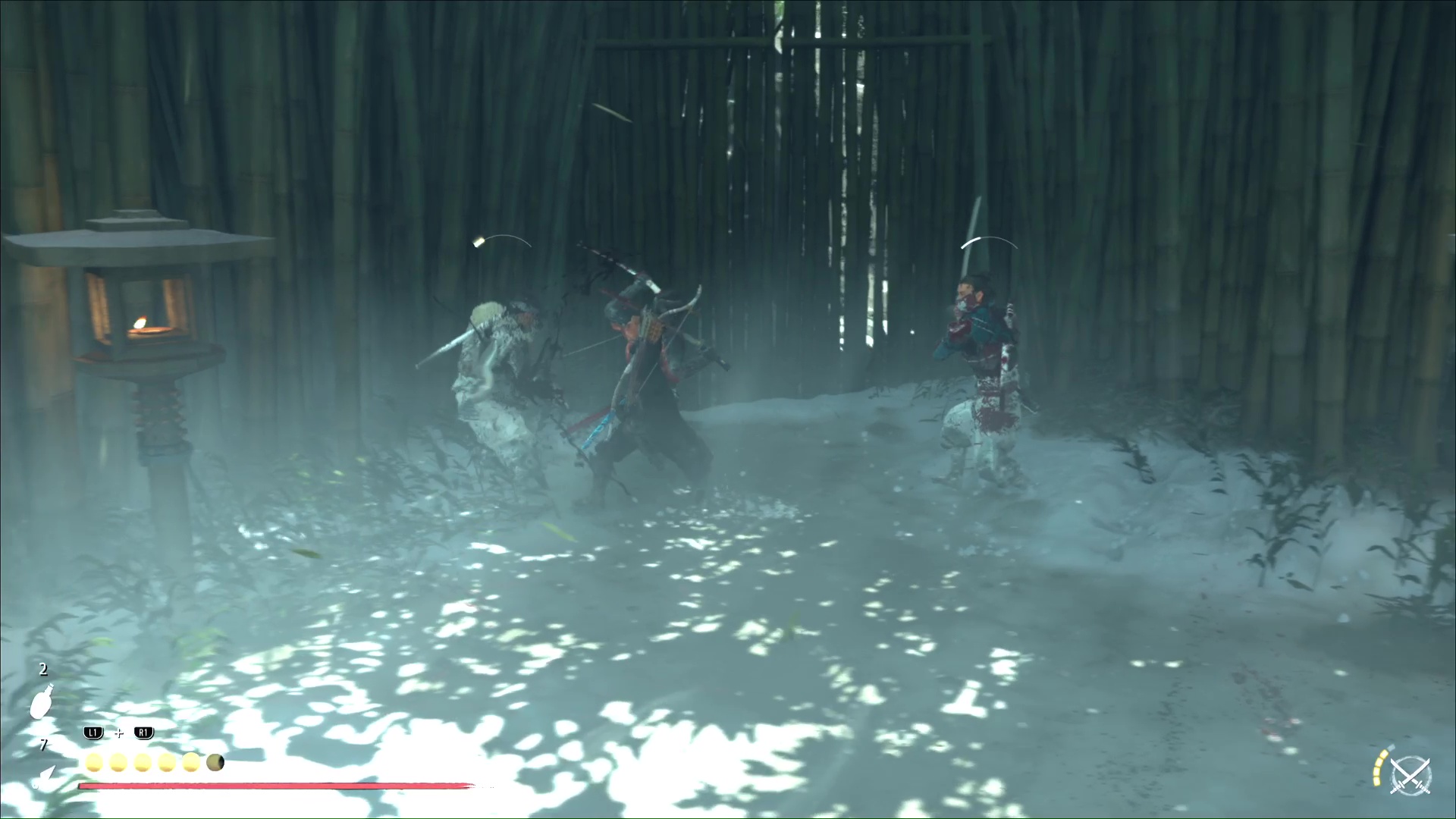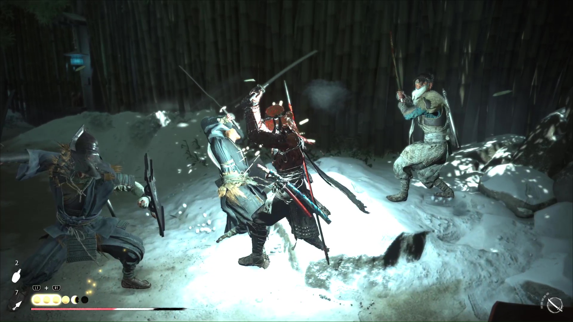 Dès que vous avez éliminé le dernier shinobi, reprenez votre route. Vous allez assez vite croiser des pots grossièrement posés sur le chemin. En s’approchant, de nouveaux Neuf-Queues en jaillissent. Sortez votre kusarigama pour briser le bouclier des deux shinobis qui en portent un, puis terminez le combat.