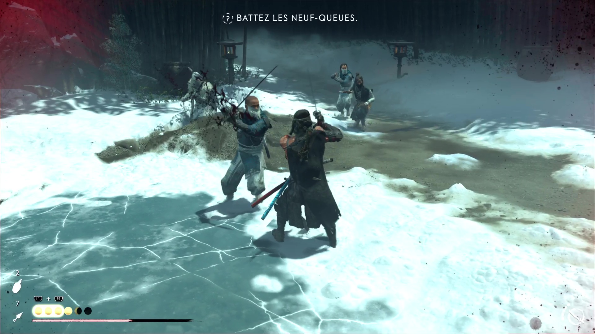 À peine les escaliers descendus, des Neuf-Queues surgissent. Tentez de vous débarrasser en priorité du porteur de kusarigama grâce à votre lance.