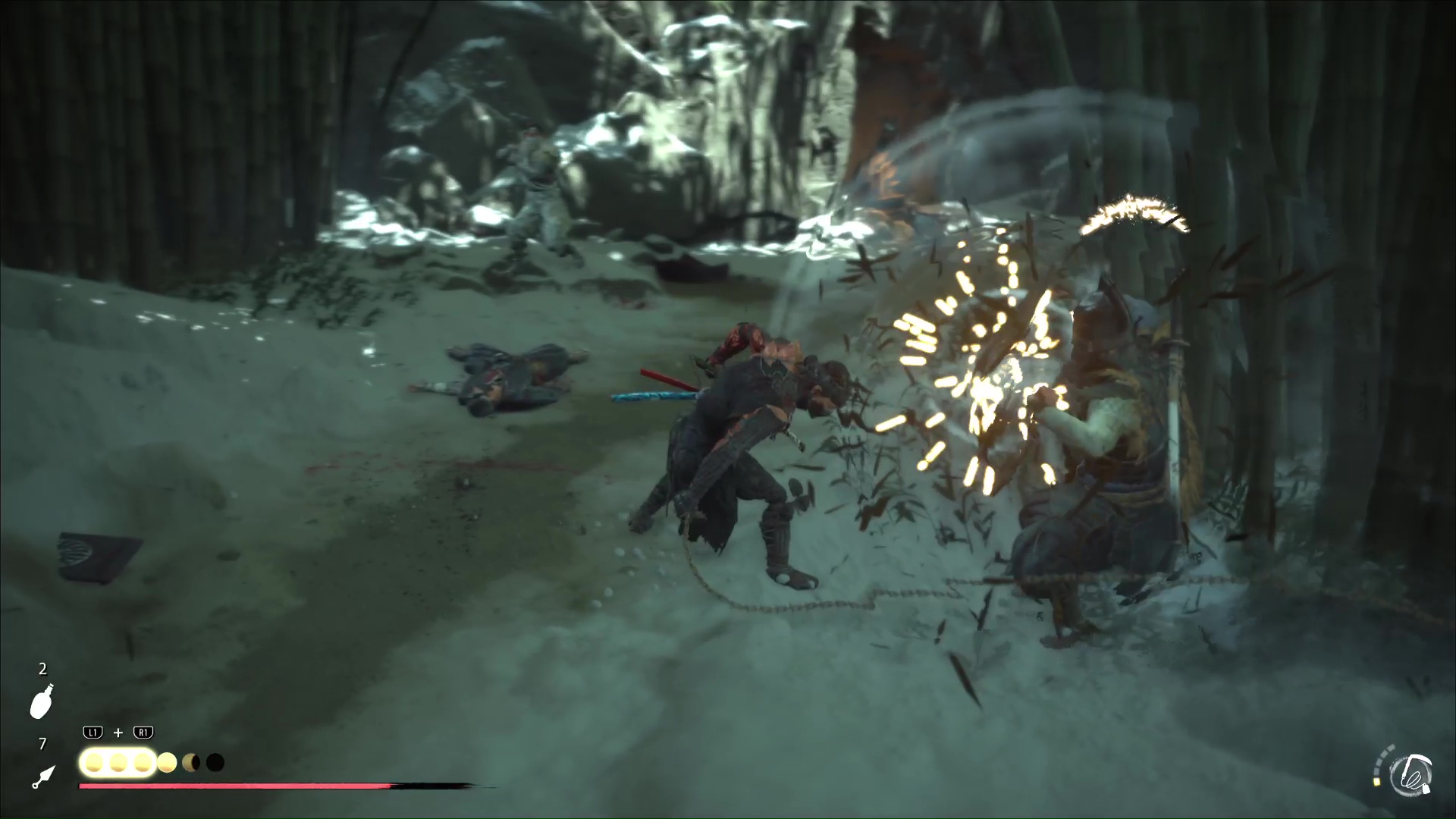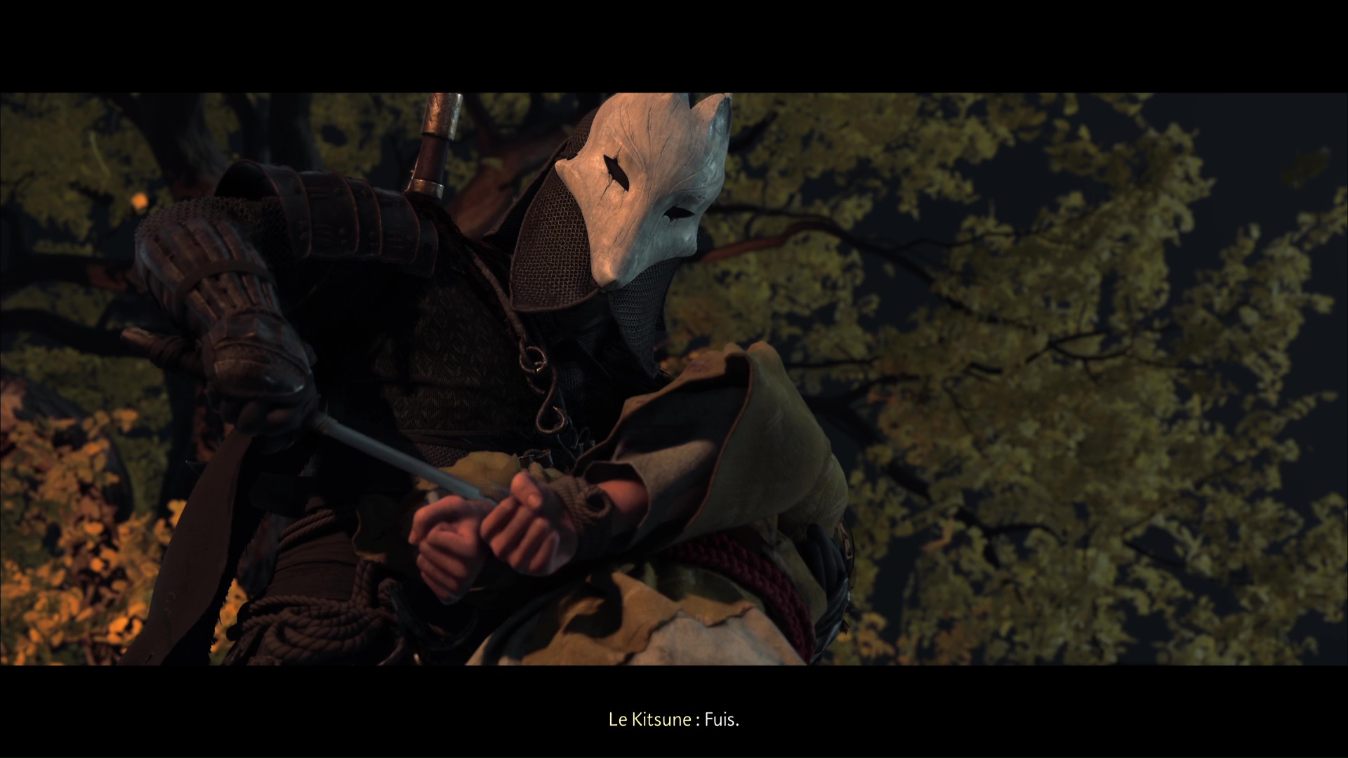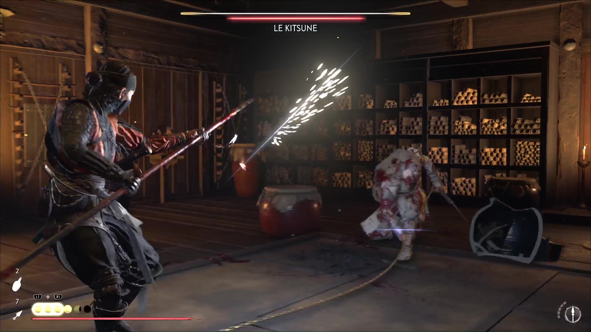 Le plus pénible, face à un kusarigama, reste les attaques avec la chaîne, qu’il est impossible de contrer parfaitement. Contentez-vous alors de les dévier ou les esquiver. Le Kitsune entreprendra des combos d’attaques bleues, que ce soit avec la faucille ou la chaîne. Et quand il s’agit de la chaîne, il termine avec une attaque rouge. Soyez donc prompt à esquiver.