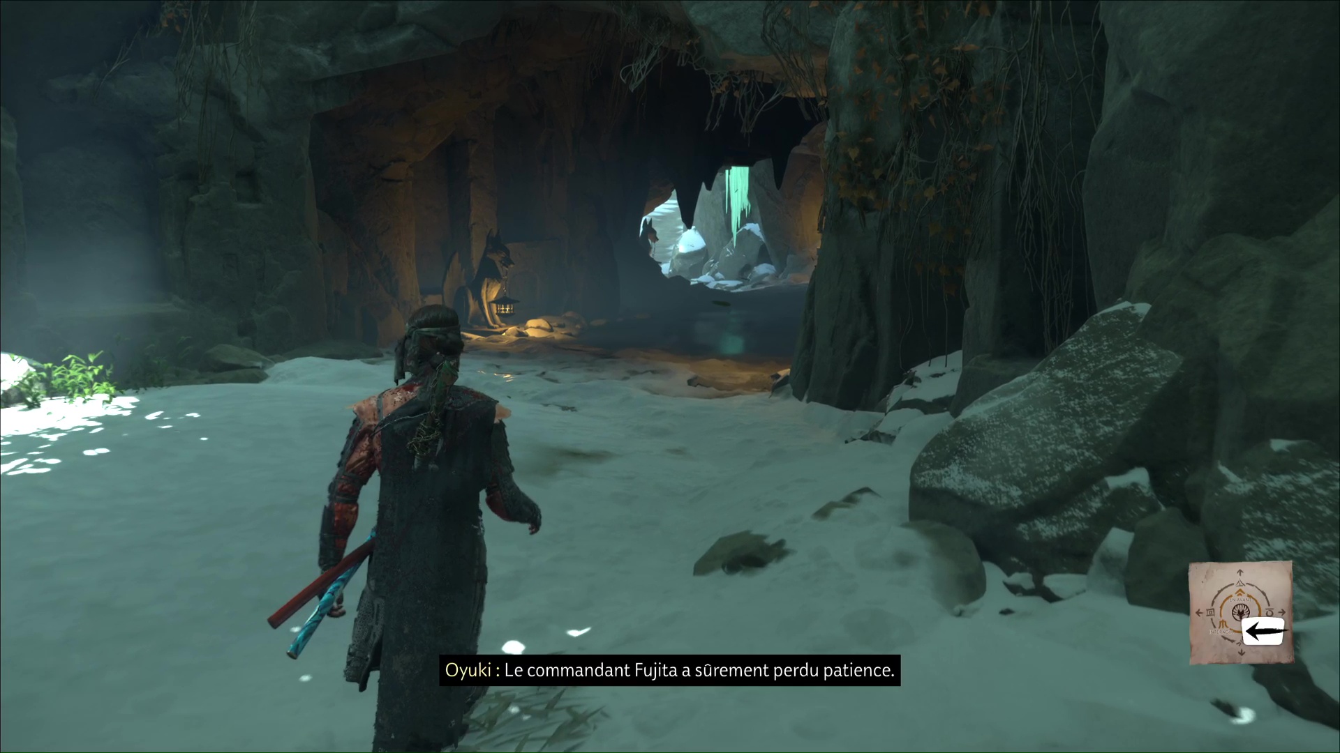 Oyuki va vous montrer le chemin, vous n’avez qu’à la suivre. Au bout du chemin, rampez à travers l’ouverture au niveau du sol.