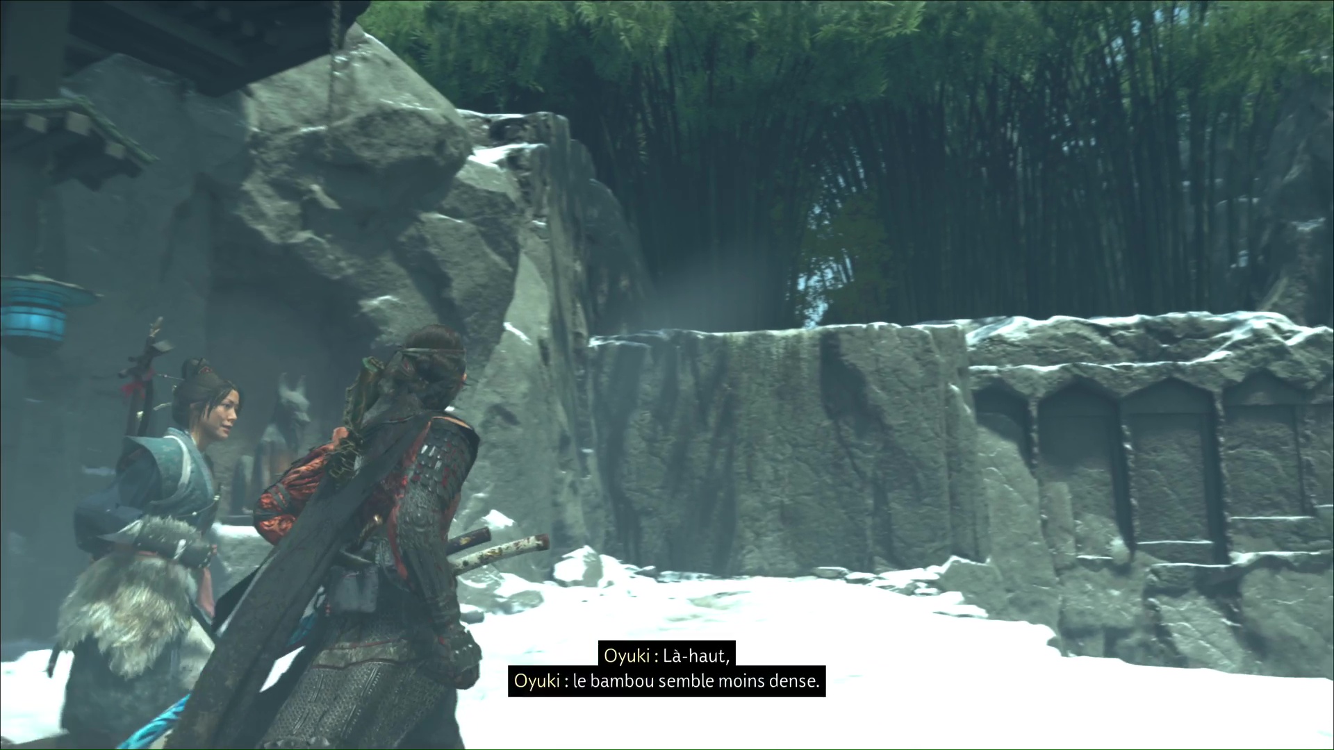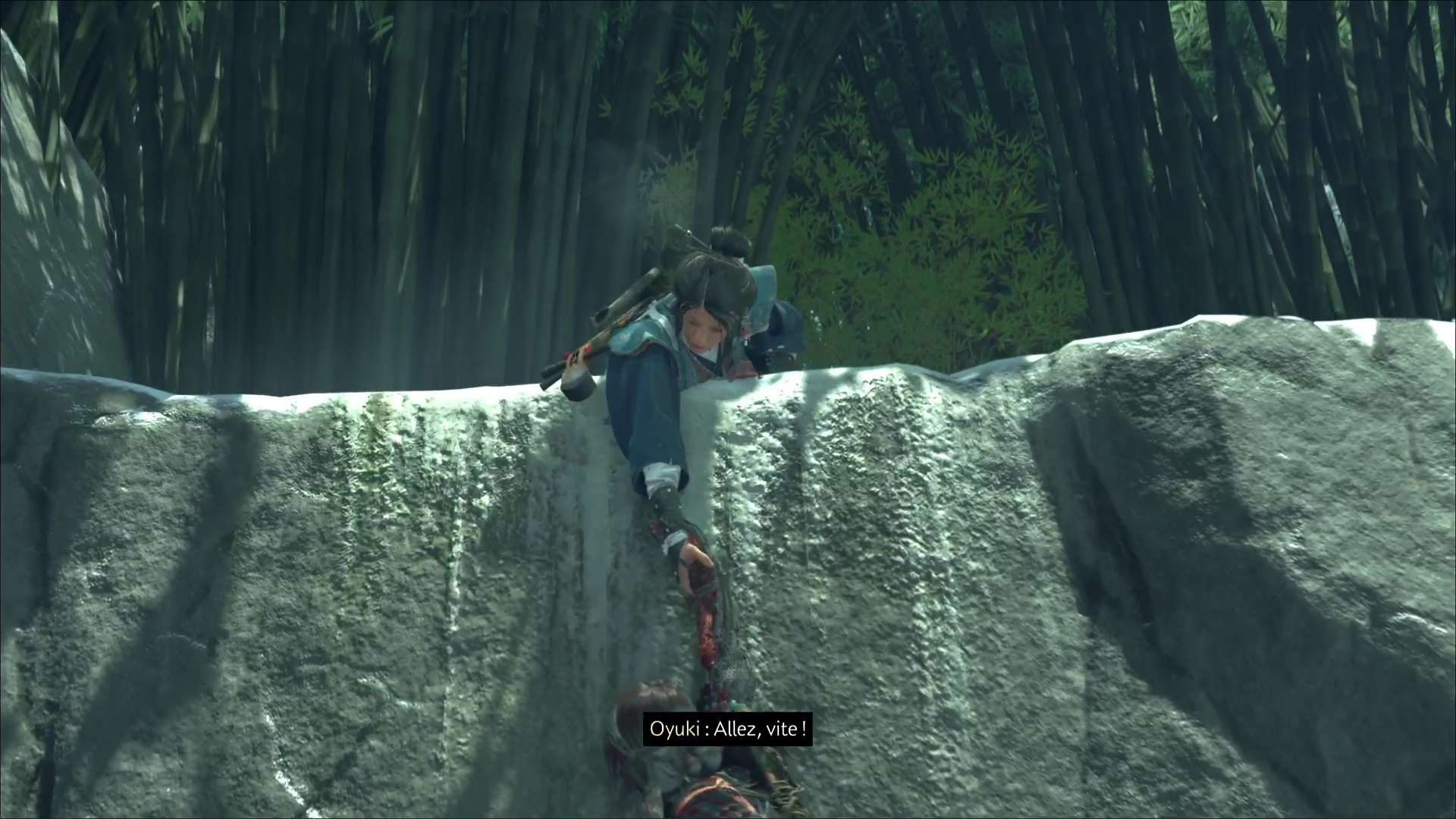 Tournez la tête à droite, un passage s’offre à vous. Placez-vous au pied de la paroi pour propulser Oyuki, avant que celle-ci ne vous hisse à votre tour. En haut, coupez le bambou pour passer de l’autre côté.