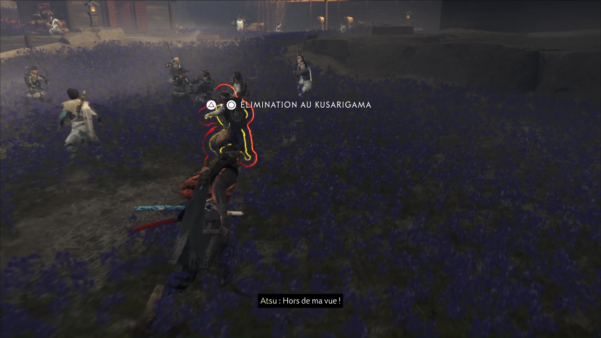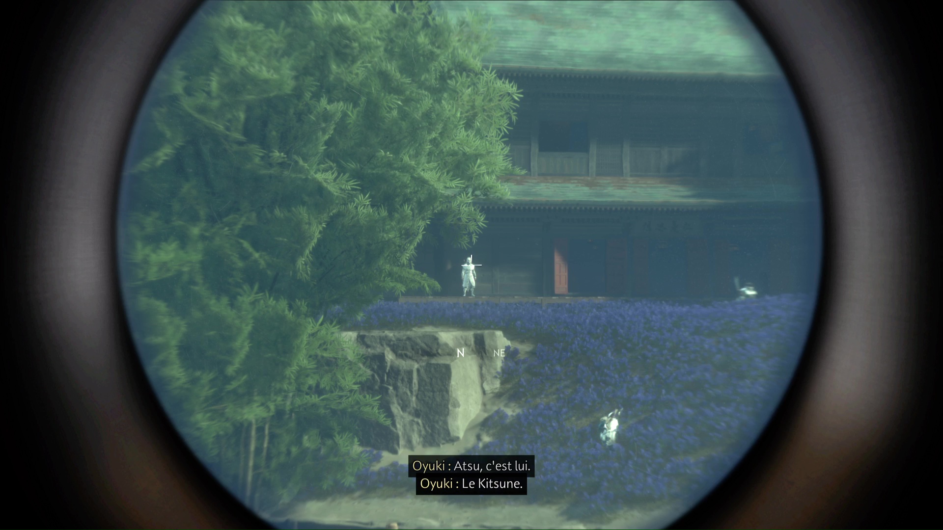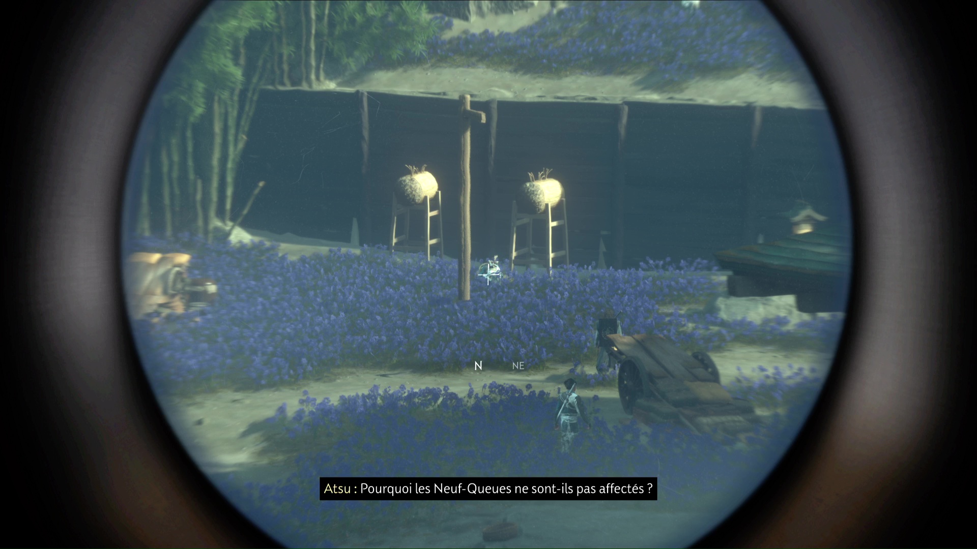 Atsu sort sa longue-vue pour faire un peu de repérage. Examinez le champ de fleurs devant vous. Levez la tête et jetez un œil vers les Neuf-Queues. Enfin, devant le bâtiment au loin, vous apercevrez le Kitsune lui-même.