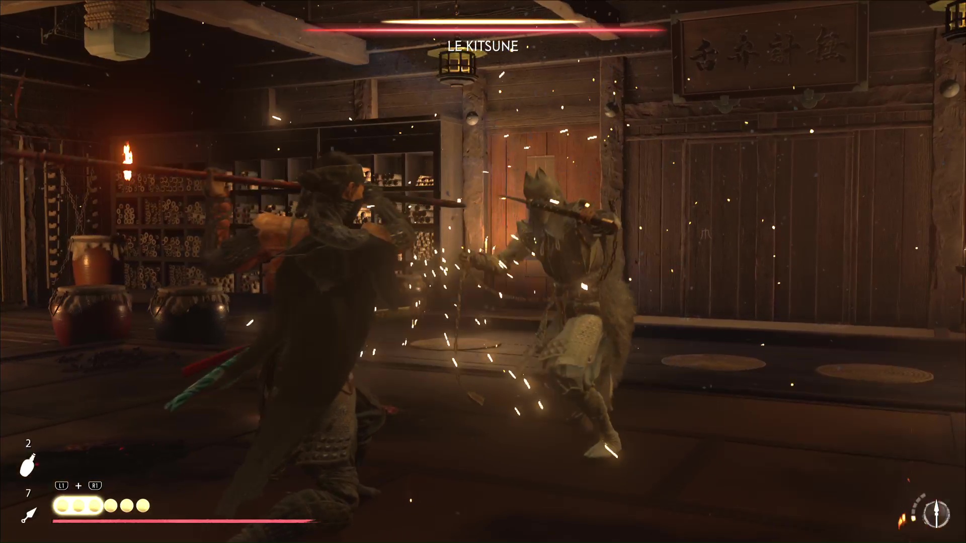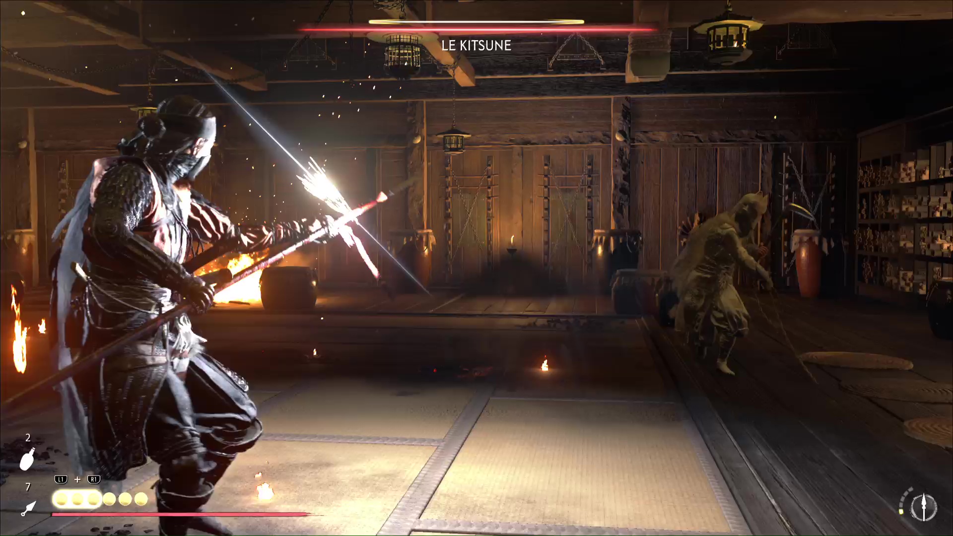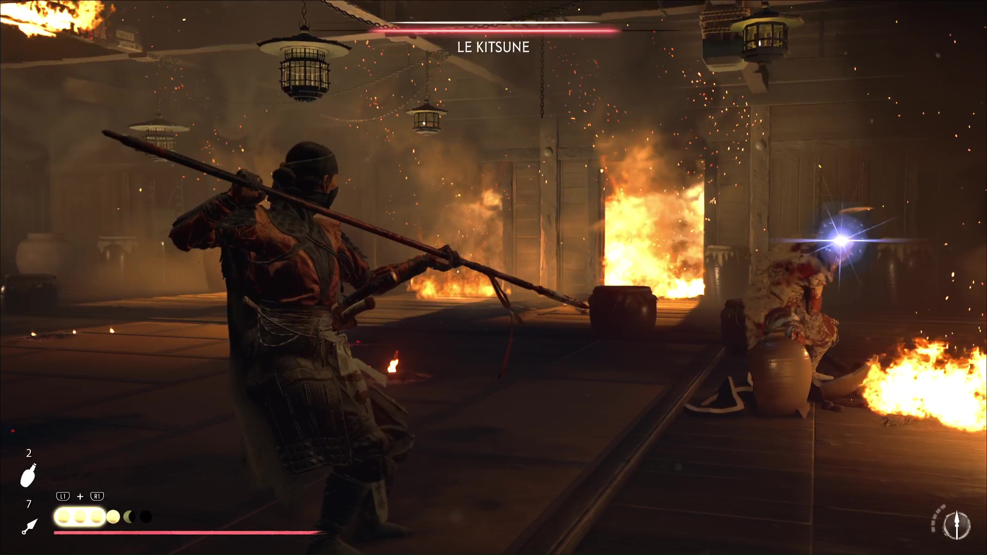 Entrez dans le bâtiment et le Kitsune sera encore là. Atsu mentionne donc la nuit meurtrière à laquelle le Kitsune a pris part, ce qui lance le combat. Votre ennemi se bat au kusarigama, donc sortez votre lance, si vous la possédez.