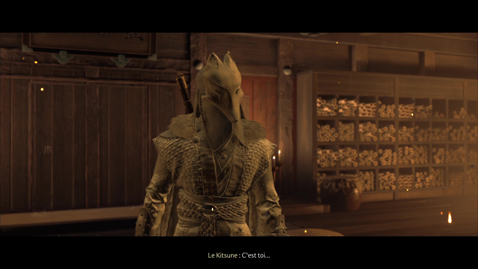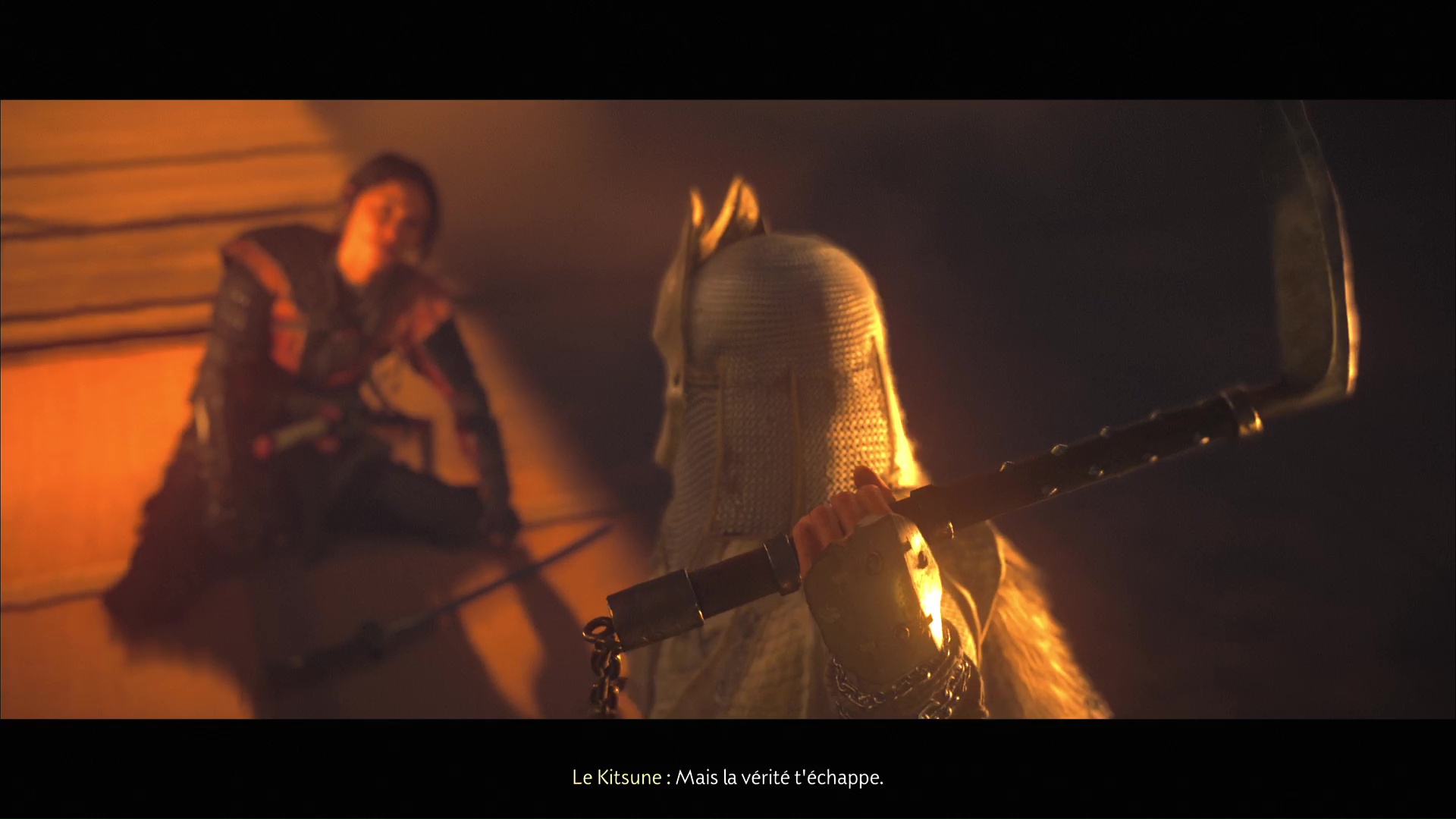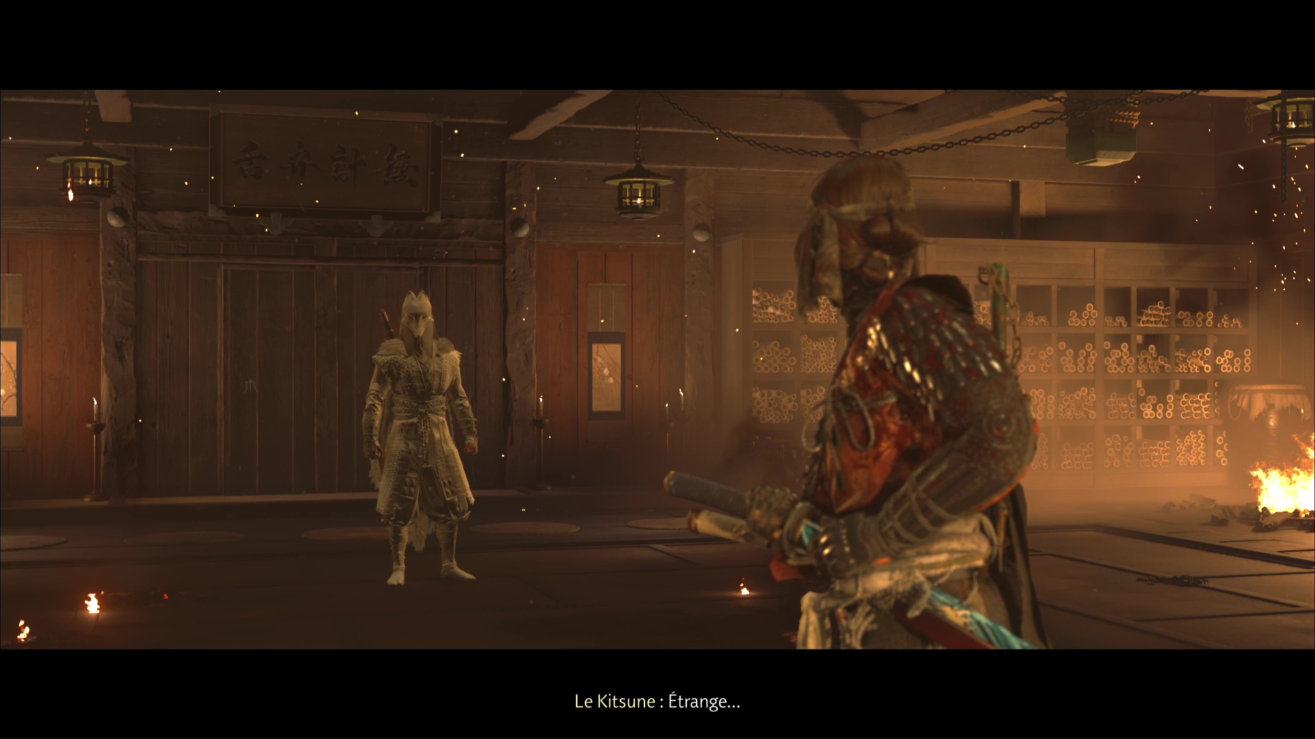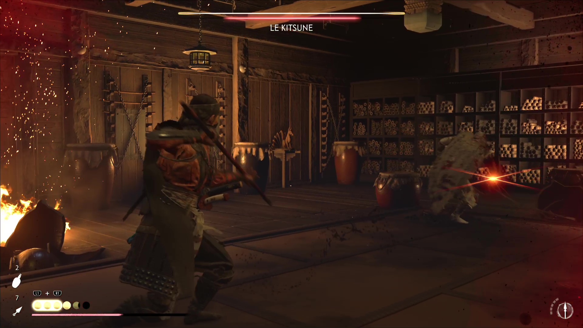 Entrez dans le bâtiment et le Kitsune sera encore là. Atsu mentionne donc la nuit meurtrière à laquelle le Kitsune a pris part, ce qui lance le combat. Votre ennemi se bat au kusarigama, donc sortez votre lance, si vous la possédez.