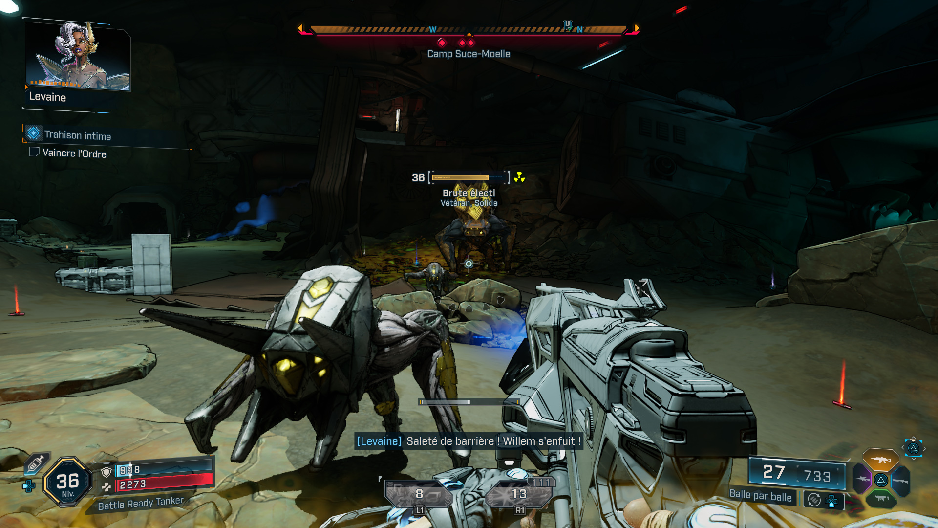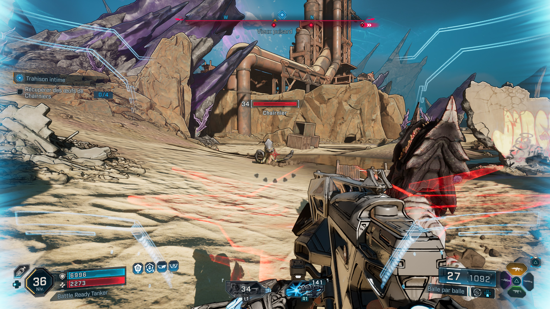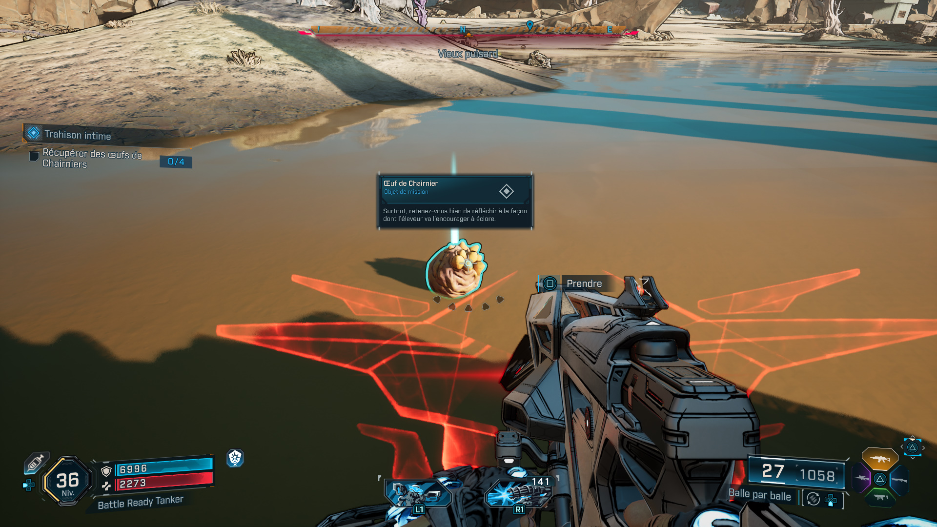 Après avoir fait le point sur la situation avec Levaine, il s’agit tout d’abord de récupérer 4 œufs de Chairniers à l’autre bout du Vieux Puisard. Si vous le souhaitez, vous pouvez d’ailleurs vous téléporter au bar de Moxxi pour vous rapprocher de votre objectif. Une fois dans le repaire des Chairniers, tuez-les pour obtenir des œufs.