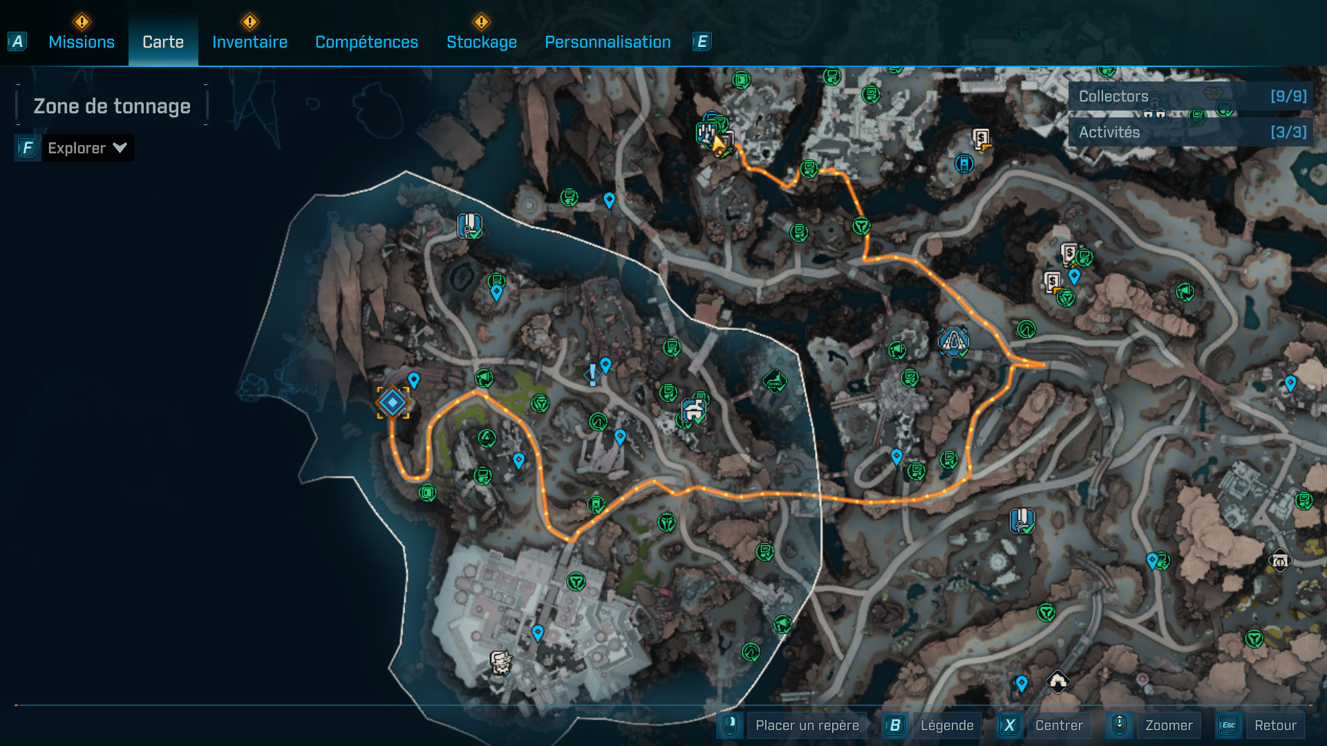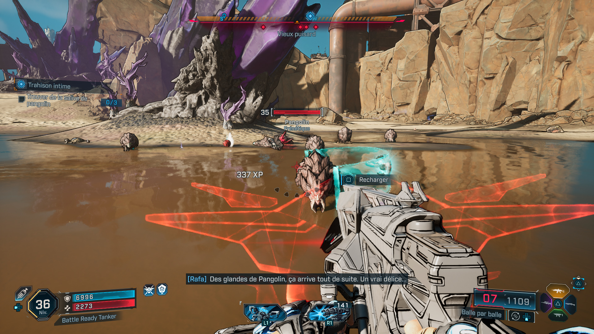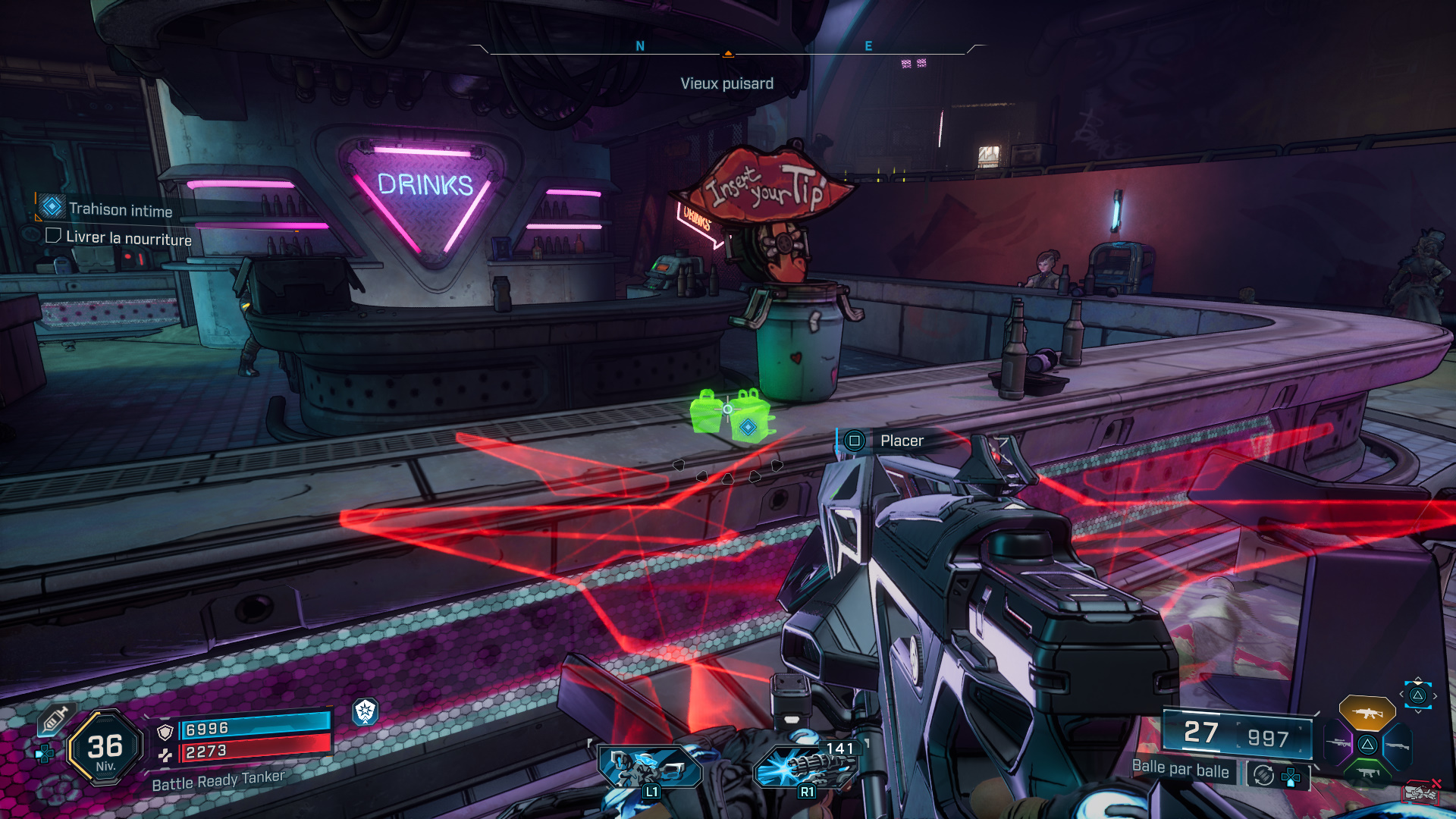 Après ces hostilités, téléportez-vous au bar de Moxxi pour déposer la nourriture à l’endroit indiqué sur le comptoir. Si besoin, profitez-en pour faire quelques emplettes avant de rejoindre la casse, tout à l’ouest de la Zone de Tonnage, près de la Grotte de la Traîtrise.