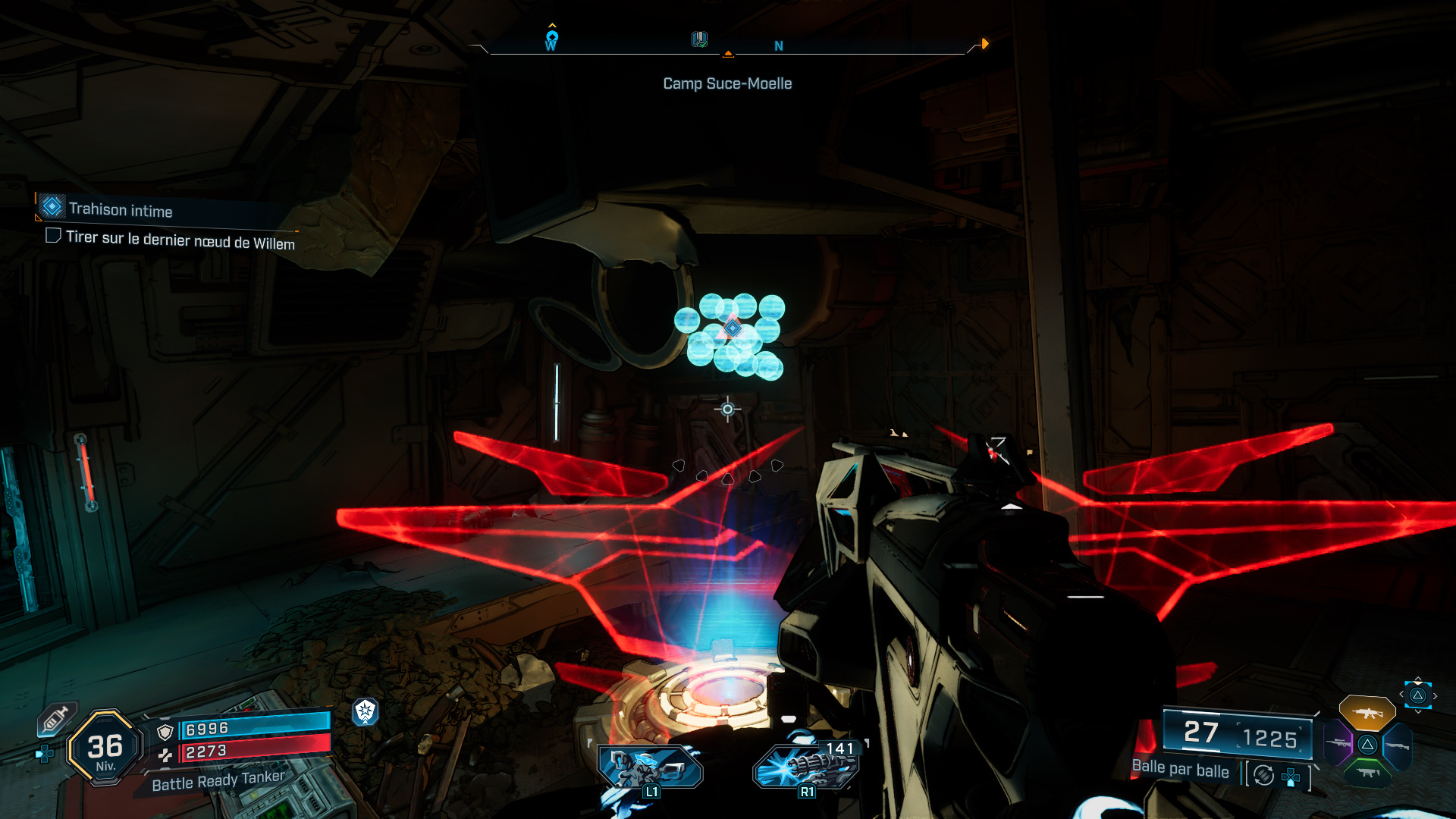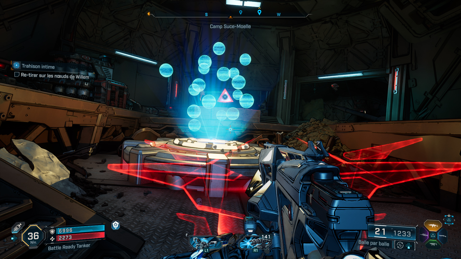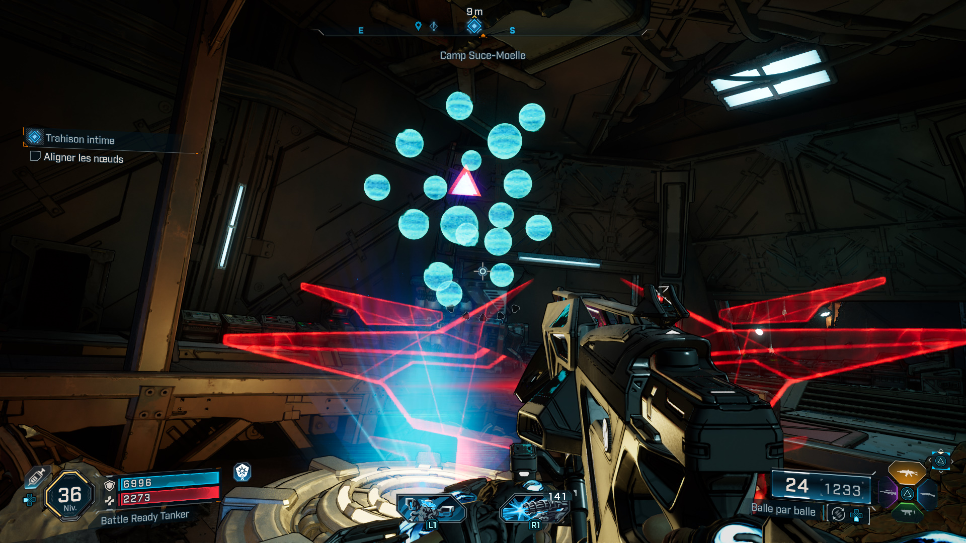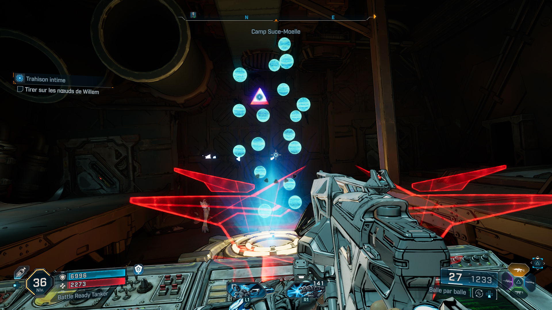 Ce qui fait apparaître un hologramme avec des sphères bleues, le but étant d’aligner tous les nœuds de Willem (représentés par des triangles rouges) de façon à pouvoir tirer dessus d’un seul coup, et ce jusqu’au dernier qui demande de monter sur un tas de caisses à proximité pour prendre un peu de hauteur.