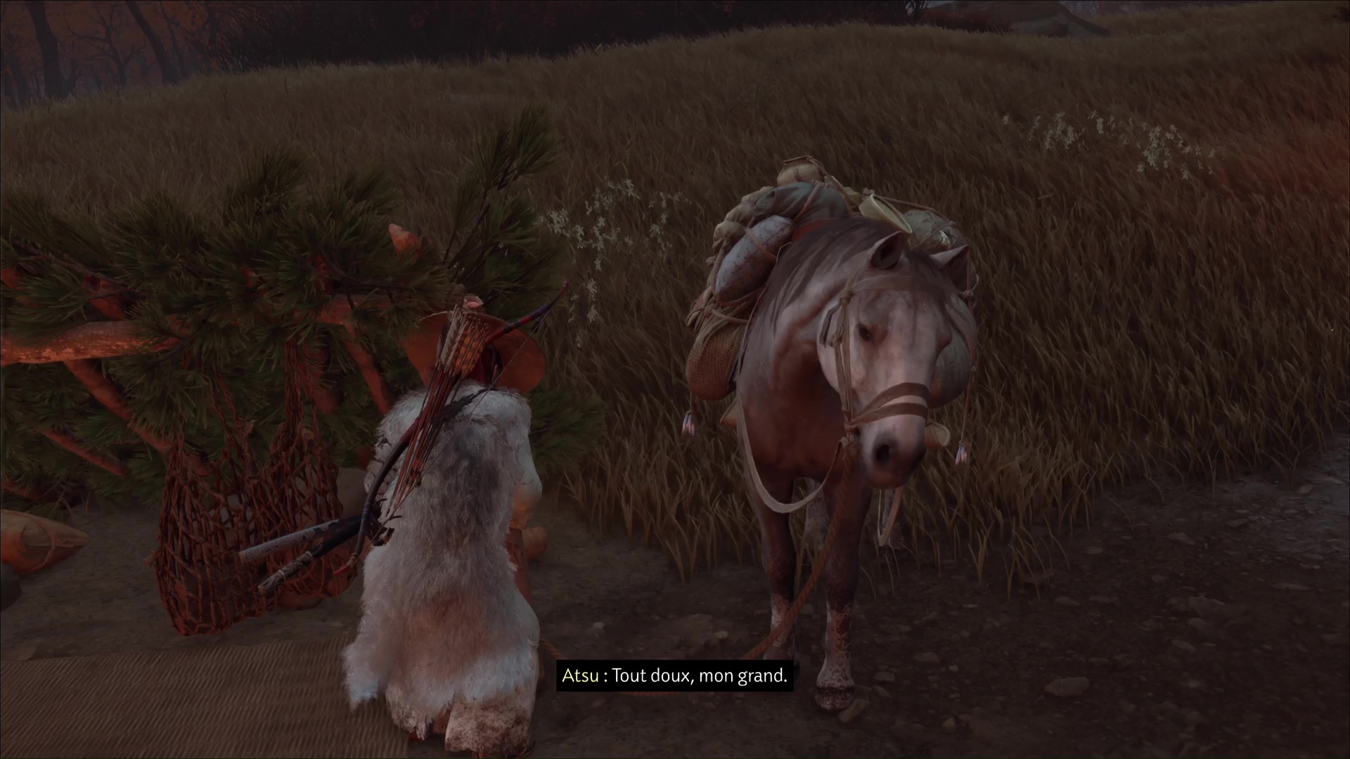 Parlez-lui et il vous fera part de ses problèmes de chevaux. Trois d’entre eux se sont enfuis, et s’il a réussi à en rattraper un, les deux autres continuent de manquer à l’appel. Ils se sont dirigés près de statues maudites de l’Oni, et Atsu va donc mener l’enquête.