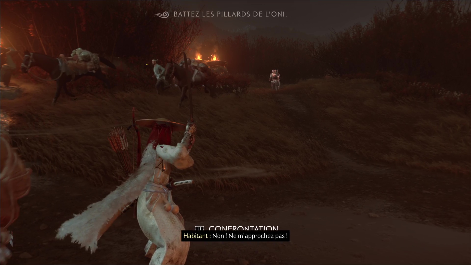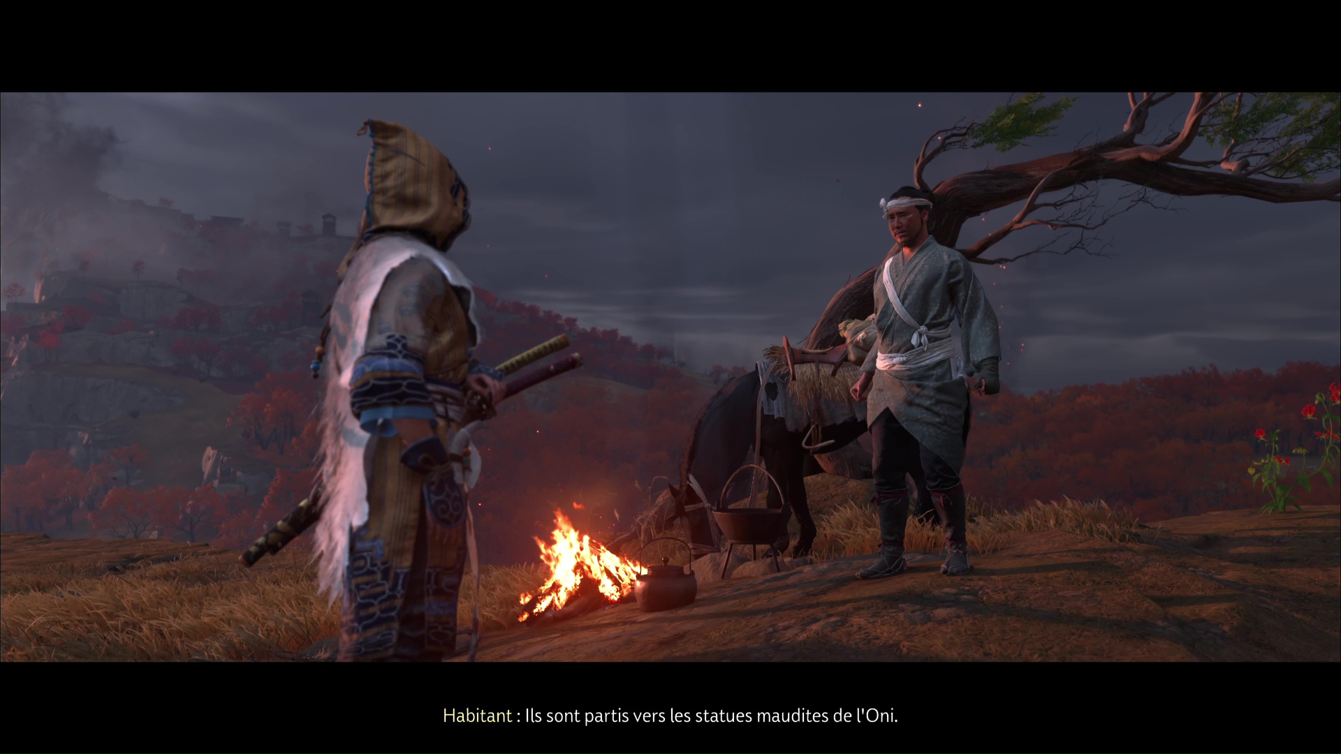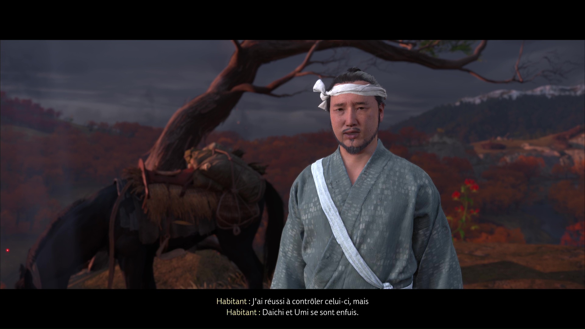 Suivez ensuite à cheval l’habitant puis, arrivé dans la zone maudite, il vous laisse vous en occuper en solo. Commencez par retrouver Daichi. Appelez le cheval grâce à la touche affichée à l’écran, et faites votre petit tour en suivant les statues.