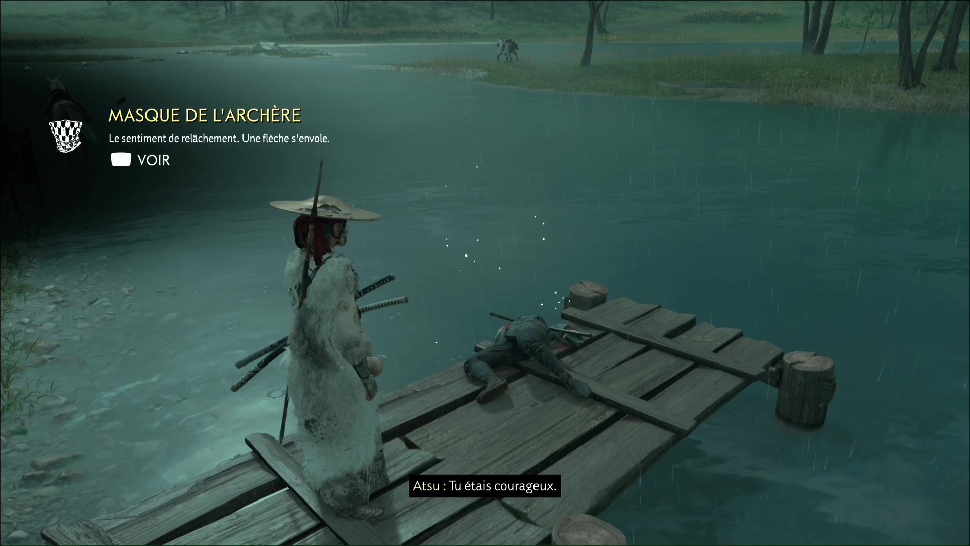 Et avant même de pouvoir engager le combat, l’un d’entre eux dégaine et tue sur le coup le pêcheur. Sortez vos armes et allez le venger, en priorisant, comme à chaque combat, les archers. Une fois tout le monde mort, retournez voir le corps du pêcheur. Récupérez dessus le Masque de l’archère, ce qui signe la fin de ce récit.