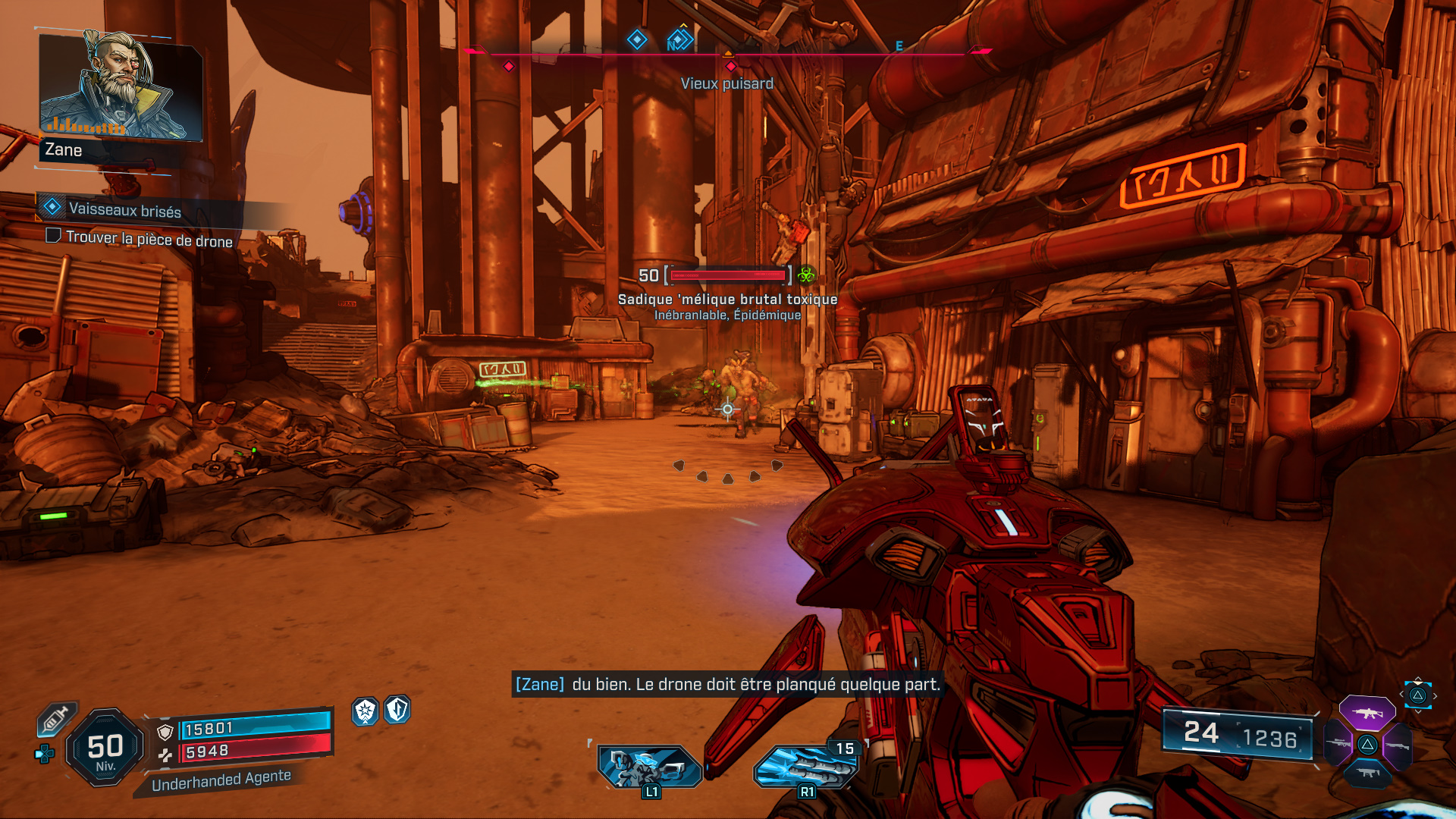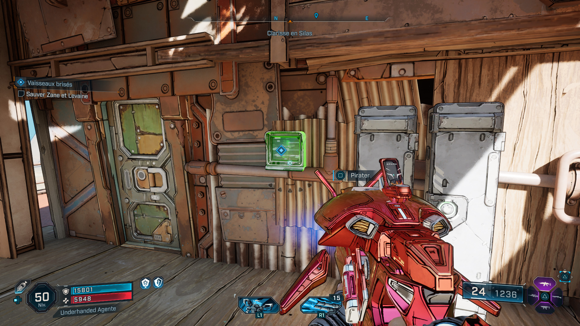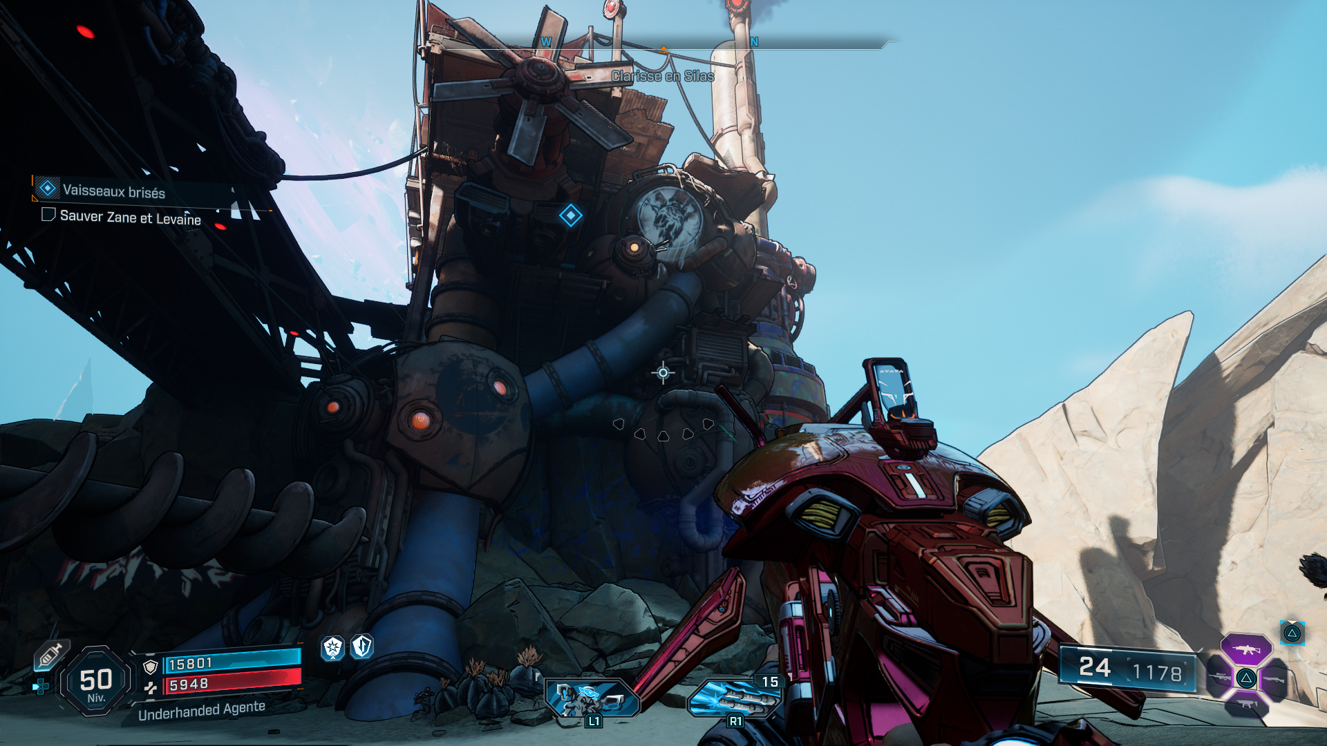 Retournez voir Zane en vous téléportant au bar de Moxxi, et donnez-lui la pièce pour recevoir un appel de Levaine dans la foulée. Elle vous donne alors rendez-vous au nord du Vieux Puisard, à Clarisse en Silas, un endroit envahi par les Déconnectés.