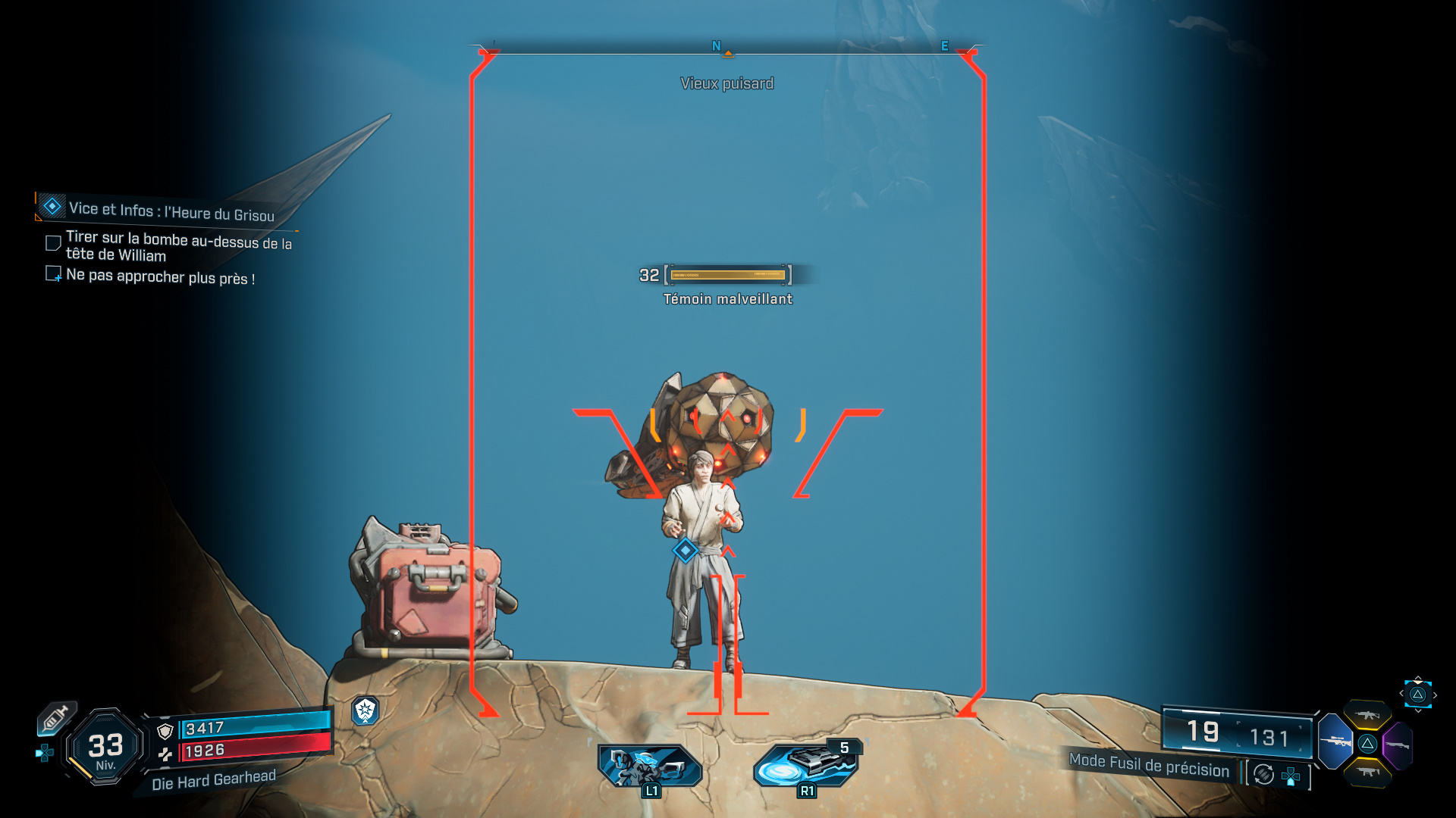 Avant toute chose, ne vous rapprochez pas plus de William sous peine de faire exploser la bombe au-dessus de lui. Ce dernier vous suggère alors de tirer dessus depuis votre position, l’idéal étant d’utiliser un sniper pour être précis. Lorsque tout danger sera écarté, rejoignez le rocher où se tenait William, et récupérez le contenu du coffre rouge pour terminer cette mission.
