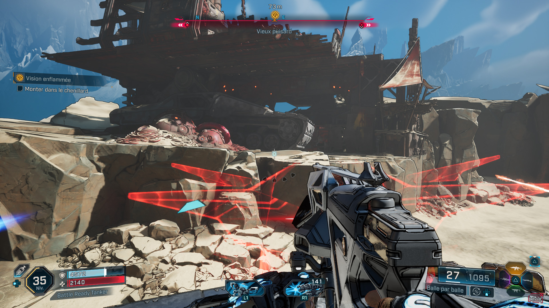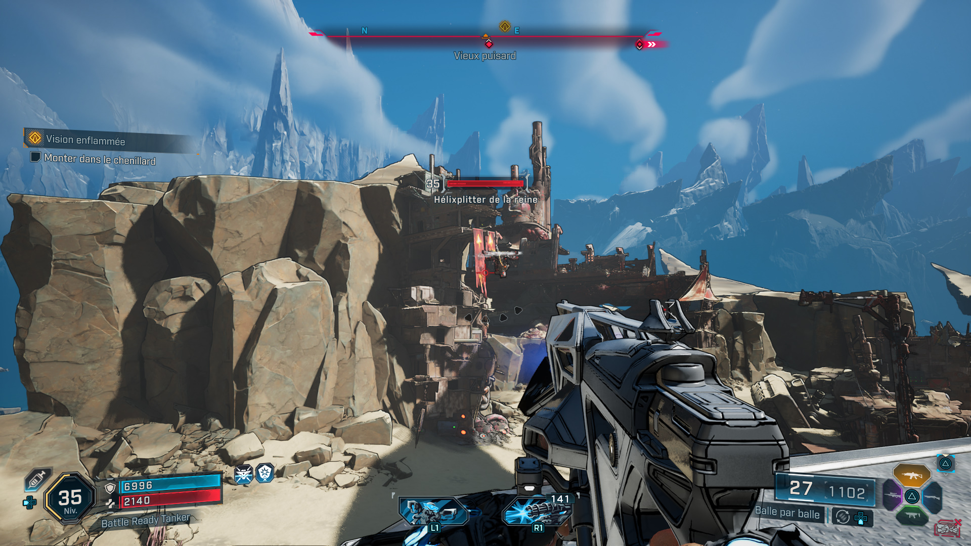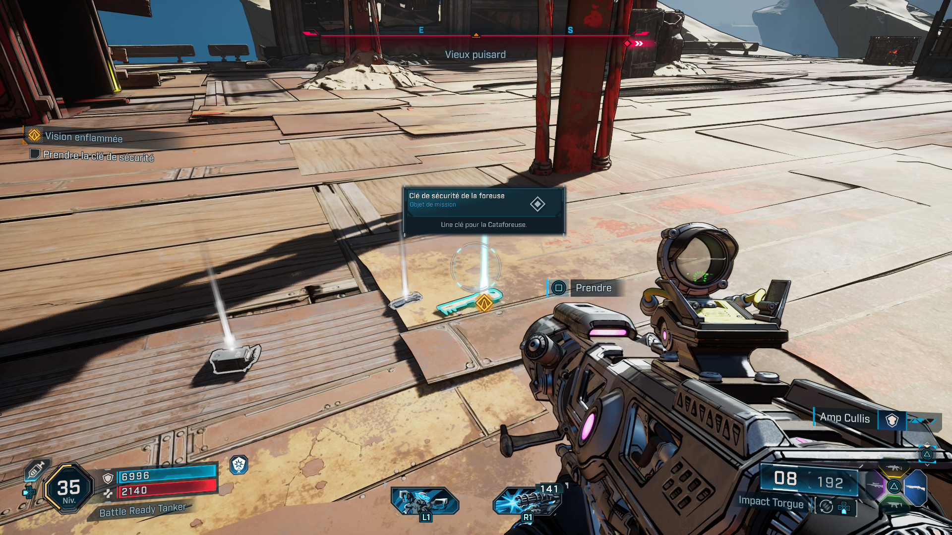 Du coup, attendez que la Cataforeuse arrive à hauteur du chenillard pour sauter sur la plateforme. Montez tout en haut de l’engin, débarrassez-vous des ennemis, et notamment du Cataforeur pour vous emparer de la clé de sécurité de la foreuse.