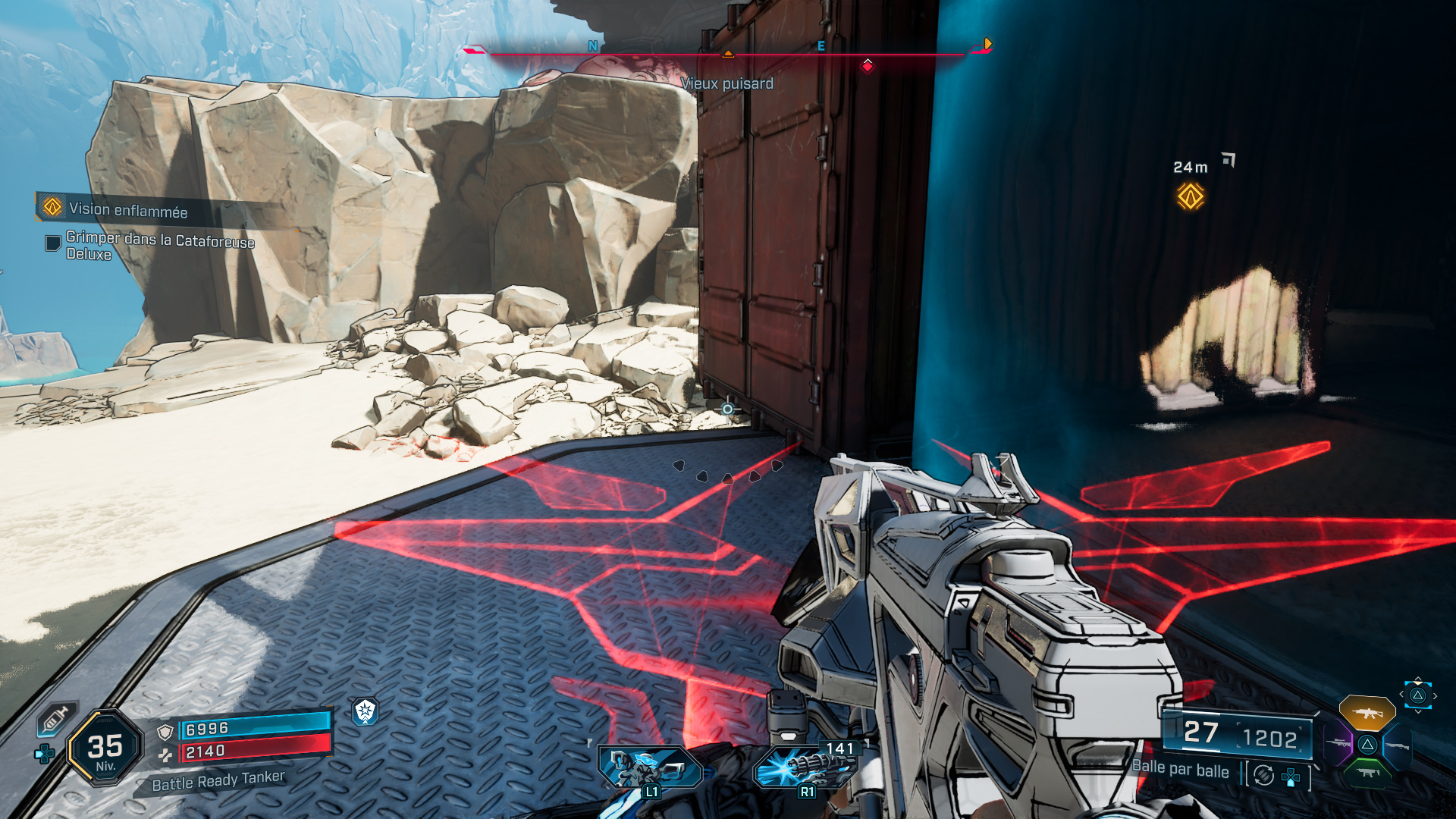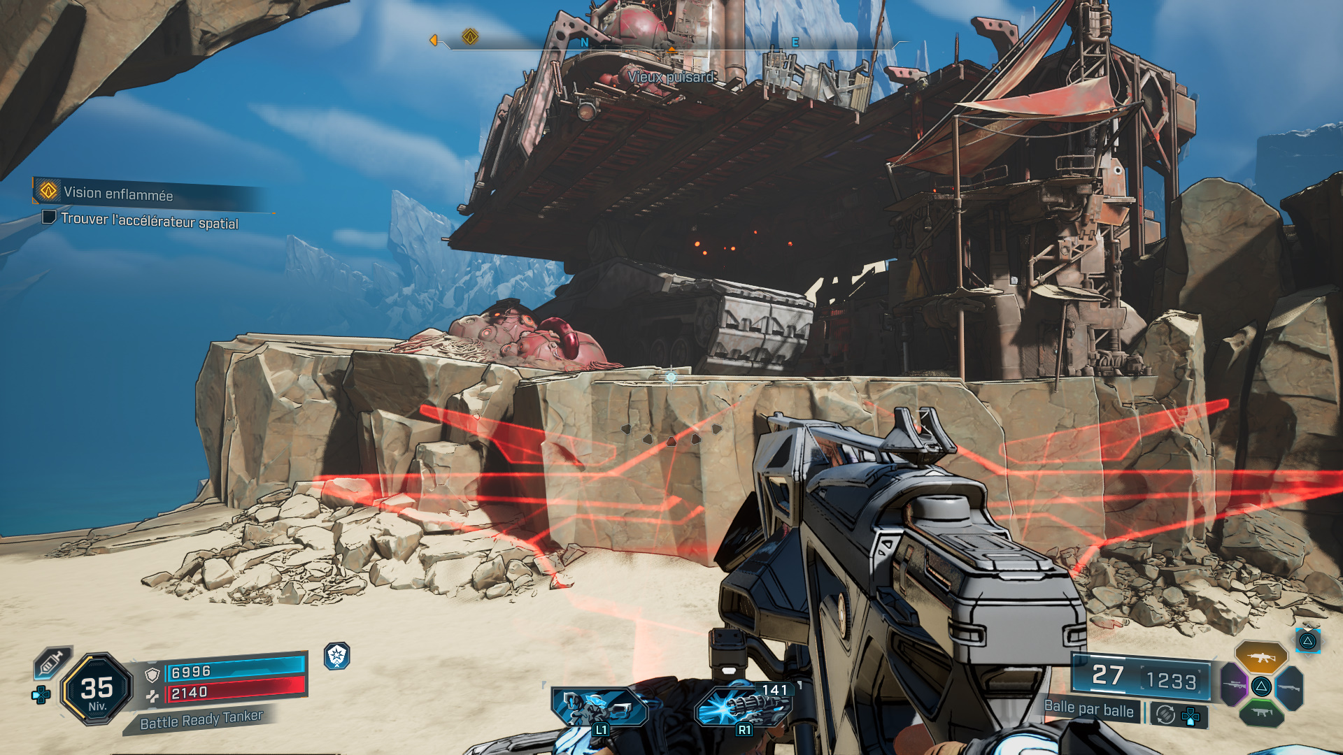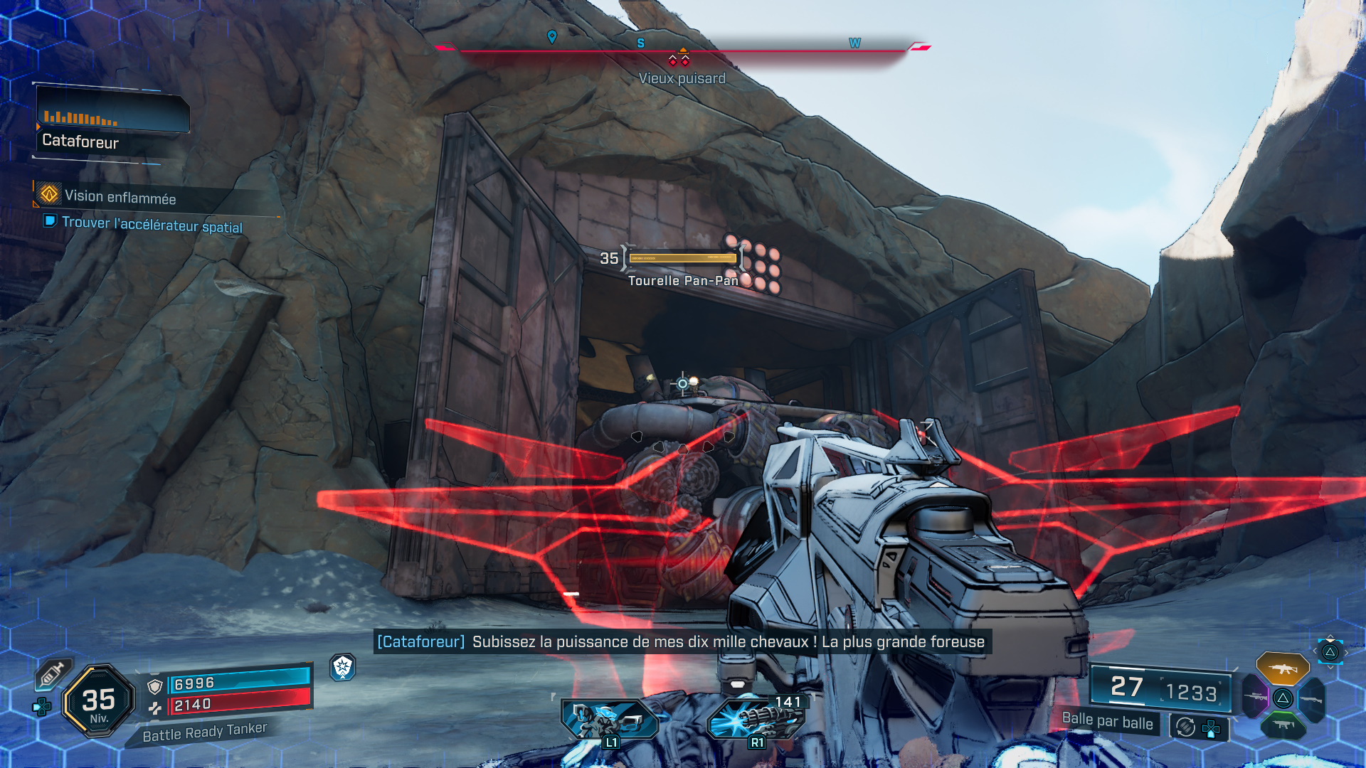 Du coup, attendez que la Cataforeuse arrive à hauteur du chenillard pour sauter sur la plateforme. Montez tout en haut de l’engin, débarrassez-vous des ennemis, et notamment du Cataforeur pour vous emparer de la clé de sécurité de la foreuse.