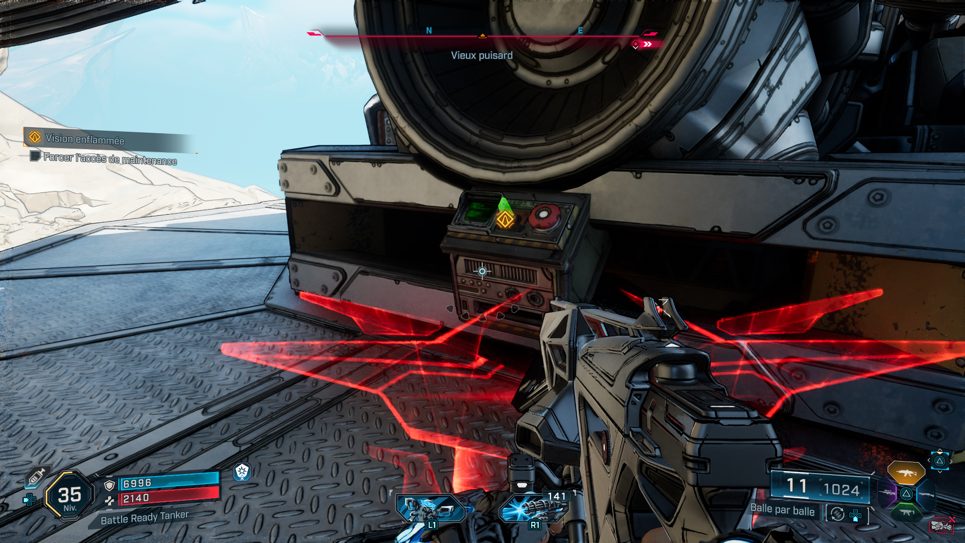Grimpez à l’arrière de l’engin et appuyez sur le bouton indiqué pour essayer de forcer l’accès de maintenance, tout en vous débarrassant des ennemis volants qui pourraient vous gêner.