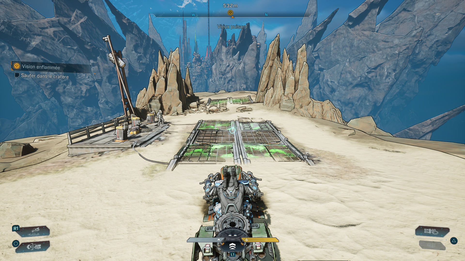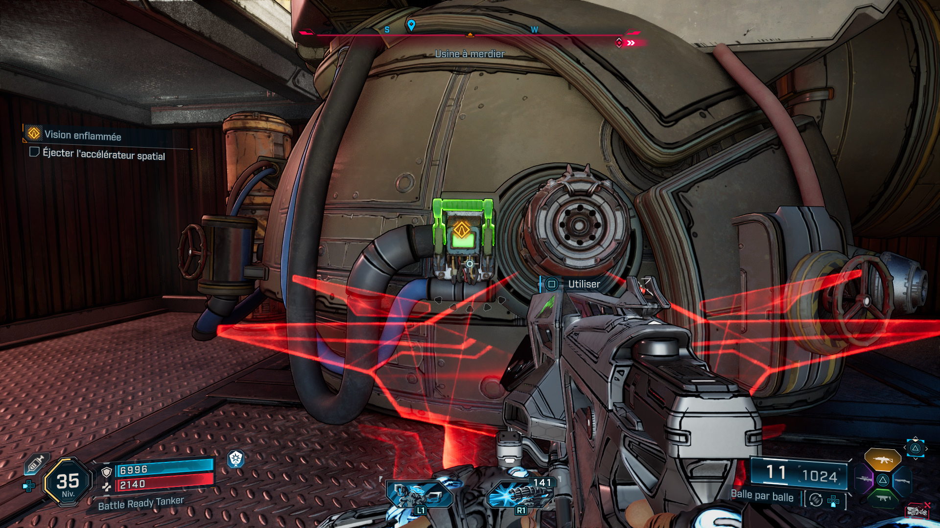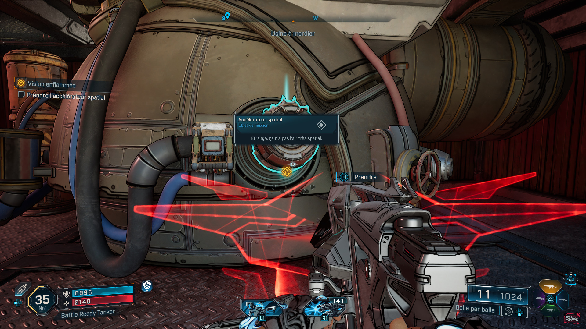 Une fois la zone nettoyée, mettez-vous à la recherche de l’accélérateur spatial et suivez un premier marqueur sur votre boussole pour apercevoir un chenillard. De là, rebroussez chemin et suivez le nouveau marqueur un peu plus loin vers l’ouest de l’usine pour arriver devant une énorme porte s’ouvrant alors pour laisser passer une Cataforeuse Deluxe.