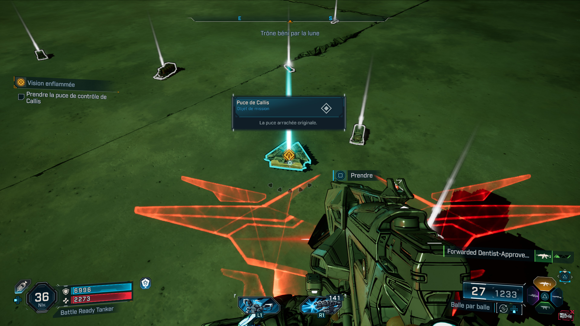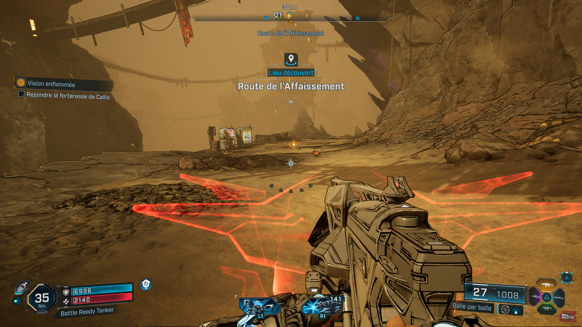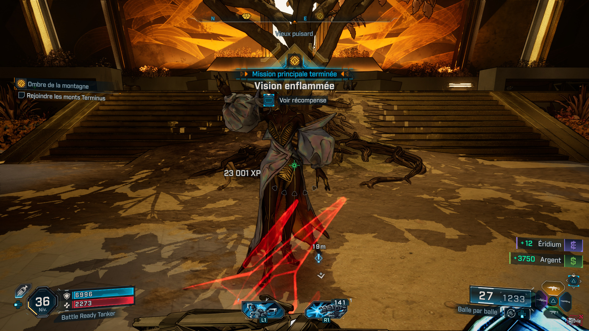 Lorsque vous aurez détruit son blindage, représenté par la barre jaune au-dessus de sa barre de vie, elle sort de l’arène pour matérialiser des pics rouges qu’il faut éviter de toucher, tout en vous débarrassant d’une nouvelle vague d’ennemis. Venez-en à bout pour ensuite l’achever et récupérer la puce de contrôle au milieu du butin. Enfin, quittez l’arène par le tunnel en hauteur et retournez voir Levaine à Carcadia pour mettre un terme à cette mission. Vous pouvez désormais poursuivre votre aventure dans les Monts Terminus avec la prochaine mission intitulée « Ombre de la Montagne », si ce n’est pas déjà fait.