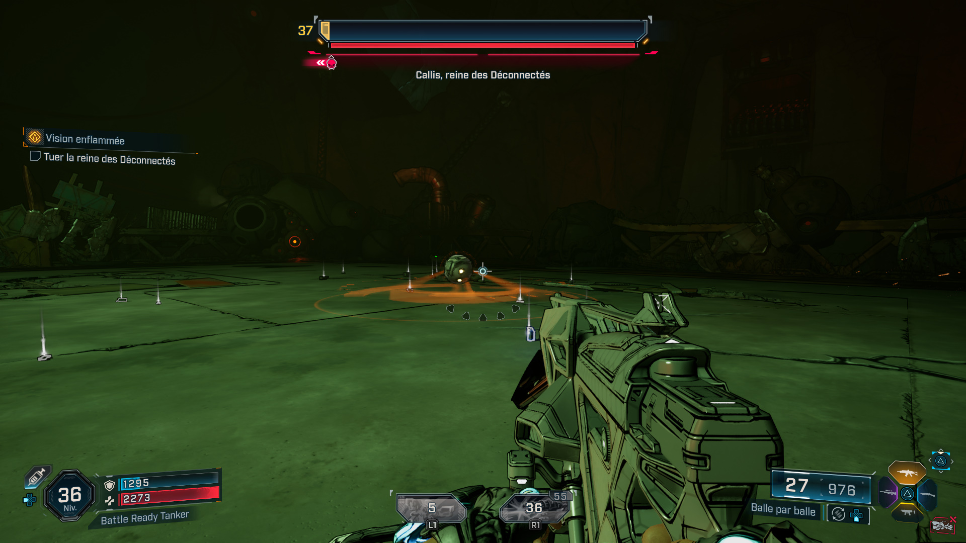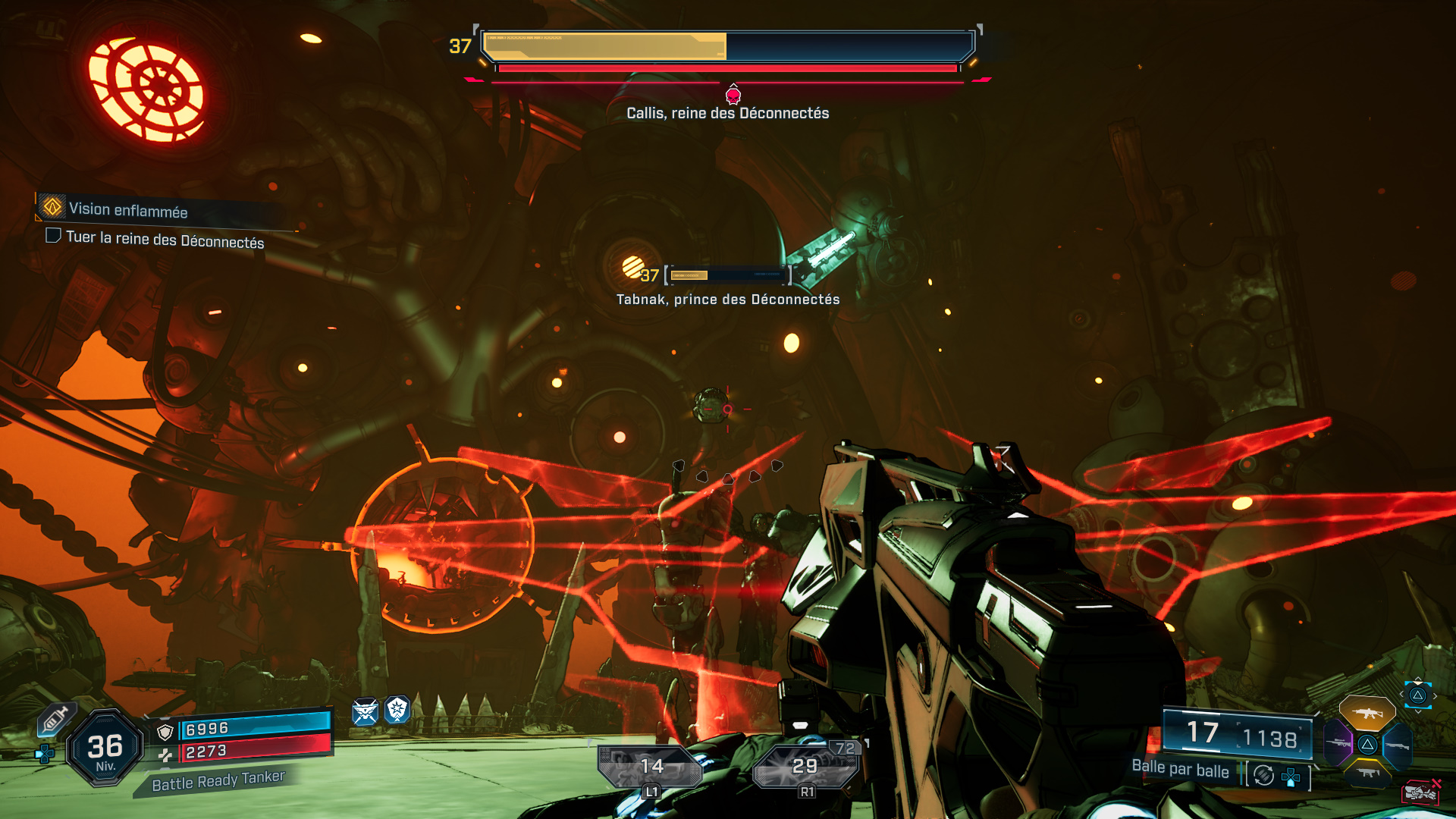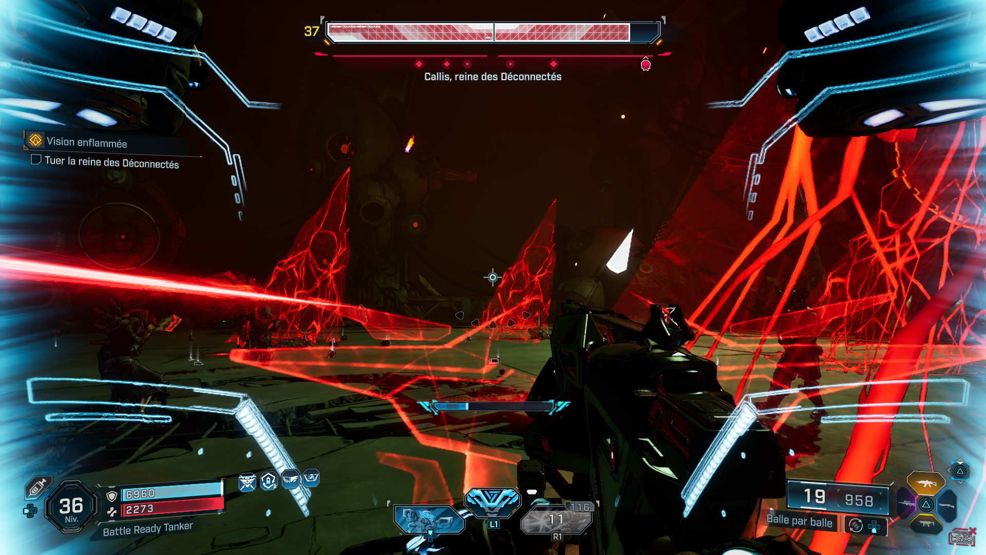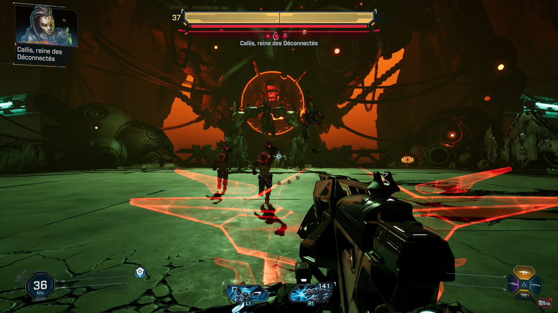 Callis est très rapide, restez donc constamment en mouvement pour éviter ses assauts. De plus, elle est capable d’invoquer une vague de Sadiques suicidaires, entre autres, mais aussi un drone volant nommé Tabnak, prince des Déconnectés, ce dernier larguant des bombes dans l’arène. Focalisez-donc vos tirs sur le drone lorsqu’il apparaît au-dessus de Callis.
