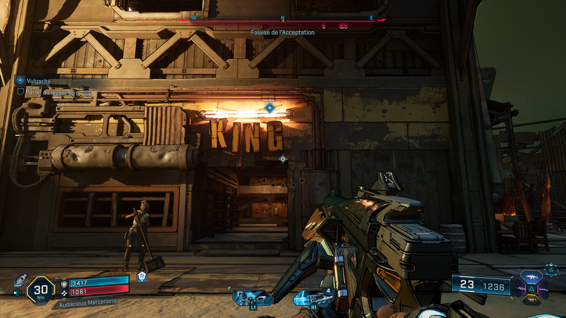 Retournez donc parler à GeneVI3VE avant d’aller activer le Clap-signal. Pour cela, grimpez sur le toit de la maison « King » et piratez le signal pour faire appel à Claptrap qui vous attend alors devant la maison. Parlez-lui et accompagnez-le devant GeneVI3VE pour qu’il retrouve finalement une vieille connaissance…