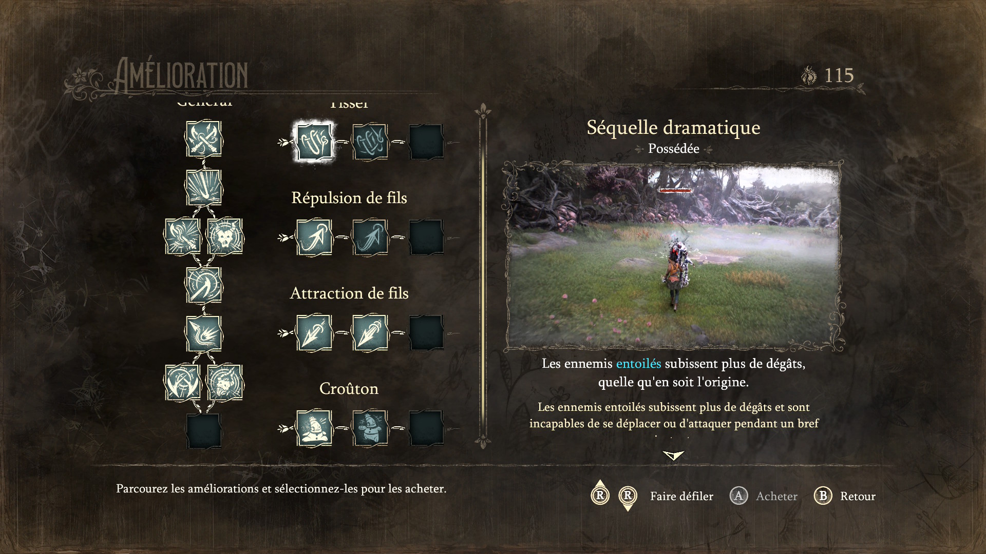D’ailleurs, s’il y a des qualités indéniables sur South of Midnight, le gameplay n’est pas tout autant qualitatif. Mais rassurez-vous, le jeu est loin de proposer pour autant une mauvaise expérience. En effet, le soft va alterner assez souvent entre des combats en arène, de la plateforme, mais aussi de très légères énigmes afin d’avancer à base d’activation de mécanismes (au demeurant trop faciles). Et c’est là tout le souci du jeu : il consistera à répéter ce schéma à outrance durant ces 10h de jeu, et avec assez peu d’évolutions de gameplay. La faute à un arbre à compétences très léger, mais aussi des mécaniques de gameplay sous-exploitées, le contrôle de Croûton en première ligne où il y avait tellement de choses à faire.