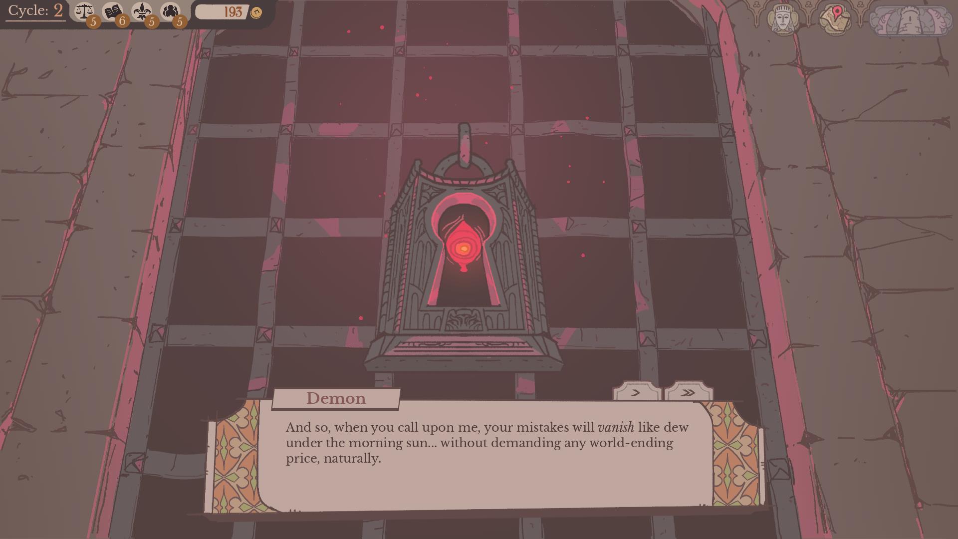 Lorsque les choix mènent au chaos (ce qui semble inévitable) Sovereign Tower introduit une mécanique permettant de conclure un pacte démoniaque pour remonter le temps. Cette fonctionnalité permet d’explorer de nouveaux embranchements narratifs, de débloquer des options de dialogue inédites et de révéler des secrets jusque-là inaccessibles. Le jeu mise ainsi sur une forte rejouabilité, et chaque tentative offre une lecture différente du pouvoir, de ses conséquences et des relations entre les personnages.
