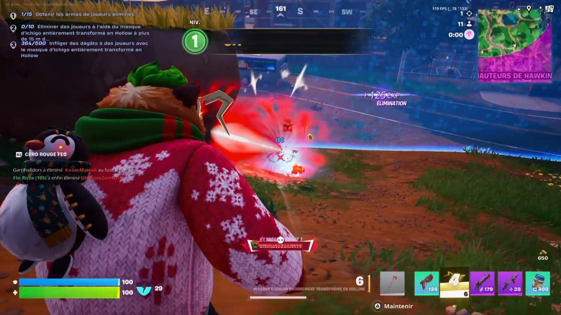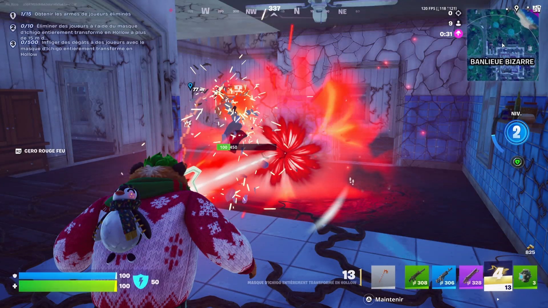 Vous le verrez, de nombreuses quêtes sont liées à l’utilisation d’une nouvelle arme liée à cette collaboration avec Bleach, le Zangetsu Dédoublé de rareté Mythique. Il s’agit d’un ensemble de deux lames de rareté Légendaire dévastatrices, qui vous permettent en prime de sprinter plus longtemps, de sauter plus haut et de bénéficier d’un double-saut (Ruée aérienne). Ces lames disposent de deux attaques (comme le Katana de La Mariée dans le mode Battle Royale), à savoir le Combo ainsi que l’Assaut tombant. Il vous suffira de regarder les commandes à gauche de l’écran et de vous faire plaisir pour comprendre comment fonctionne cette arme.