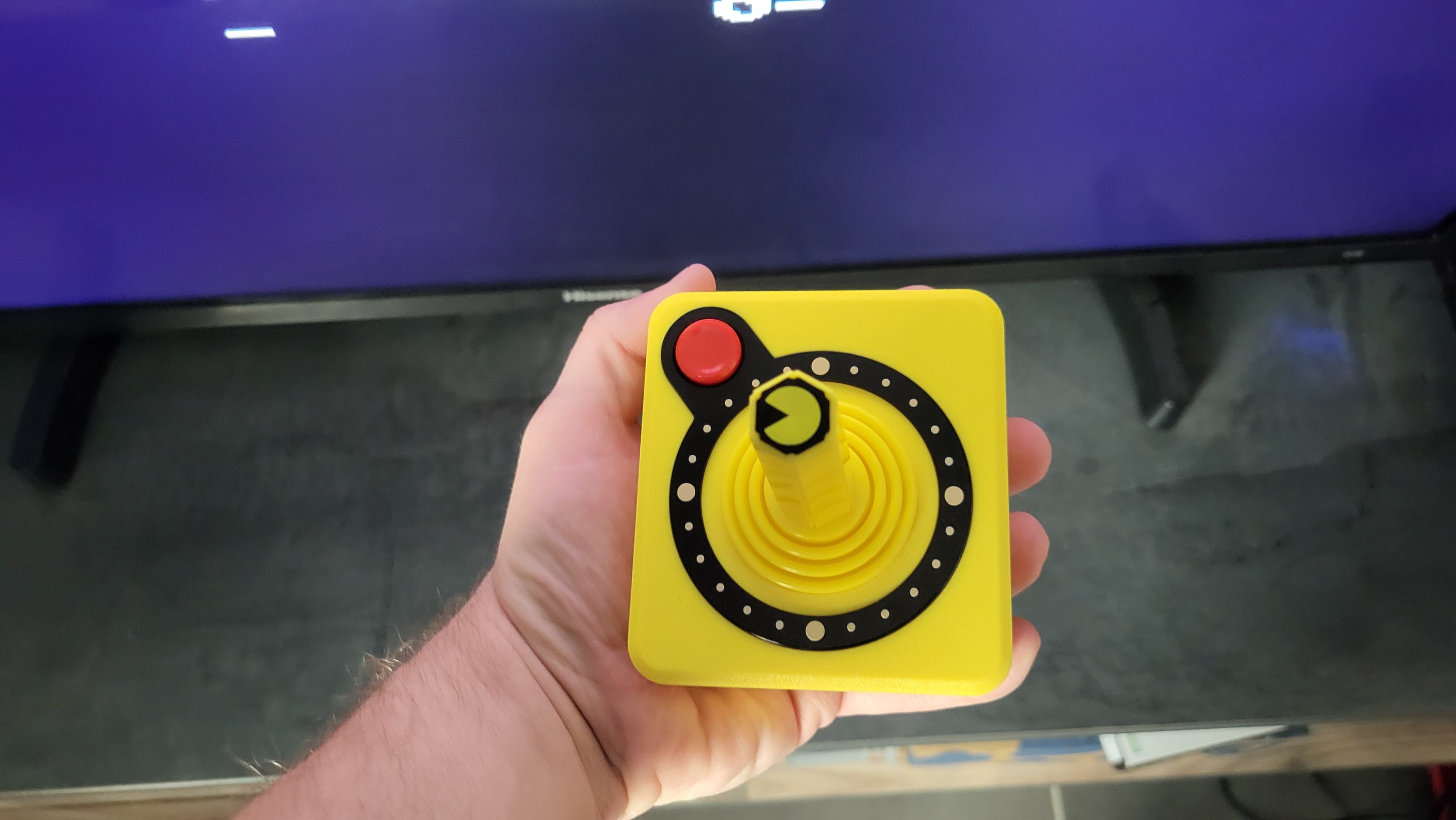 Le joystick CX40+, de son côté, est un petit bijou. Réplique exacte du modèle d’origine, il adopte ici une robe jaune éclatante, prête à avaler du fantôme, et surtout une connexion sans fil. Le stick garde cette résistance ferme et rassurante, le clic du bouton rouge résonne comme un écho des années 80. Atari fournit deux dongles : l’un USB-A pour PC, l’autre DB9 pour les Atari anciennes ou modernes. Et la batterie intégrée se recharge via un câble USB-C fourni, lui aussi personnalisé. Le résultat : un contrôleur authentique dans le ressenti, mais libéré des câbles, prêt à fonctionner sur n’importe quel support.