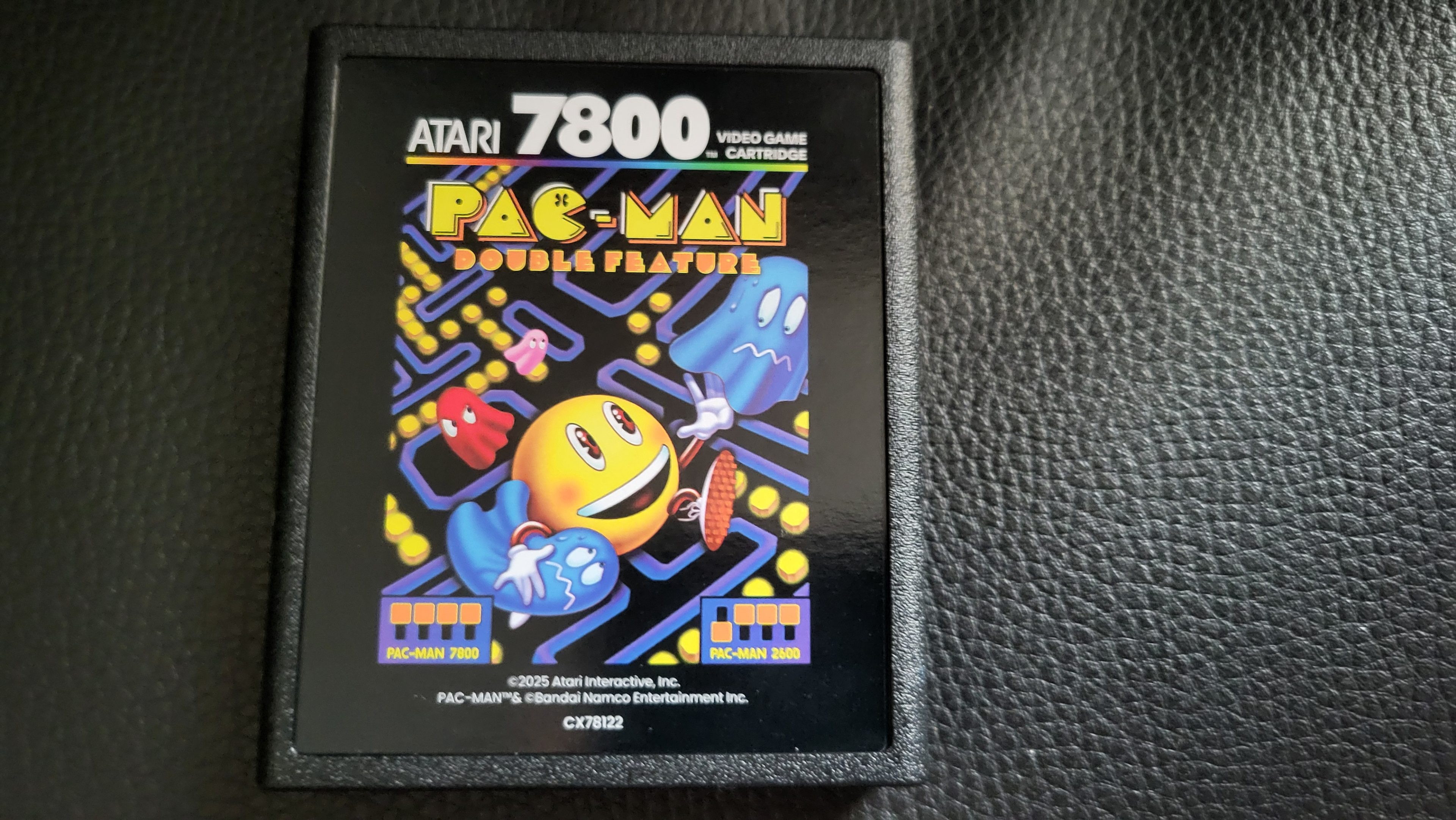 La cartouche Pac-Man Double Feature inclue mérite à elle seule une mention spéciale. Elle regroupe deux versions du jeu : celle de la 2600 de 1983, brute, cubique, mythique, et celle de la 7800, plus détaillée et colorée. Grâce à un petit switch, on passe de l’une à l’autre en un clin d’œil. Cette dualité résume parfaitement la philosophie du pack : un voyage entre deux époques, sans artifices ni filtres. La première version est un pur document d’histoire. La seconde, quant à elle, une version plus accessible pour les néophytes, fluide et lisible tout en conservant la patte Atari.