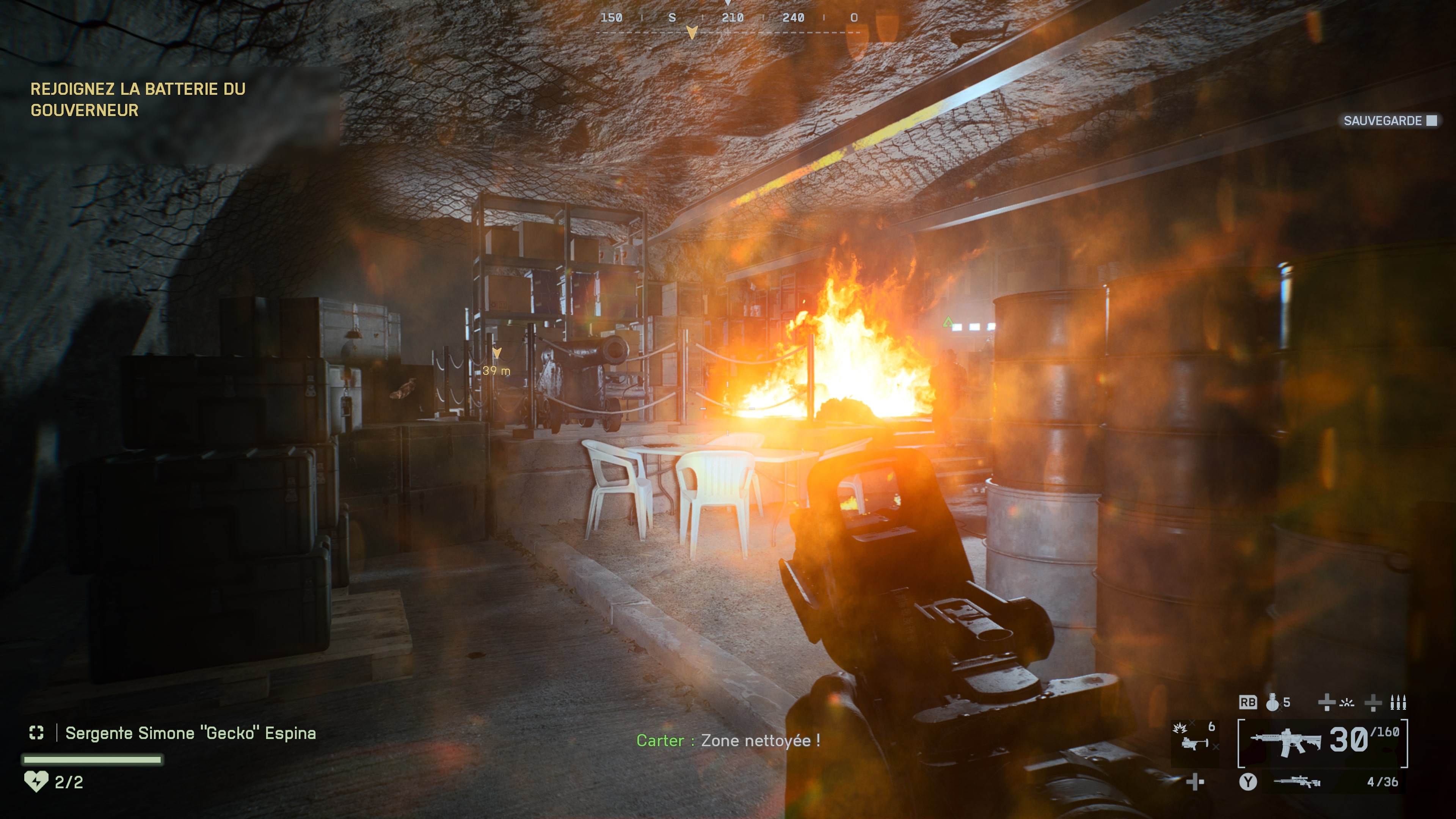 Le titre n’hésite pas à jouer et à rejouer d’effets « popcorn » dans sa mise en scène. Ça explose de partout, les balles fusent tandis que la menace de tanks ou d’un hélicoptère se fait de plus en plus présente, nous forçant à courir d’abri en abri. Mais l’ensemble fonctionne à merveille et on prend un grand plaisir à parcourir les différentes missions de la campagne.