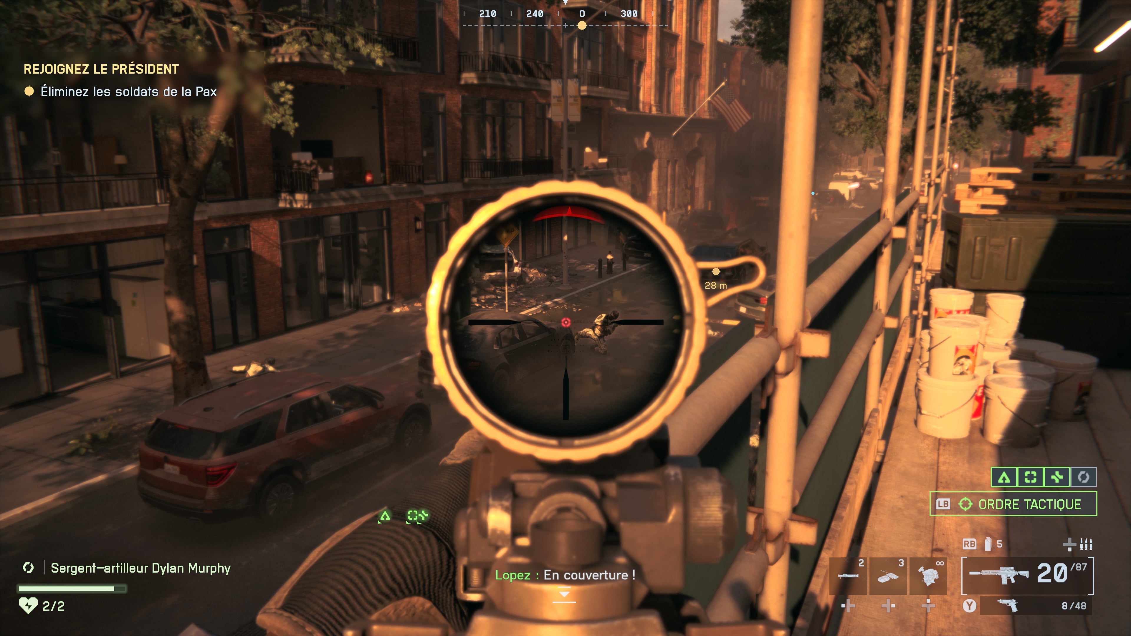 Il est d’ailleurs possible de donner des ordres à ses équipiers via une roue d’action, ce qui permet par exemple de demander à l’éclaireuse du groupe de repérer tous les adversaires de la zone. Une idée plutôt astucieuse qui permet une initiation en douceur dans la partie multijoueur sans pour autant perdre en crédibilité d’un point de vue narratif.