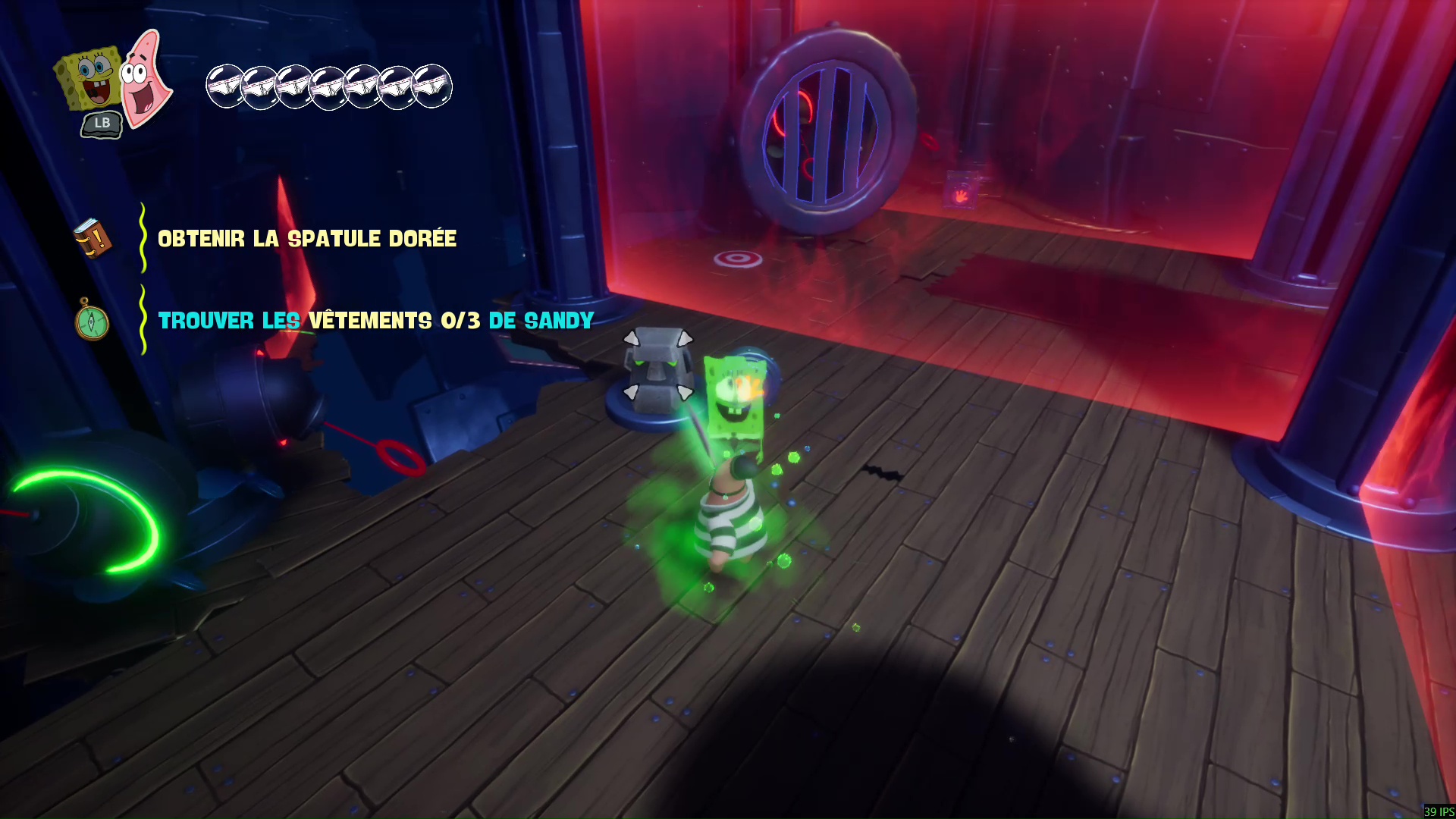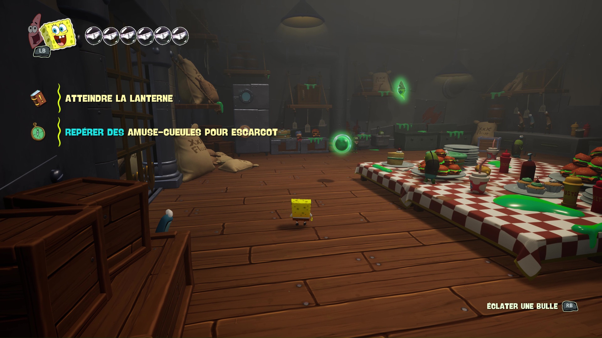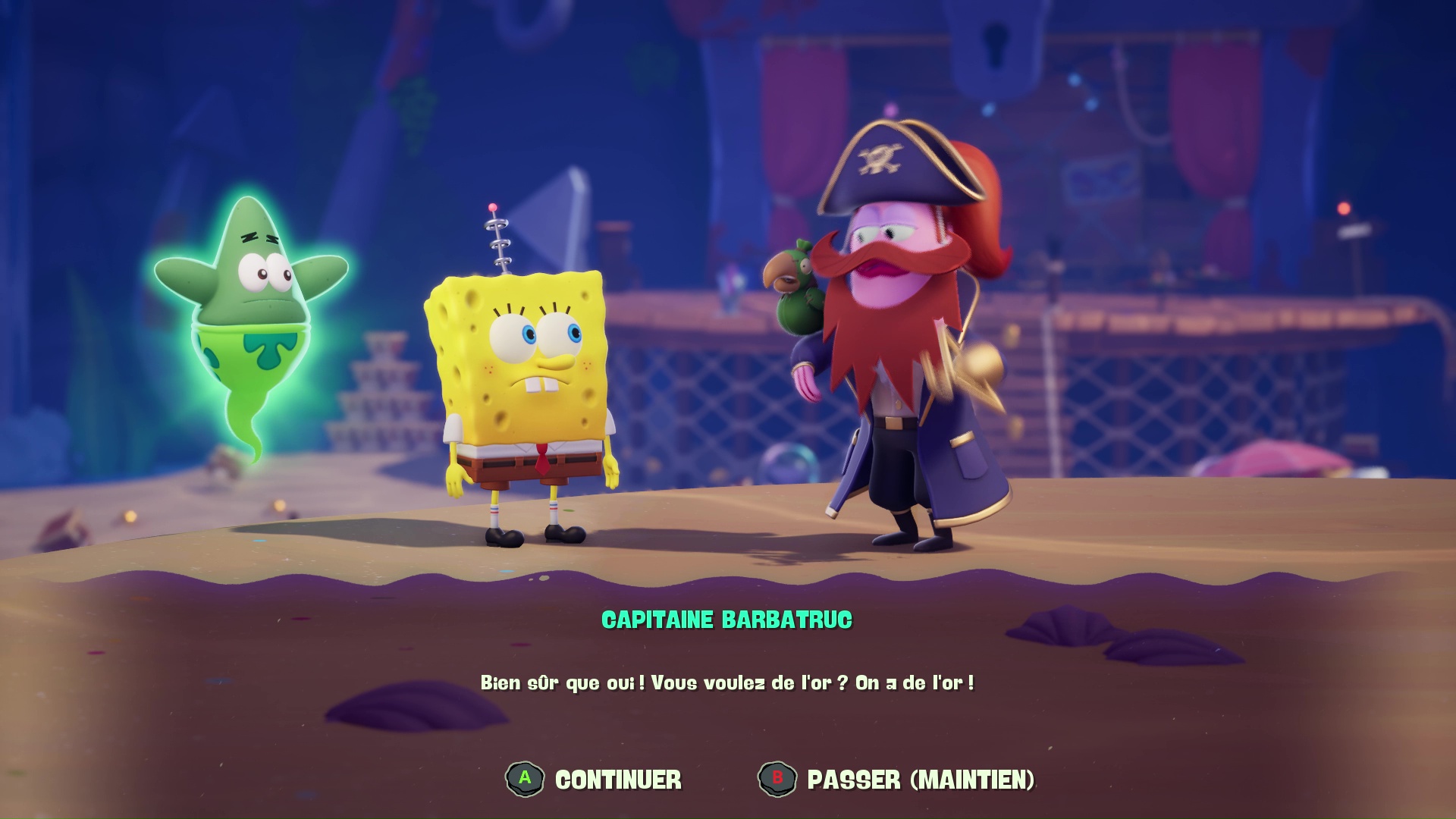On incarne à ce moment Patrick l’étoile de mer, le célèbre meilleur ami de l’éponge carrée, dont le but sera de retrouver la route du Crabe Croustillant tout en éliminant au passage les premiers fantômes agressifs. L’occasion d’aborder les mécaniques de combat, qui n’évoluent pas vraiment par rapport aux précédents jeux, mais qui sont tout de même suffisamment fluides pour y prendre du plaisir et tenter des choses grâce aux compétences de nos héros (nous y reviendrons). Une fois tout le monde réuni, tout ce joli groupe va alors fuir à bord du Pâté Flottant, une variante façon dirigeable qui va servir de hub entre les différents niveaux.