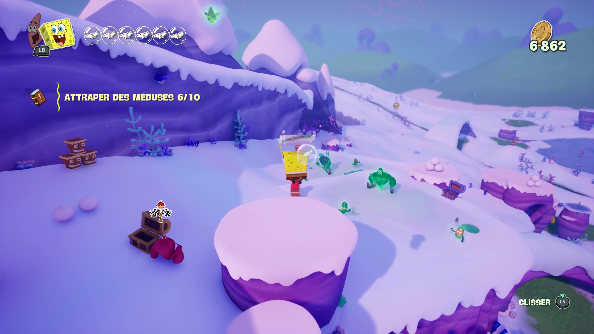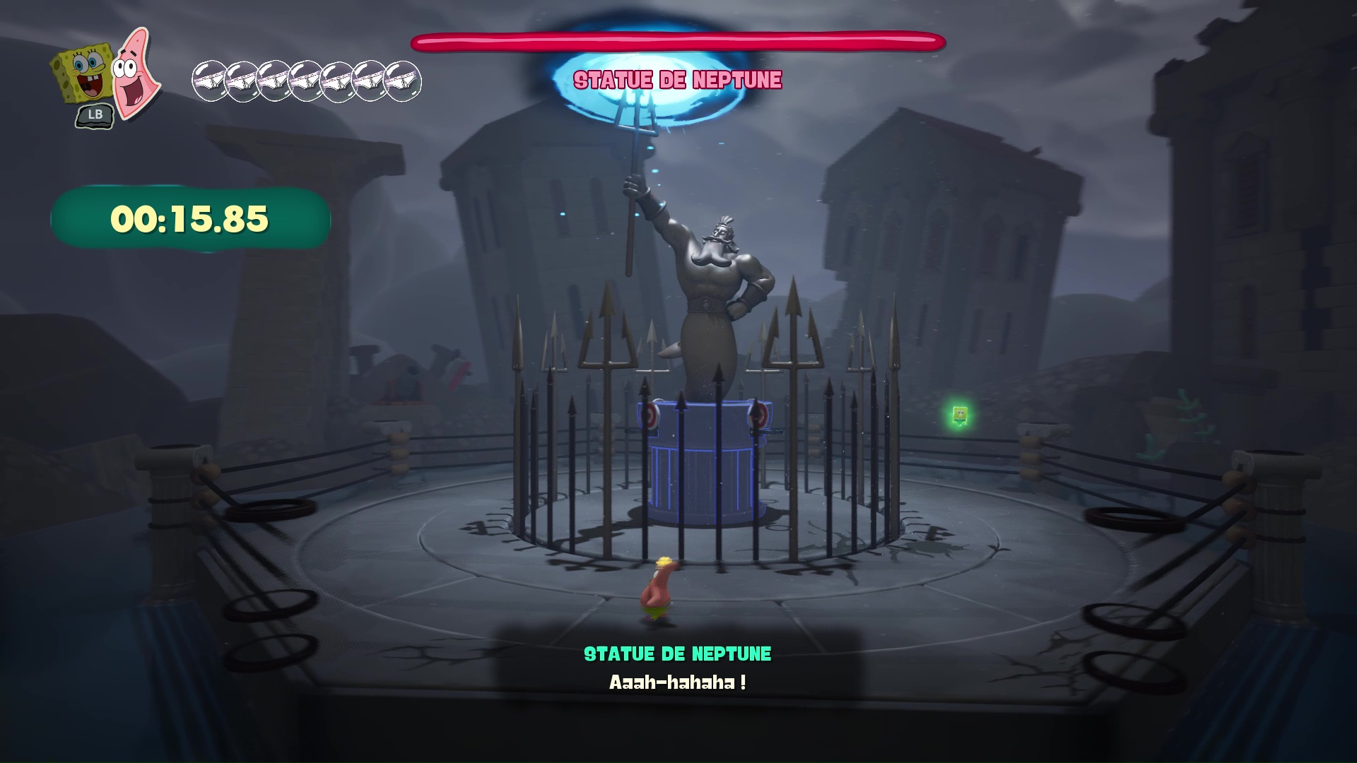 Des environnements très diversifiés et qui sont pour certains visités pour la première fois dans la licence. Adieu l’unique Bikini Bottom que l’on pouvait voir dans Bataille pour Bikini Bottom ou même le jeu centré sur Patrick l’étoile de mer. Cette fois, nous nous rendons sur l’île du Poisson Rouge, dans la Prairie des méduses enneigée, mais également au Palais de Neptune, aux catacombes qui s’y rattachent, Atlantide-Ville, ou encore au Musée de la Friture. L’occasion d’adouber ces niveaux très colorés et visuellement riches, avec pas mal de PNJ à qui parler (avec des dialogues la plupart du temps bien pensés) ainsi qu’une foule d’activités à faire.