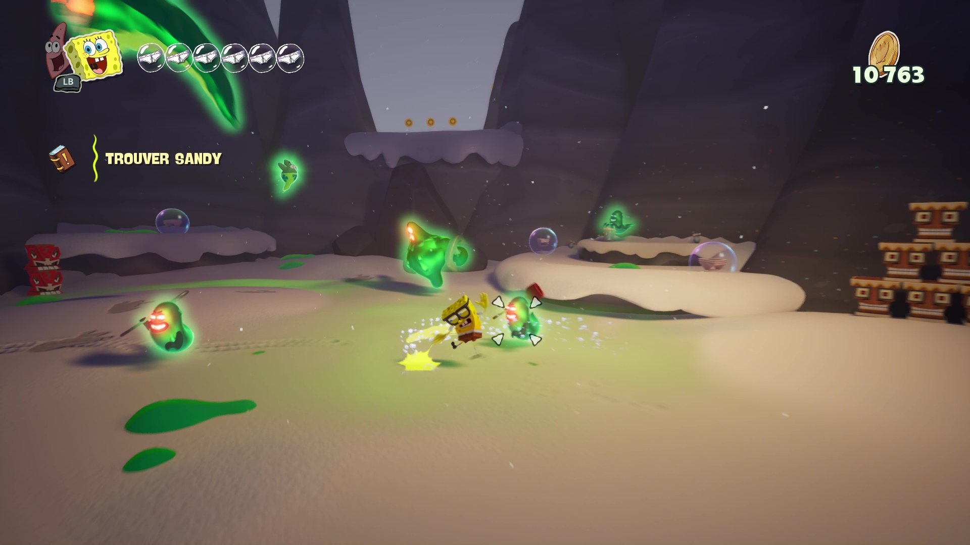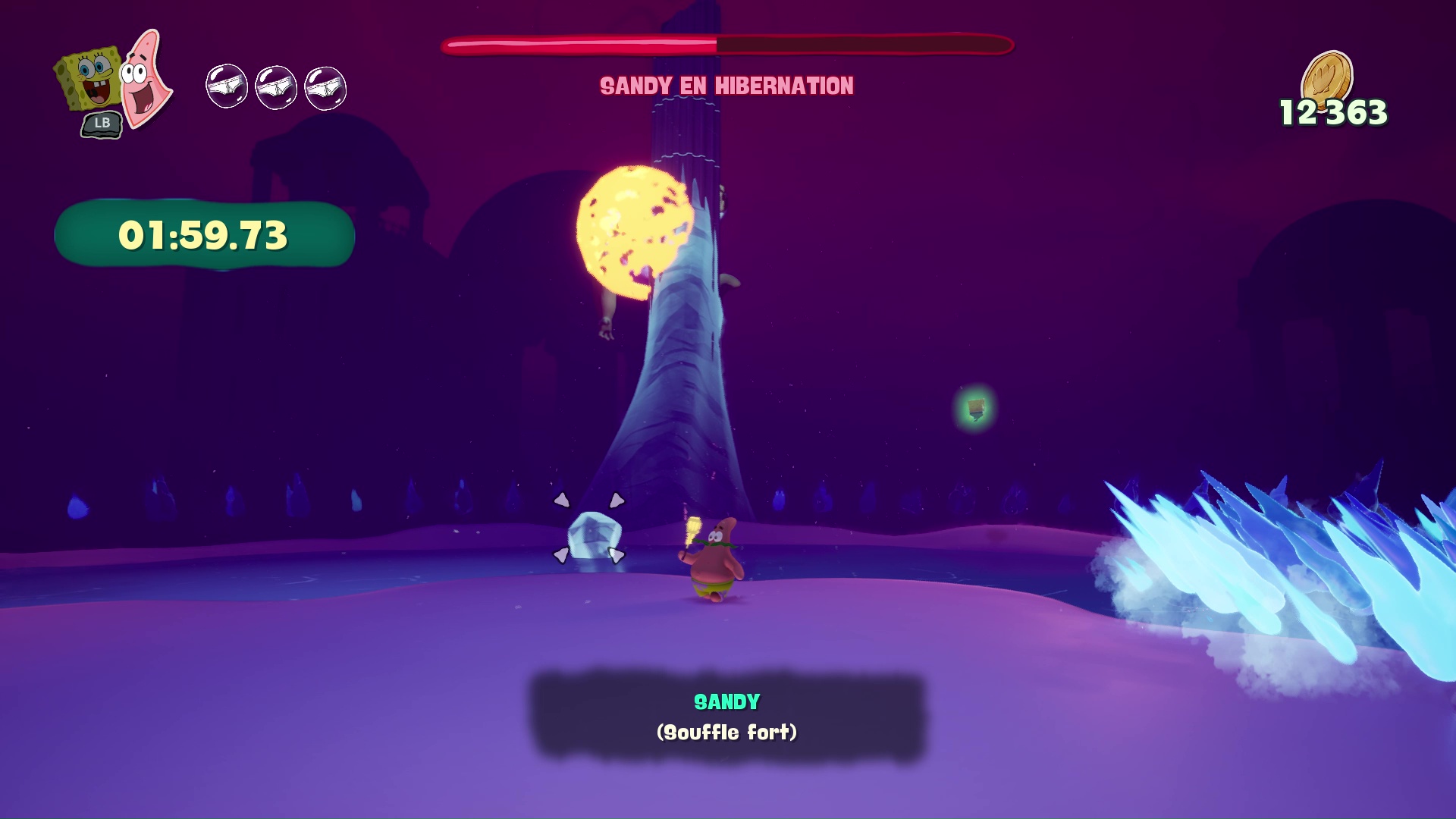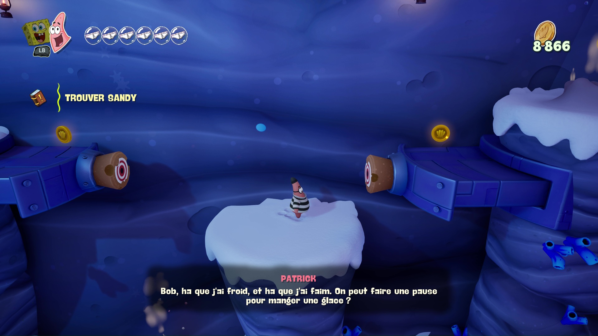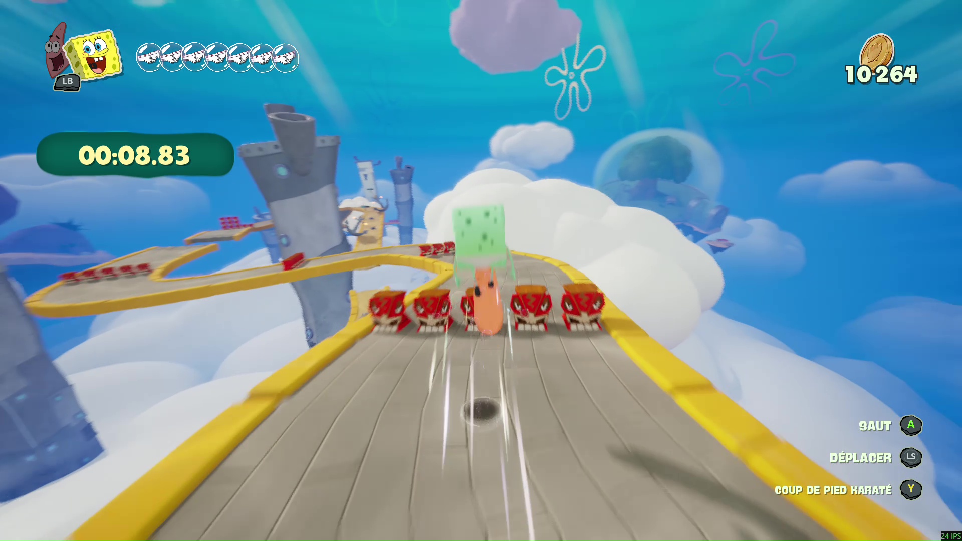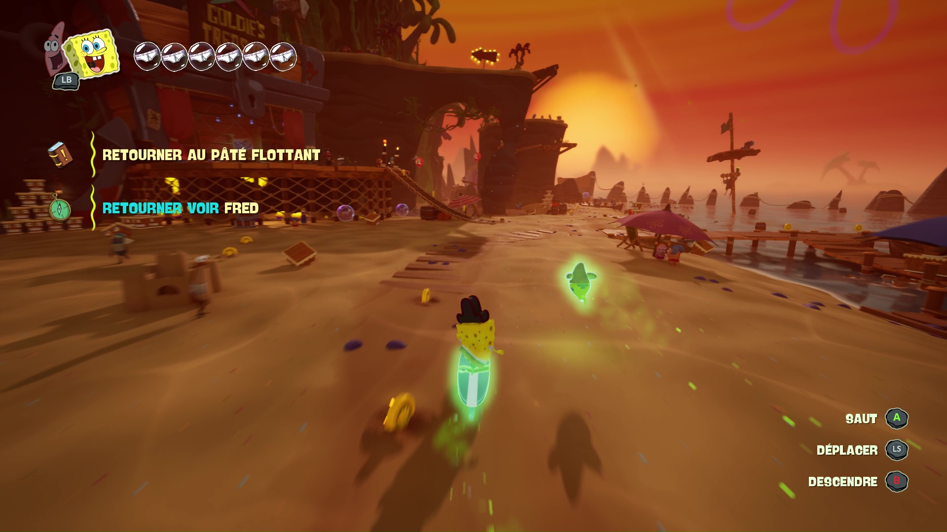 À bord de leur machine volante, nos meilleurs amis découvrent que leur bague des meilleurs amis pour la vie leur permet d’échanger leur condition : ainsi, Bob redevient « vivant » et Patrick devient un fantôme. Cette mécanique, centrale dans Les Titans des Marées, sera maintes fois nécessaire afin de progresser, puisque les niveaux, assez classiques dans leur construction, nécessiteront parfois des mécaniques qui leur sont propres pour progresser, parfois même en pleine action ou en plein saut, demandant ainsi une certaine gymnastique et de bons réflexes aux plus jeunes d’entre nous. On regrettera tout de même que ce ne soit pas plus exploité pour donner du dynamisme dans certains passages.