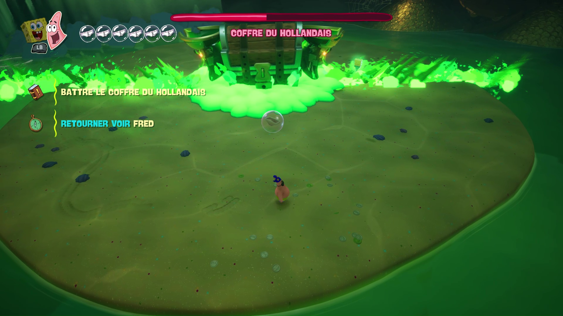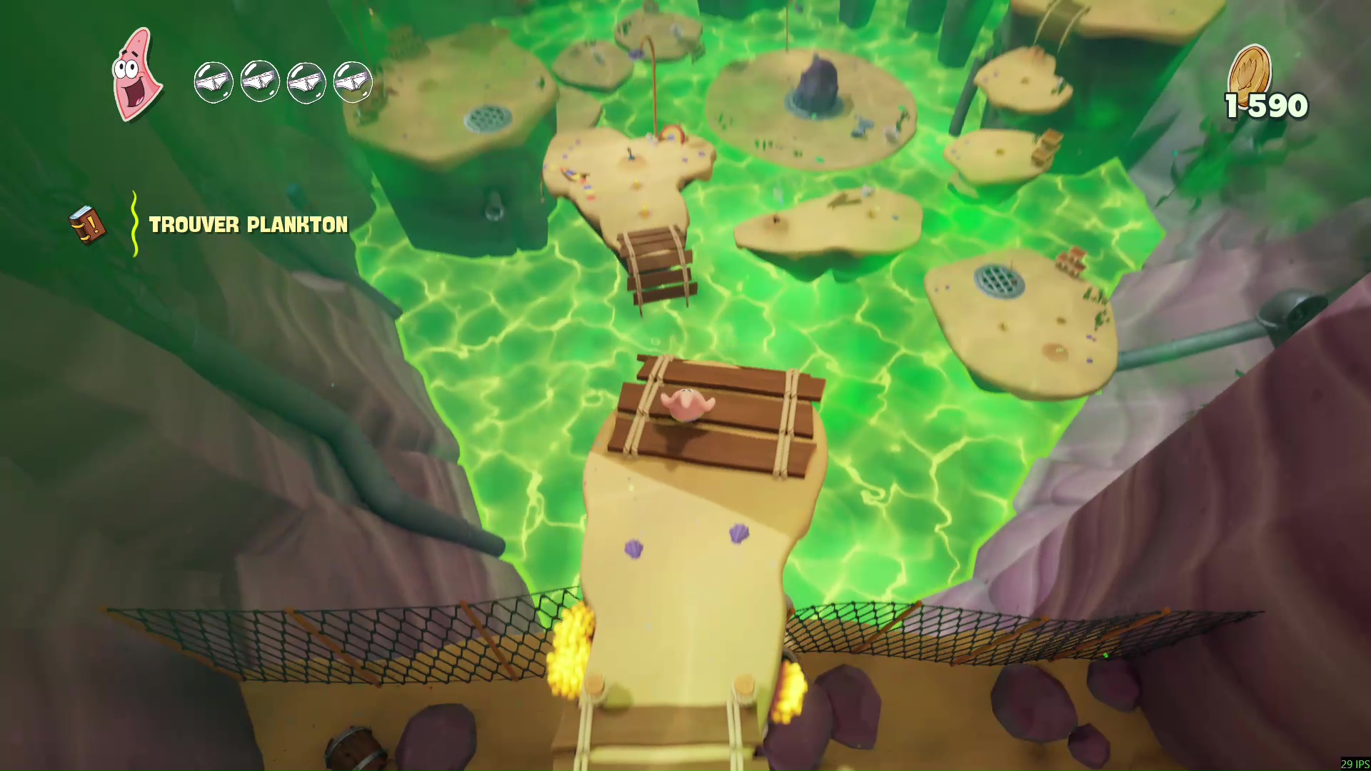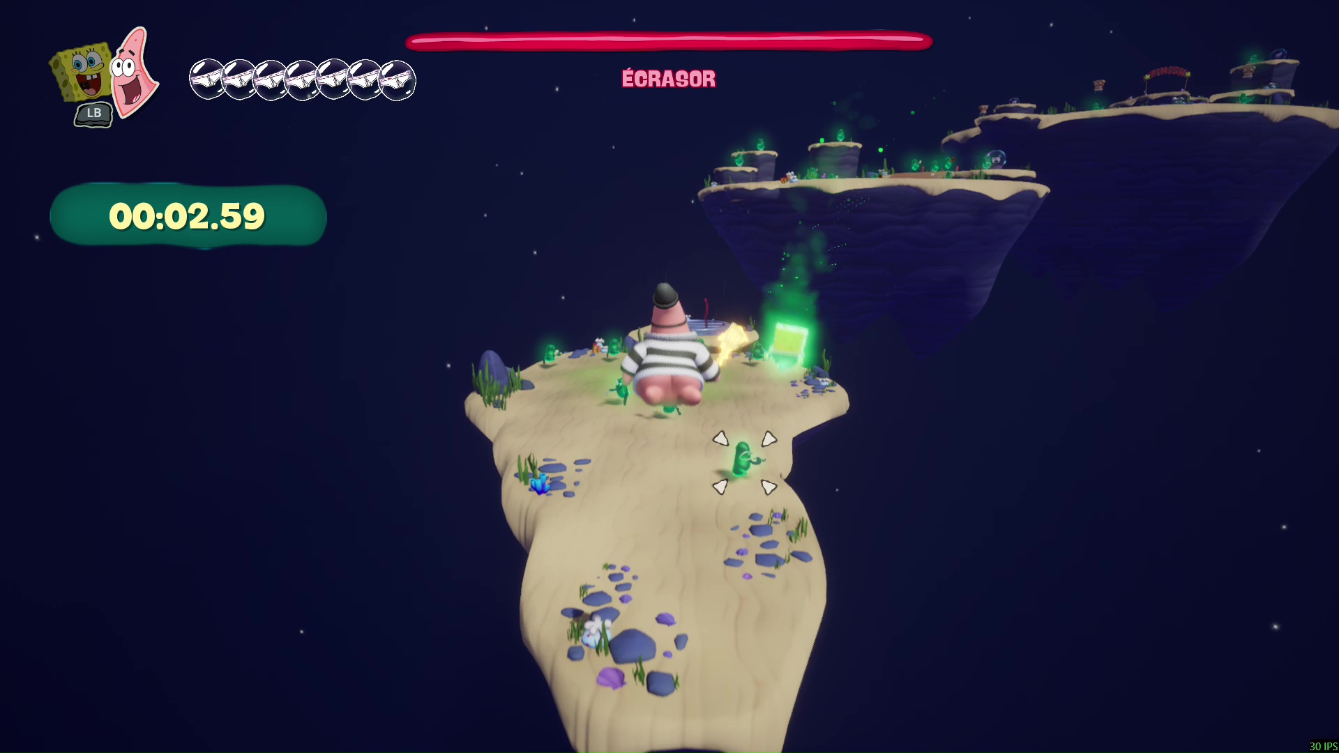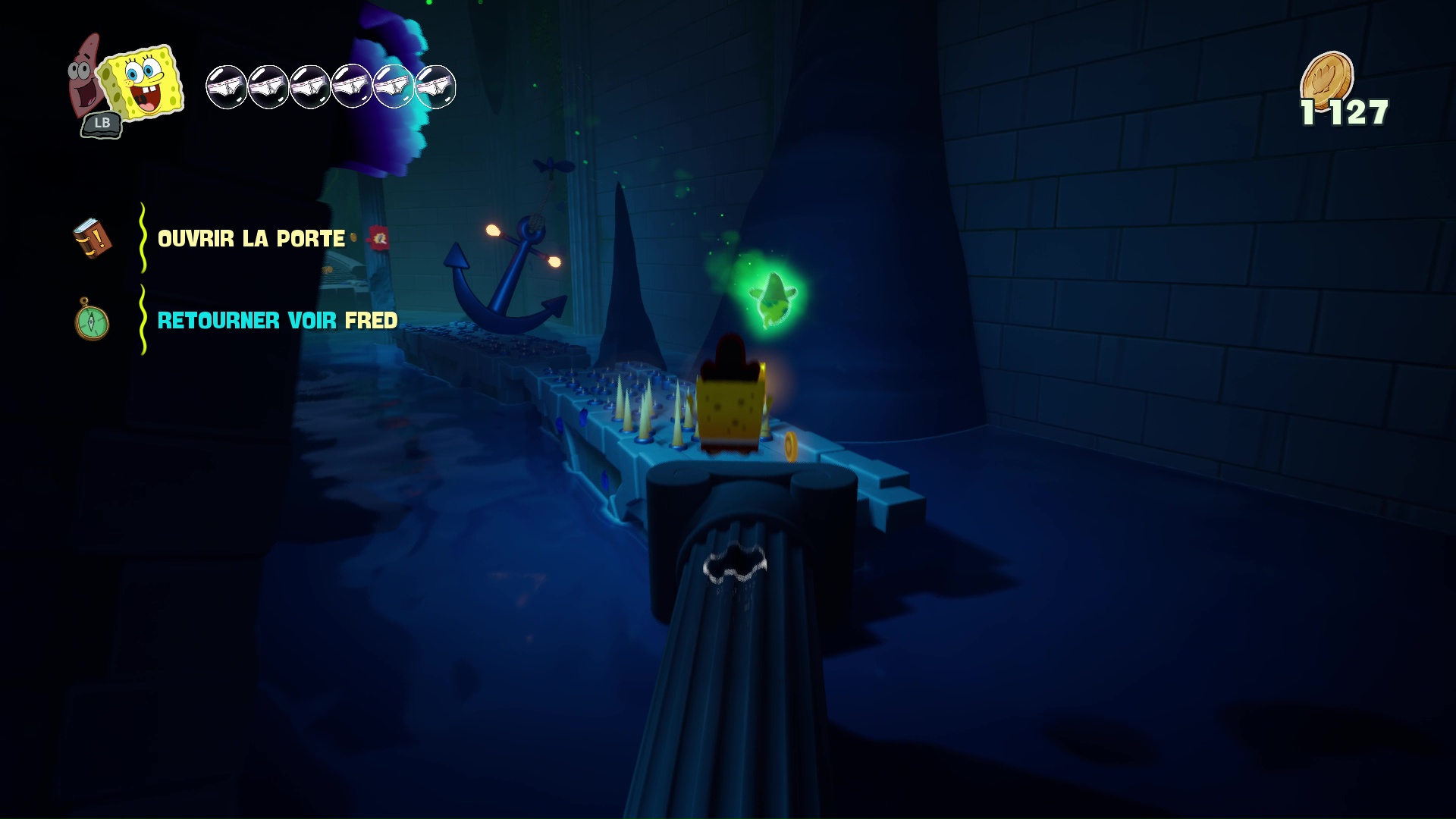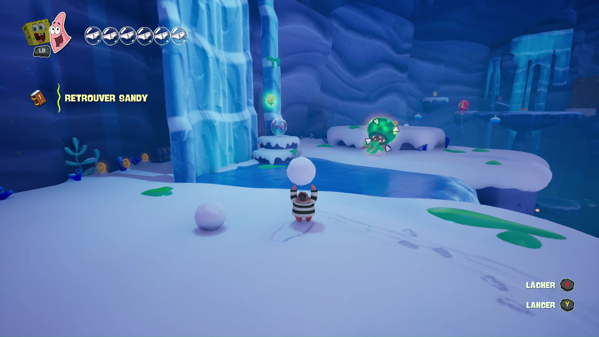 À bord de leur machine volante, nos meilleurs amis découvrent que leur bague des meilleurs amis pour la vie leur permet d’échanger leur condition : ainsi, Bob redevient « vivant » et Patrick devient un fantôme. Cette mécanique, centrale dans Les Titans des Marées, sera maintes fois nécessaire afin de progresser, puisque les niveaux, assez classiques dans leur construction, nécessiteront parfois des mécaniques qui leur sont propres pour progresser, parfois même en pleine action ou en plein saut, demandant ainsi une certaine gymnastique et de bons réflexes aux plus jeunes d’entre nous. On regrettera tout de même que ce ne soit pas plus exploité pour donner du dynamisme dans certains passages.