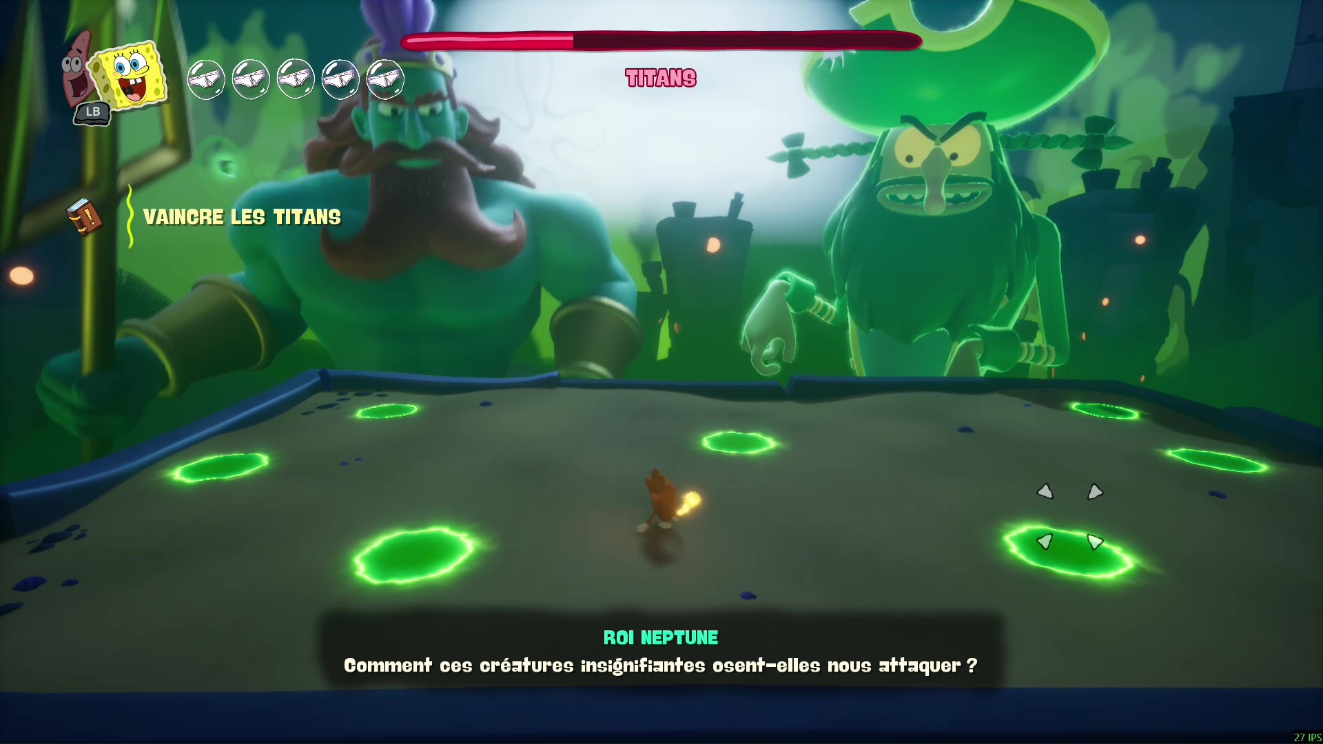 Les aventures des jeux Bob l’Éponge ont toujours été très légères au niveau du scénario, avec des situations souvent rocambolesques pour justifier des boucles de gameplay adaptées à tout âge. Sans toutefois trop s’affranchir de ce carcan du jeu pour enfants qui lui colle à la peau, Les Titans des Marées propose sans aucun doute l’épopée la plus aboutie scénaristiquement parlant, avec de belles trouvailles et un travail certain sur la mise en scène.