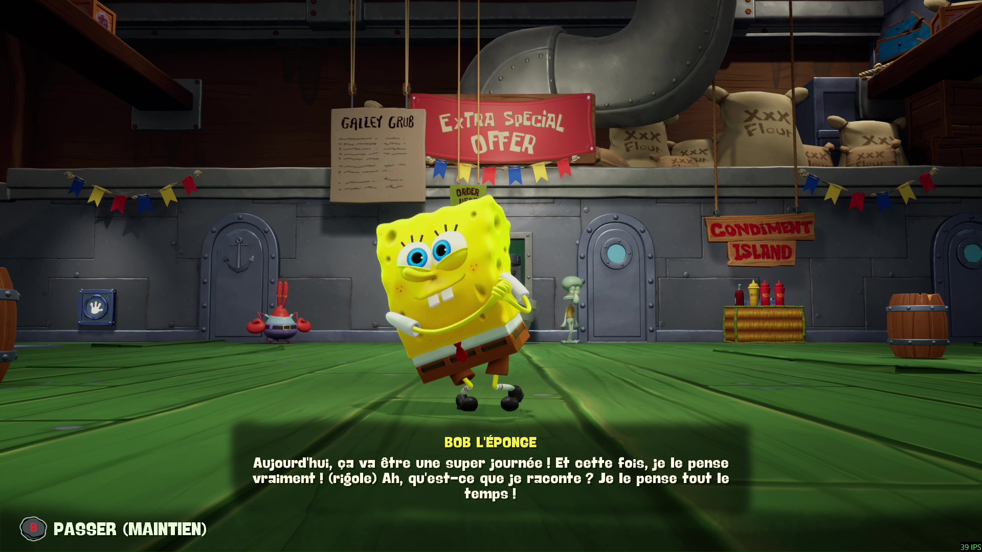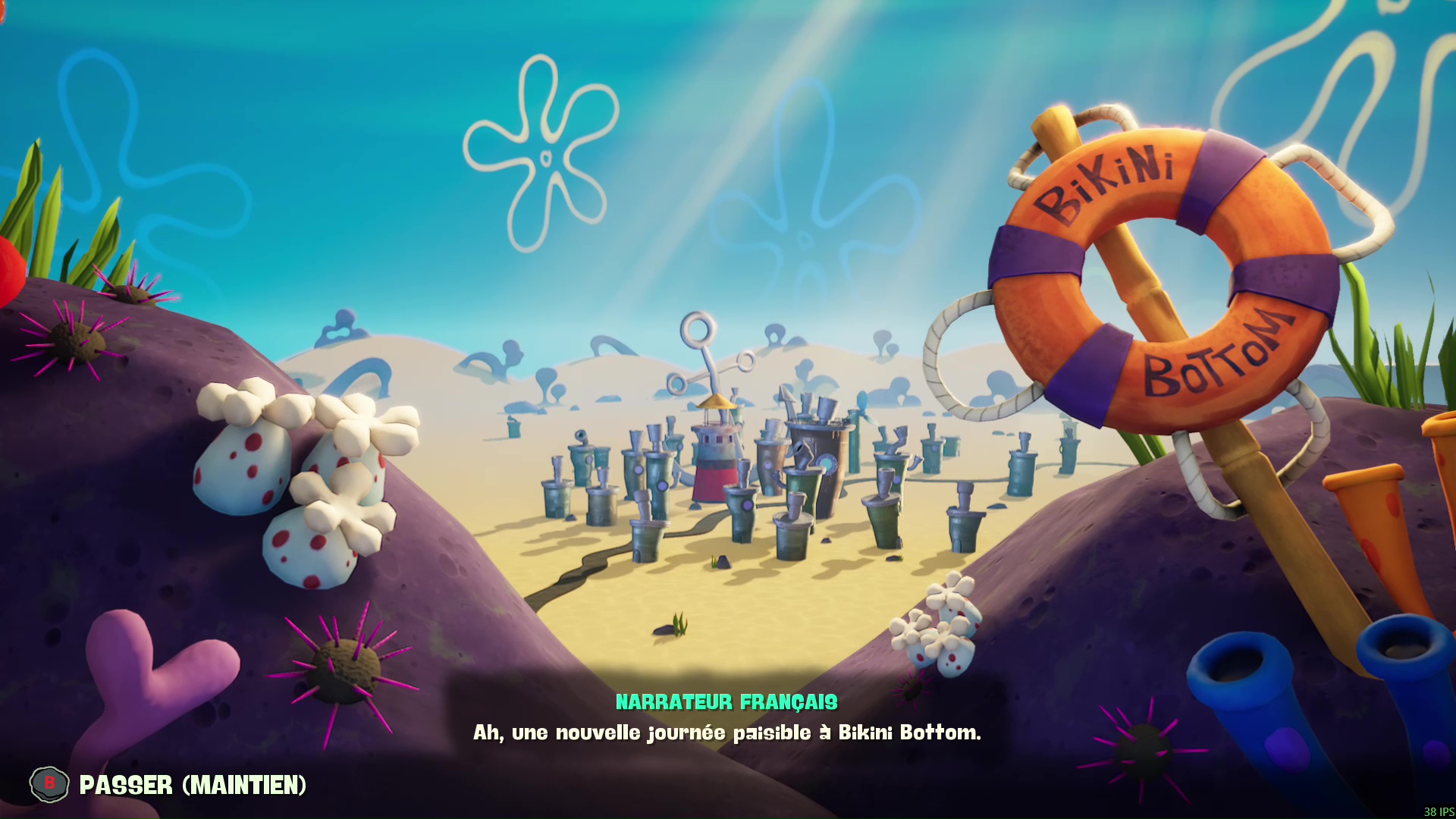 Côté technique enfin, Bob l’Éponge : Les Titans des Marées se positionne comme le plus abouti des jeux de la franchise visuellement et artistiquement, avec une multitude de tableaux colorés, détaillés et bien animés, tout comme les personnages qui répondent parfaitement aux visuels actuels du dessin animé. Sur notre PC, le jeu tournait en qualité épique et nous n’avons rencontré que très peu de bugs malgré des environnements assez riches et des chargements instantanés dans certains niveaux (nous vous laissons le plaisir de la découverte de ces séquences). Sur ROG Xbox Ally X, le jeu tourne à merveille en qualité élevée, mais forcément la finesse des textures sera moindre que sur un PC fixe.