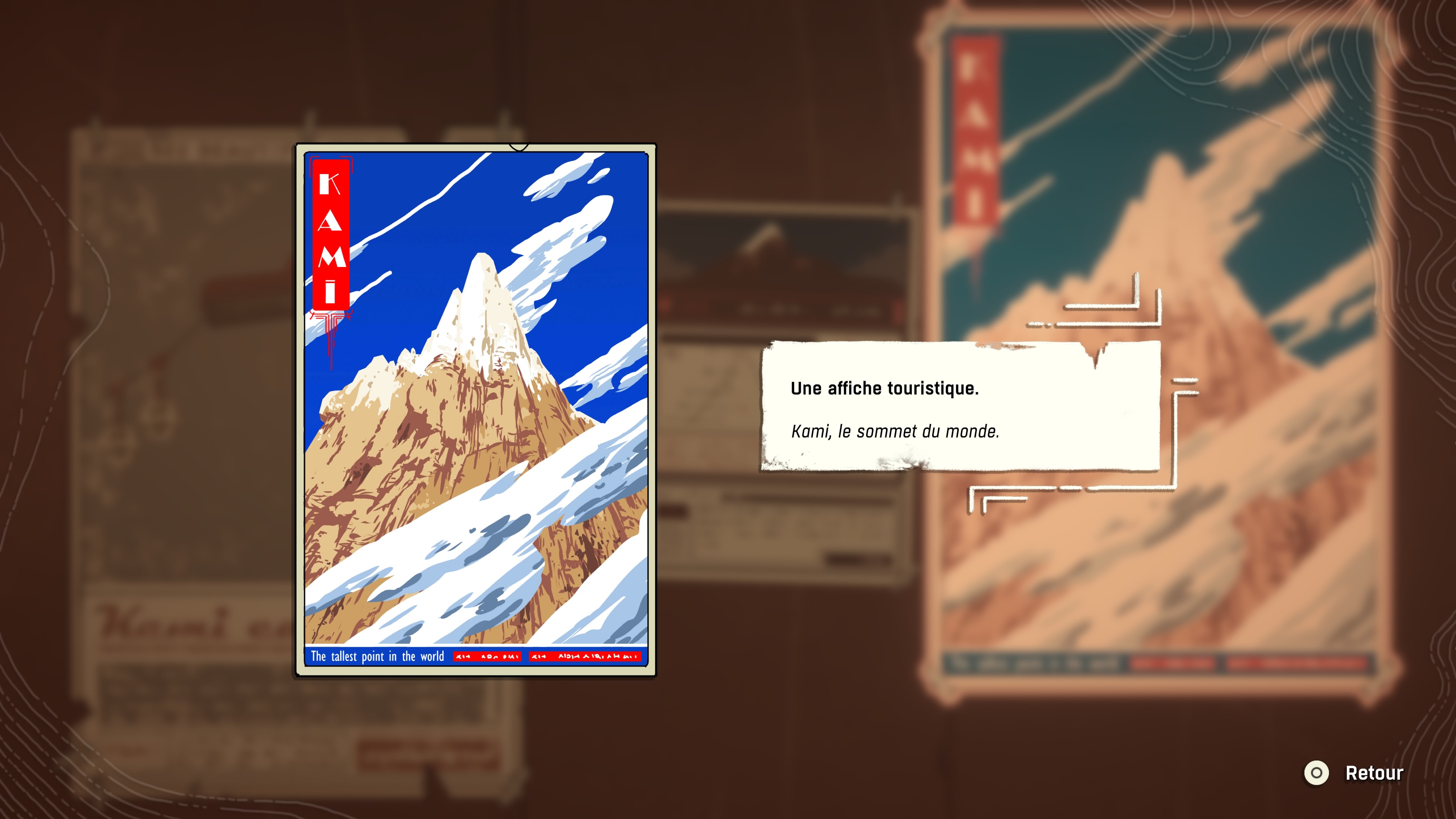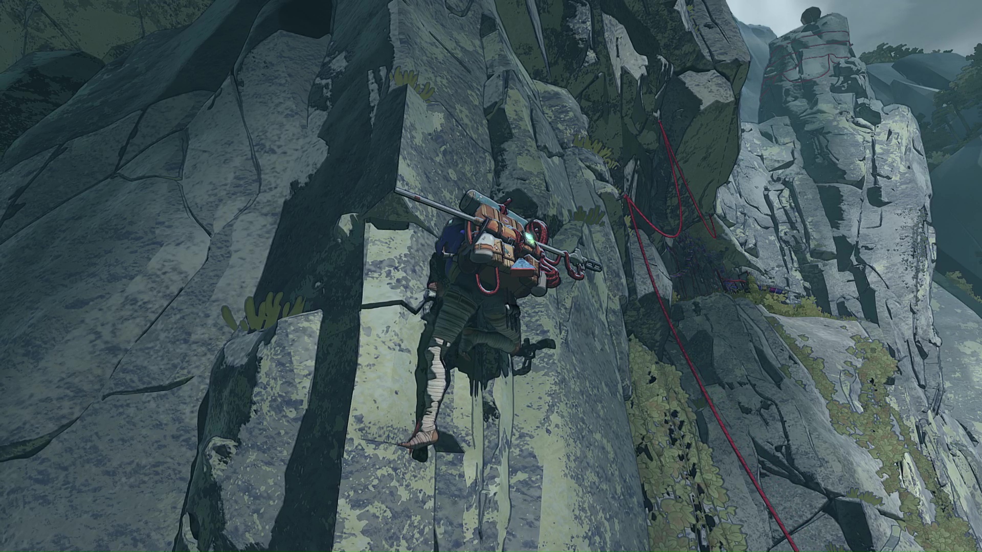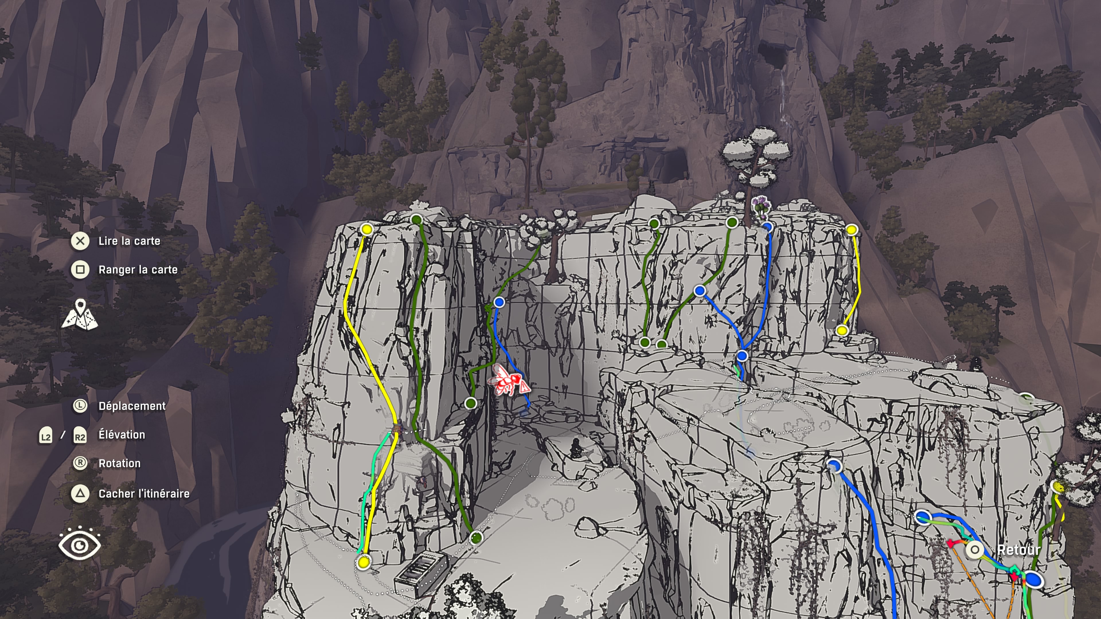 N’oublions pas non plus les aides diégétiques, puisqu’étant une montagne fréquentée, Kami a donné l’idée aux multiples grimpeurs et grimpeuses de réaliser des cartes, à récupérer à quelques endroits. Un coup de pouce très important afin de visualiser à tout moment les itinéraires plus ou moins costauds, représentés via un code couleur, et symbole concret d’une grande liberté d’approche. Attention, déjà ces cartes ne couvrent pas l’intégralité de Kami, et il a pu arriver que l’on ne comprenne pas toujours pourquoi un chemin était considéré comme facile, et inversement.