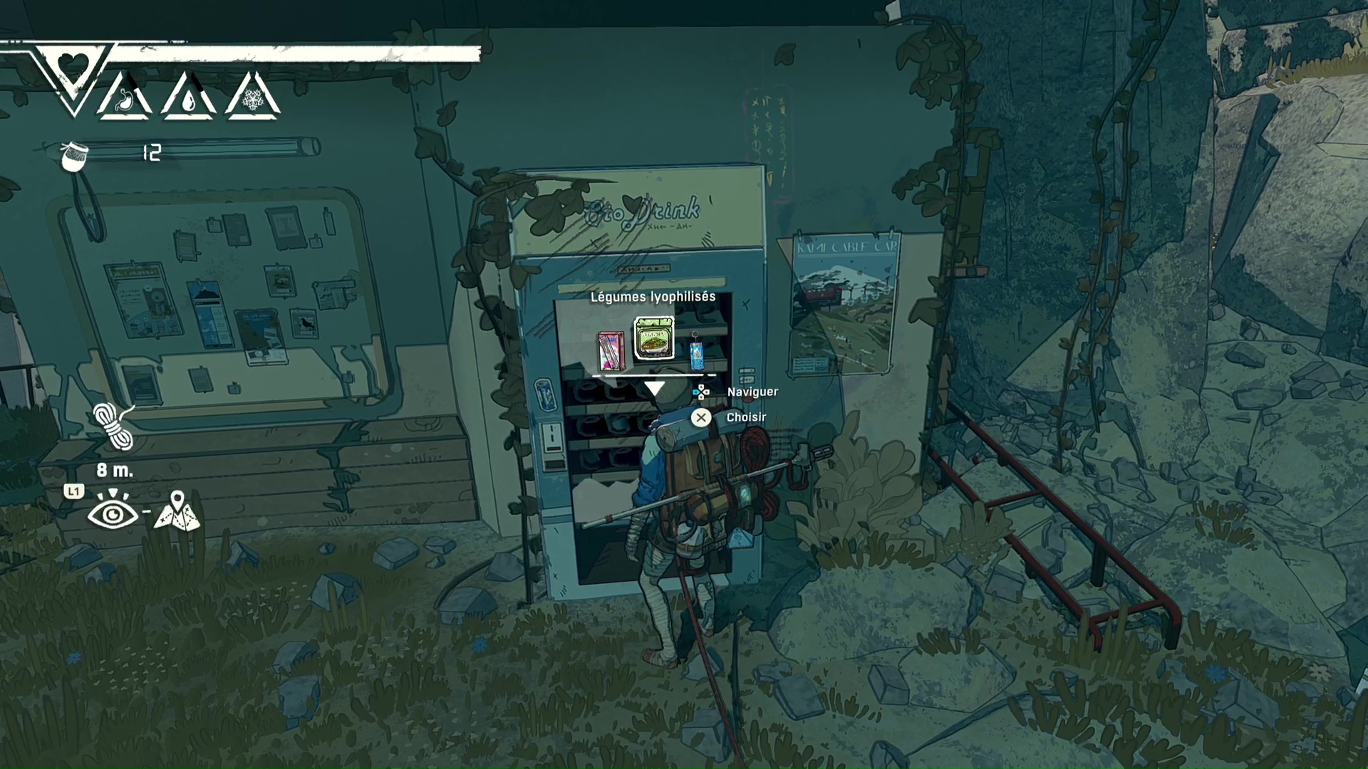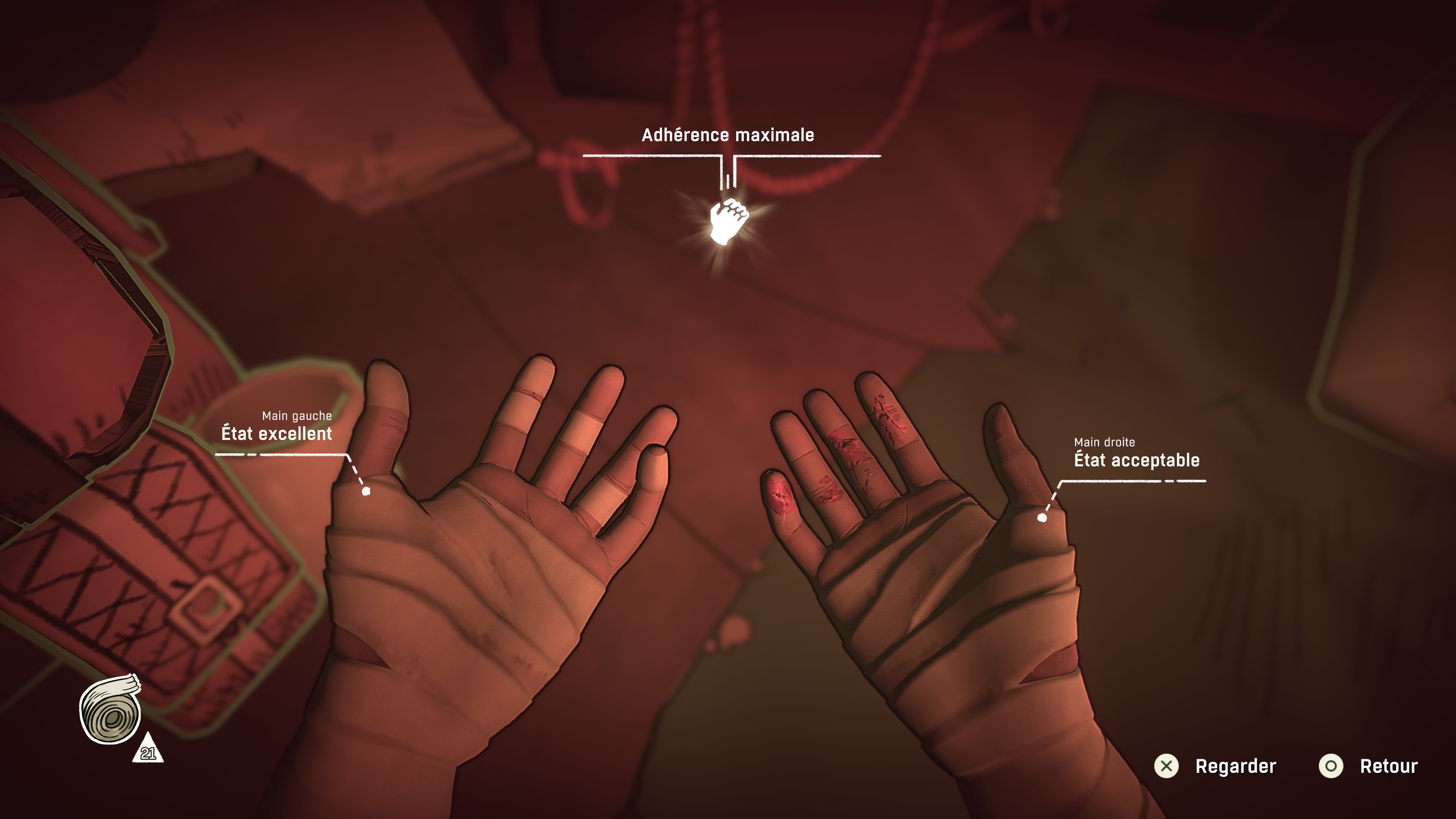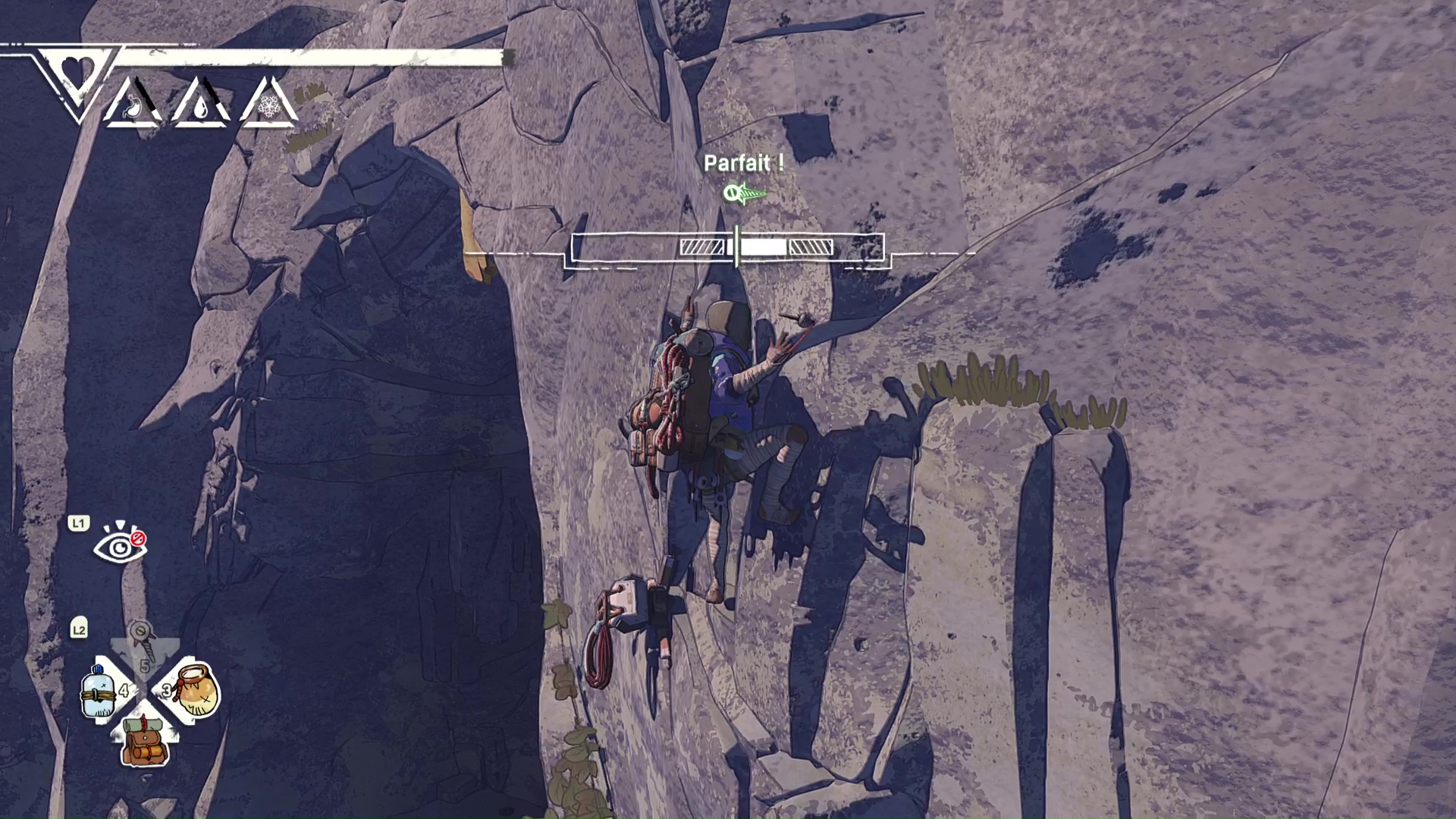 Au-delà du gameplay d’escalade pur, notre héroïne doit régulièrement bander ses doigts pour maintenir une bonne adhérence, boire, manger, se réchauffer, se soigner ou encore se reposer. Des besoins qui grandissent à chaque effort fourni et qu’il faut impérativement assouvir pour ne pas perdre le contrôle. On dispose dès le départ de provisions toutes prêtes, comme du chocolat, des barres nutritives ou bien des canettes de boisson énergisante, mais ensuite, il va falloir se débrouiller.