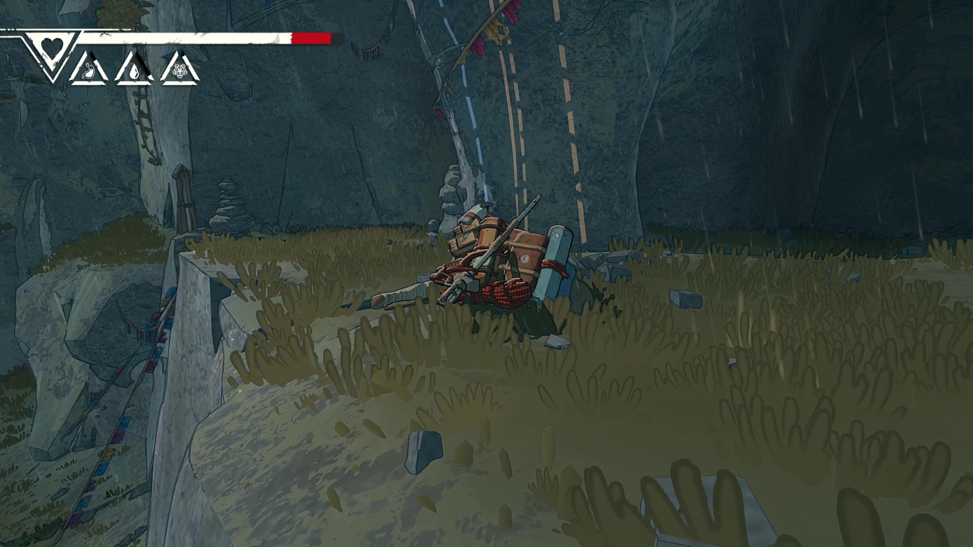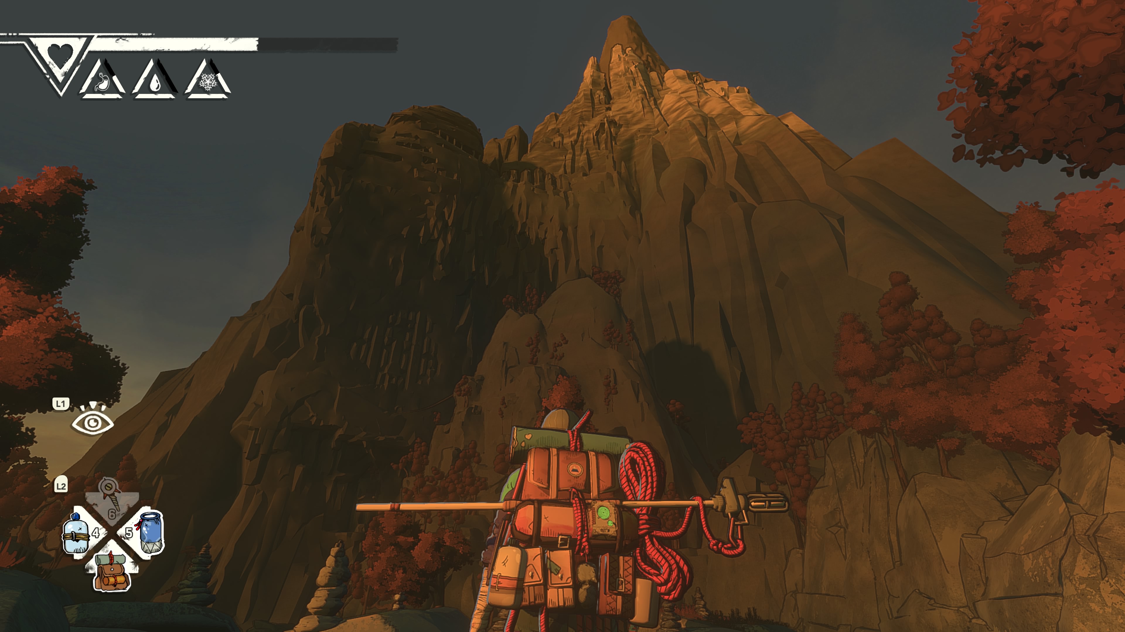 Bref, évoluer dans Cairn, c’est tout sauf une promenade de santé, et il faut être prêt à vivre cette expérience de « drop’n’retry » (ou die’n’retry dans le pire des cas) pour espérer arriver au bout de l’aventure. D’autant que l’on n’est toujours pas au bout de nos peines puisque la météo a aussi clairement ses effets sur l’adhérence, et d’autres paramètres viennent s’inviter à la gestion de Aava, en se regroupant au sein d’un système de survie.