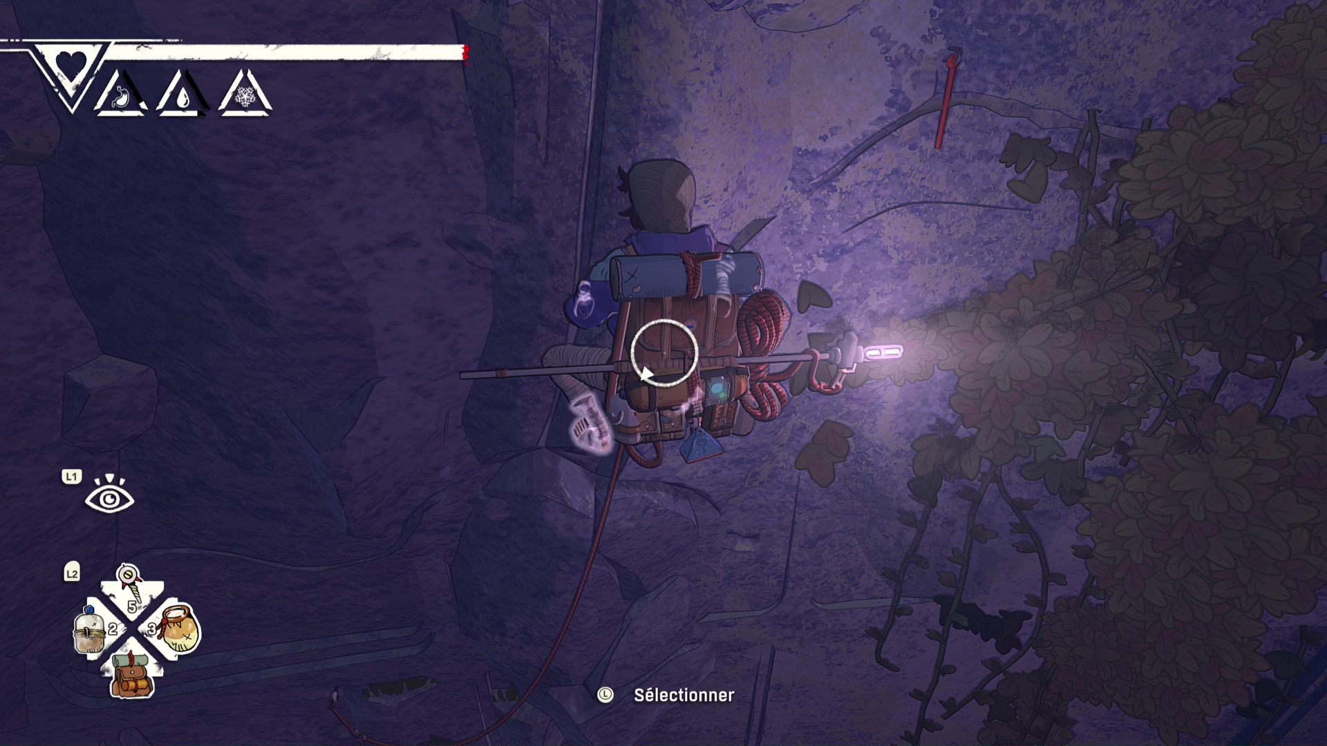 Heureusement, on peut compter sur des pitons, une ressource limitée mais réutilisable jusqu’à un certain point. Destinés à marquer une pause en toute sécurité au milieu d’une ascension ou à permettre une descente en rappel, ils s’avèrent cruciaux dès les premières minutes de jeu. Une sorte de checkpoint qu’il faut en plus de cela fixer à un emplacement judicieux. Car en cas de chute, le balancier a des chances de nous heurter à la paroi, causant des dégâts allant jusqu’à la perte de connaissance, voire la mort.