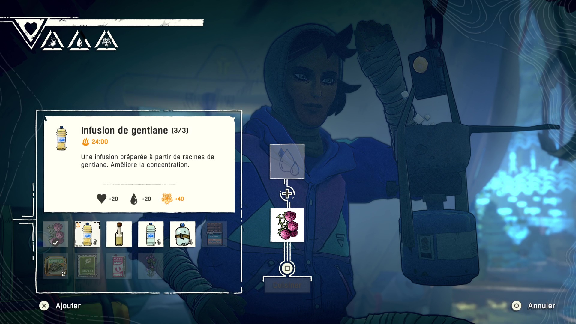 En effet, à chaque point de sauvegarde manuelle, Aava est capable de déployer son bivouac. Véritable cocon dans cet environnement souvent hostile, le bivouac dispose d’un réchaud, et là, on se fait plaisir à enfiler le tablier. D’un simple bol de pissenlit cuit à un riz au lait ou même à la préparation d’un ti-punch (oui oui), les possibilités de recette sont très nombreuses, et les bienfaits qu’elles portent, avec.